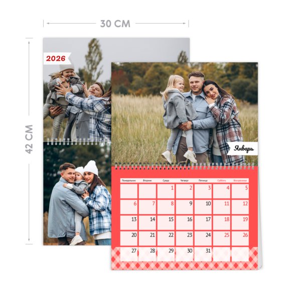 Печать настенного перекидного одностороннего календаря формата A3 на 2026 год с загрузкой фотографий и согласованием перед печатью