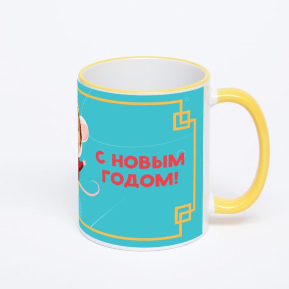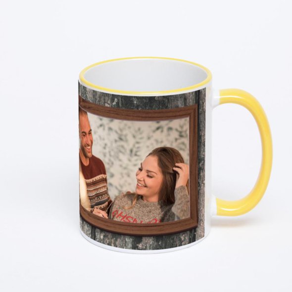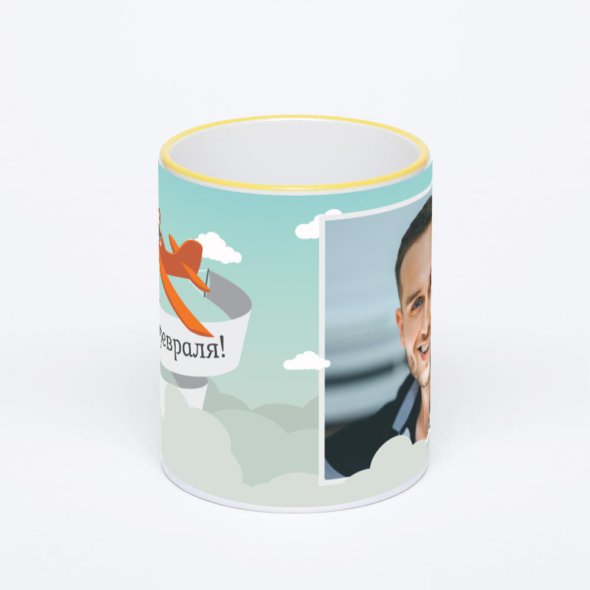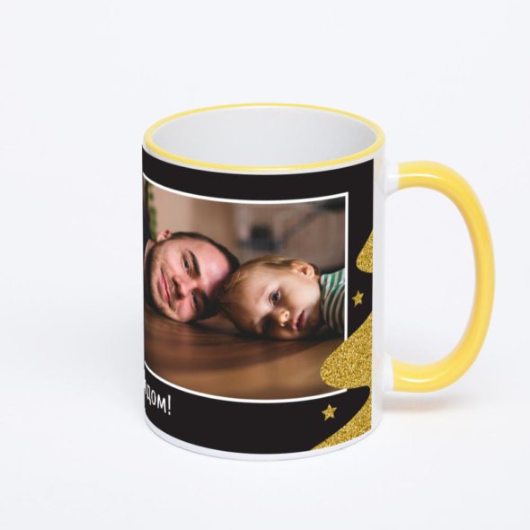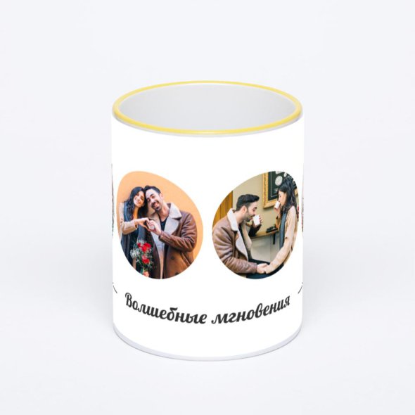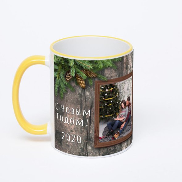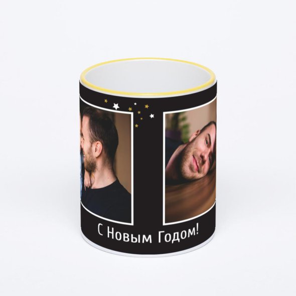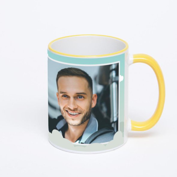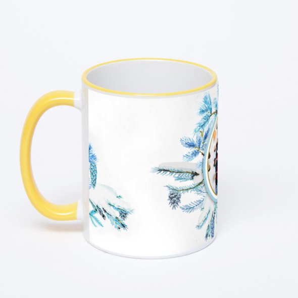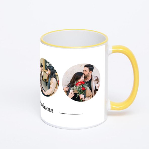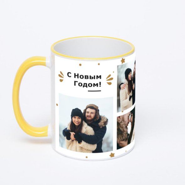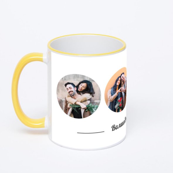 Керамическая кружка с желтой ручкой и ободком с нанесением изображения. Кружка с вашим изображением – это уникальный и качественный подарок. Создать её вы можете прямо сейчас в редакторе, добавляя фотографии, стикеры и надписи.
