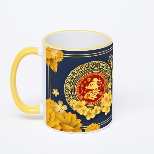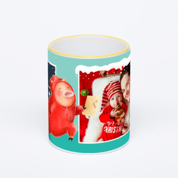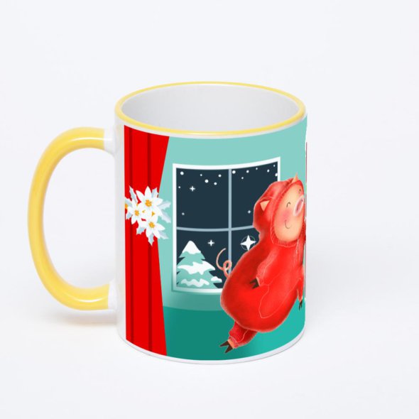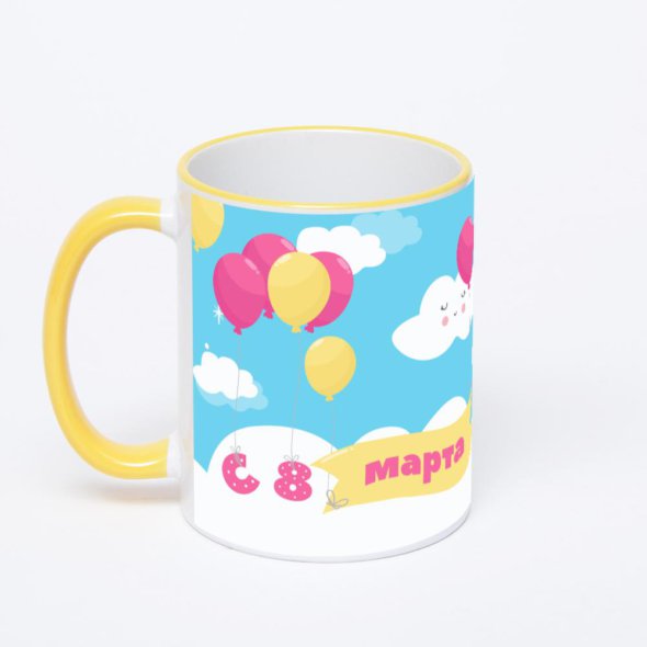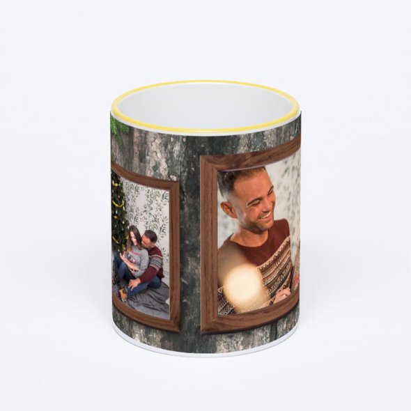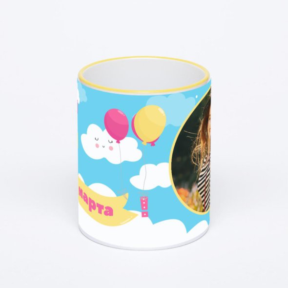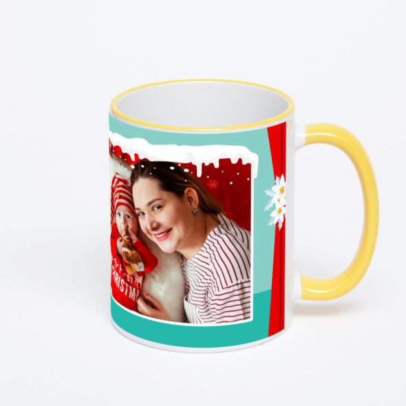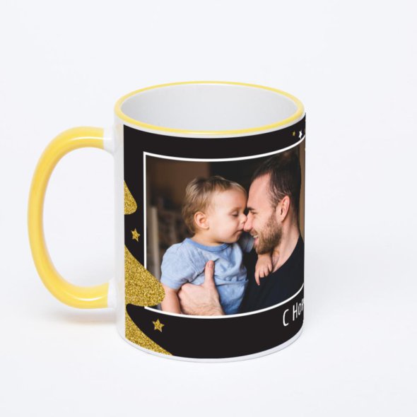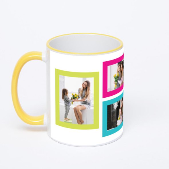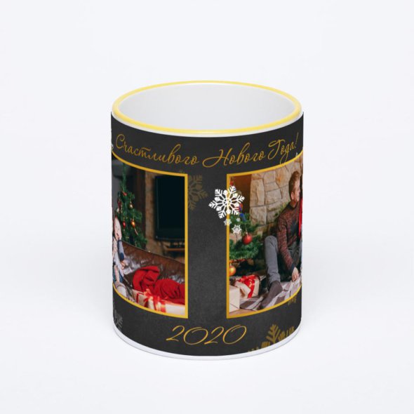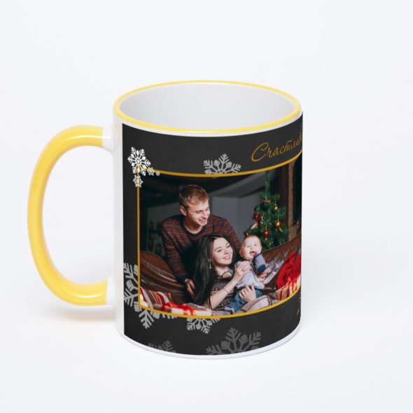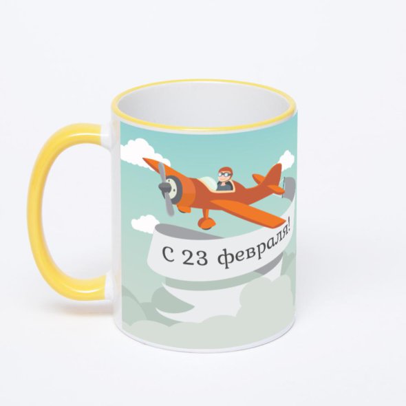 Керамическая кружка с желтой ручкой и ободком с нанесением изображения. Кружка с вашим изображением – это уникальный и качественный подарок. Создать её вы можете прямо сейчас в редакторе, добавляя фотографии, стикеры и надписи.