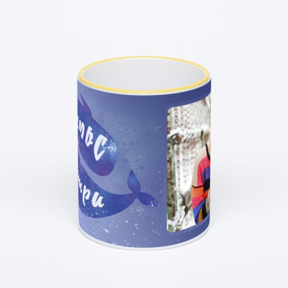 Керамическая кружка с желтой ручкой и ободком с нанесением изображения. Кружка с вашим изображением – это уникальный и качественный подарок. Создать её вы можете прямо сейчас в редакторе, добавляя фотографии, стикеры и надписи.