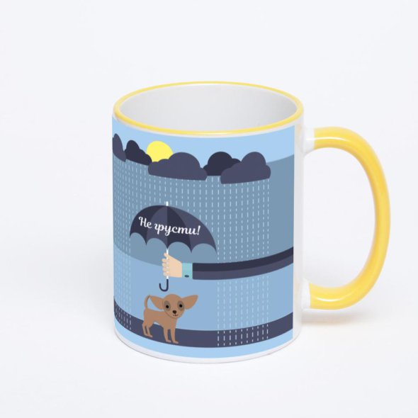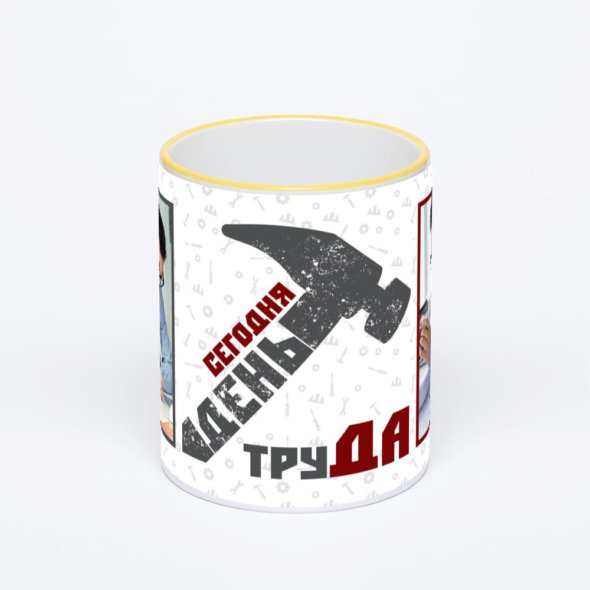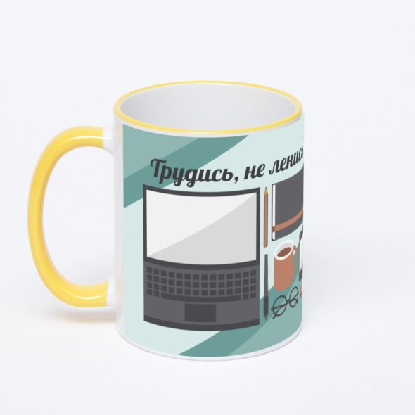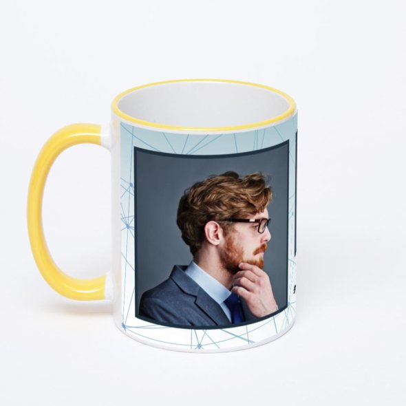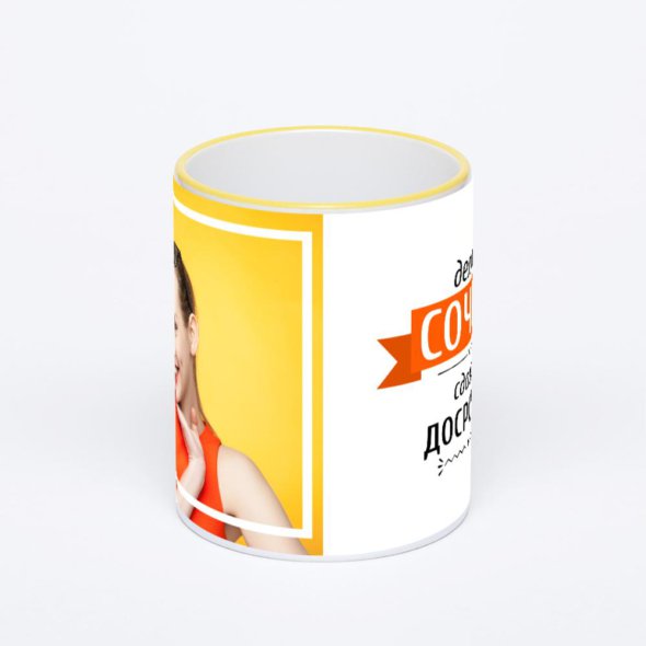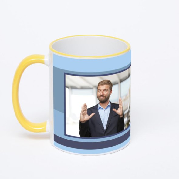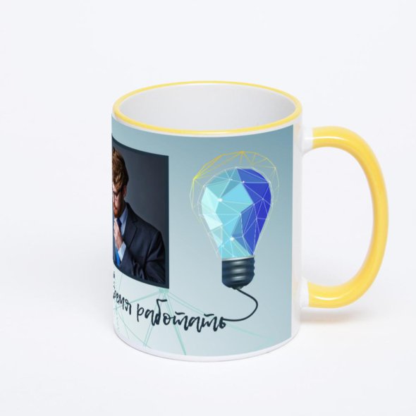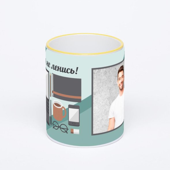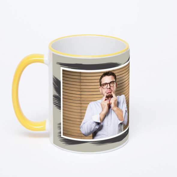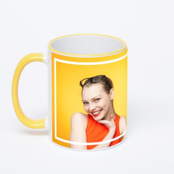 Керамическая кружка с желтой ручкой и ободком с нанесением изображения. Кружка с вашим изображением – это уникальный и качественный подарок. Создать её вы можете прямо сейчас в редакторе, добавляя фотографии, стикеры и надписи.