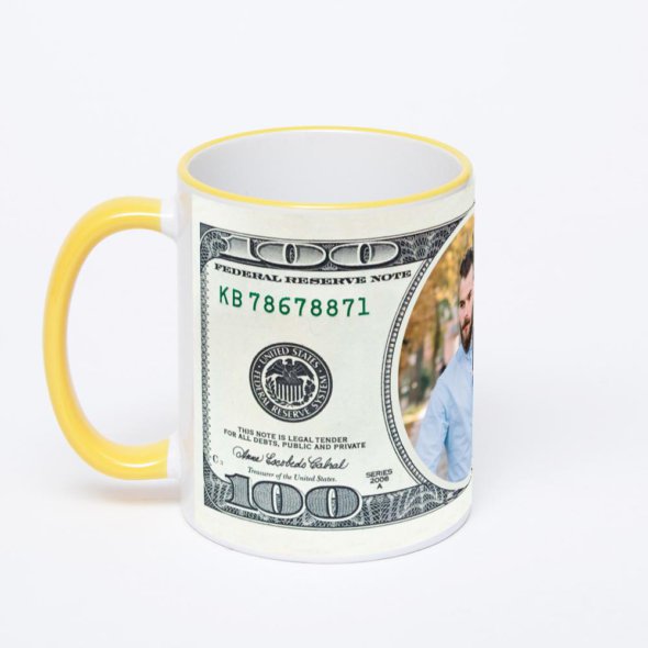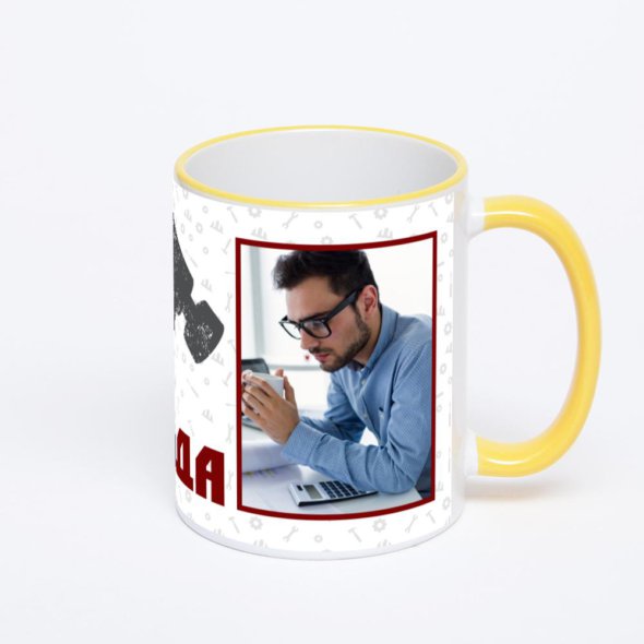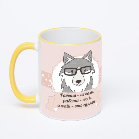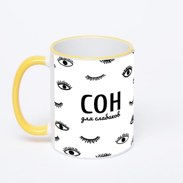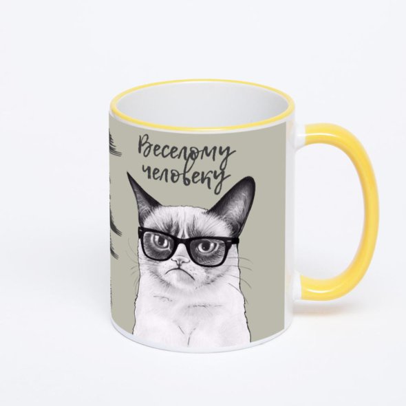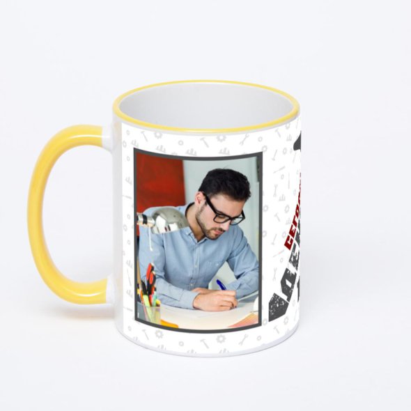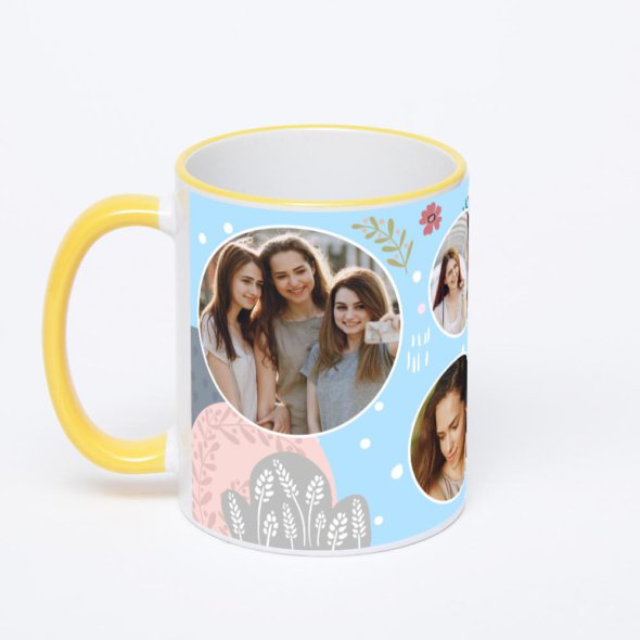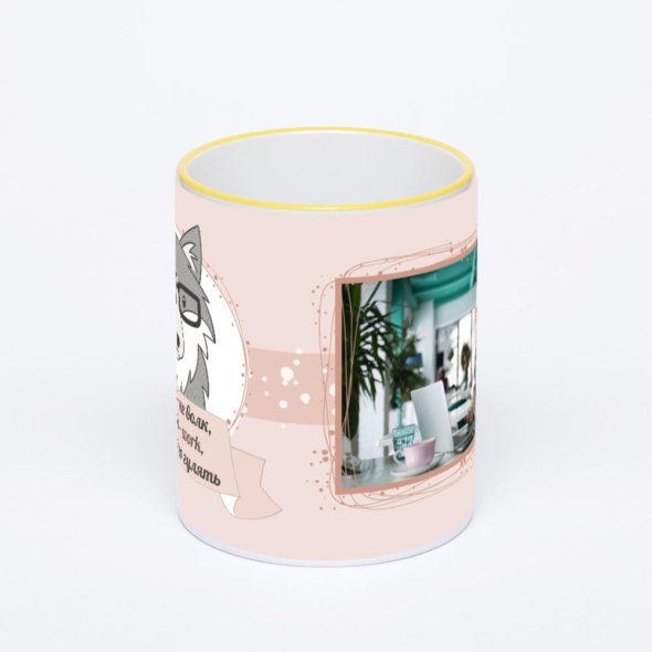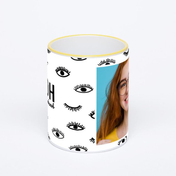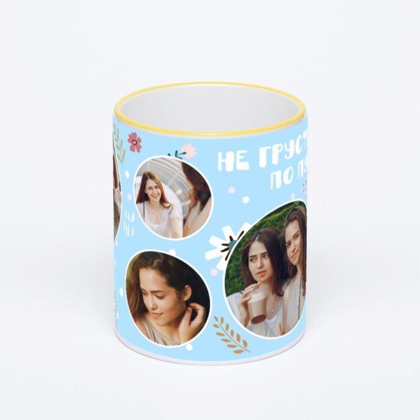 Керамическая кружка с желтой ручкой и ободком с нанесением изображения. Кружка с вашим изображением – это уникальный и качественный подарок. Создать её вы можете прямо сейчас в редакторе, добавляя фотографии, стикеры и надписи.