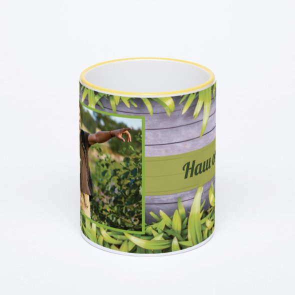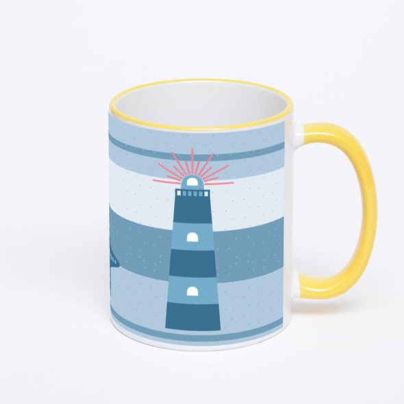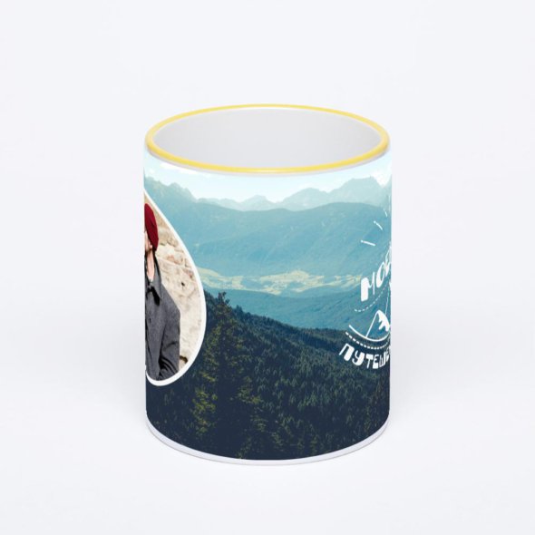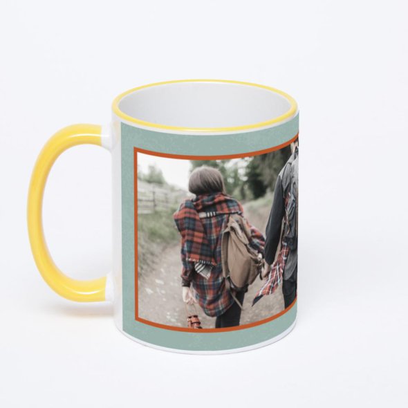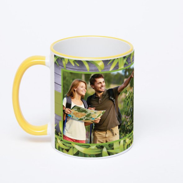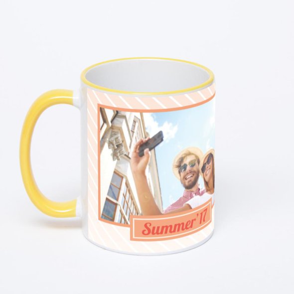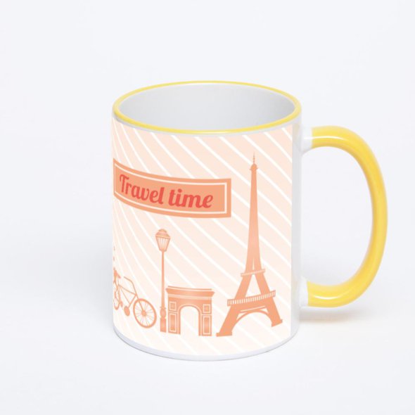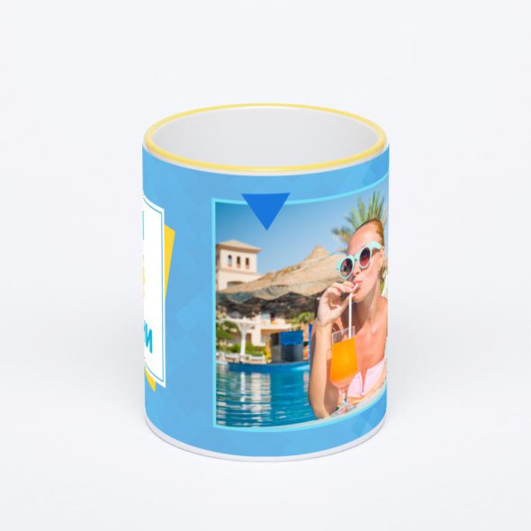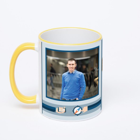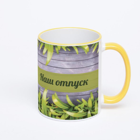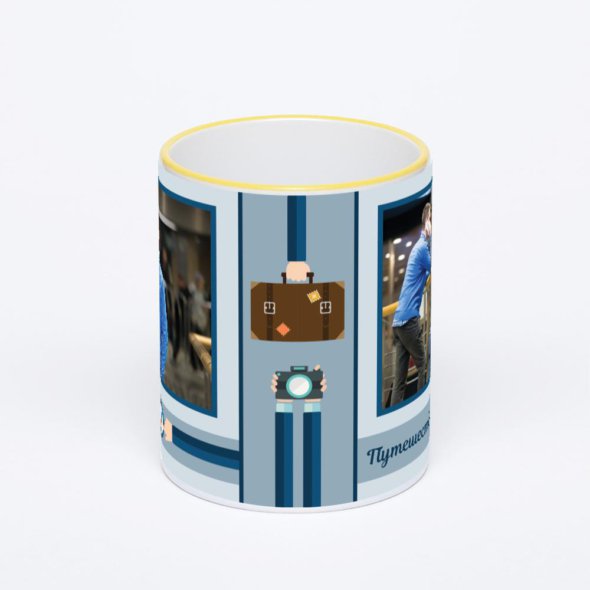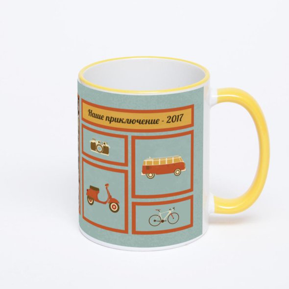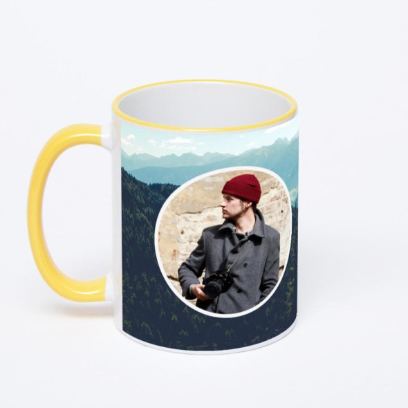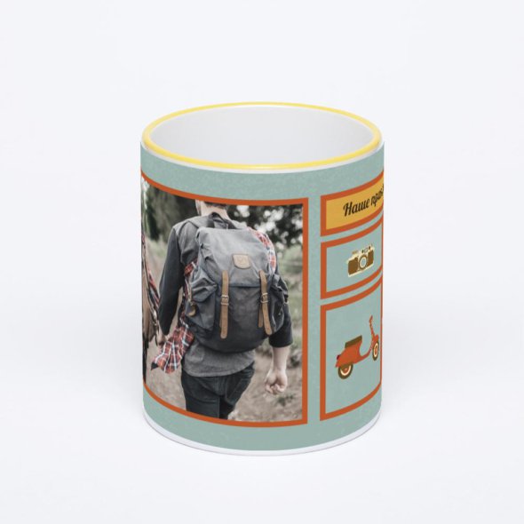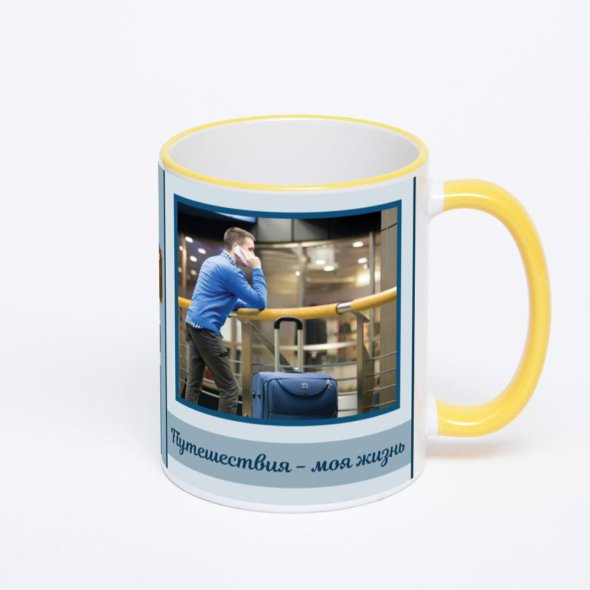 Керамическая кружка с желтой ручкой и ободком с нанесением изображения. Кружка с вашим изображением – это уникальный и качественный подарок. Создать её вы можете прямо сейчас в редакторе, добавляя фотографии, стикеры и надписи.