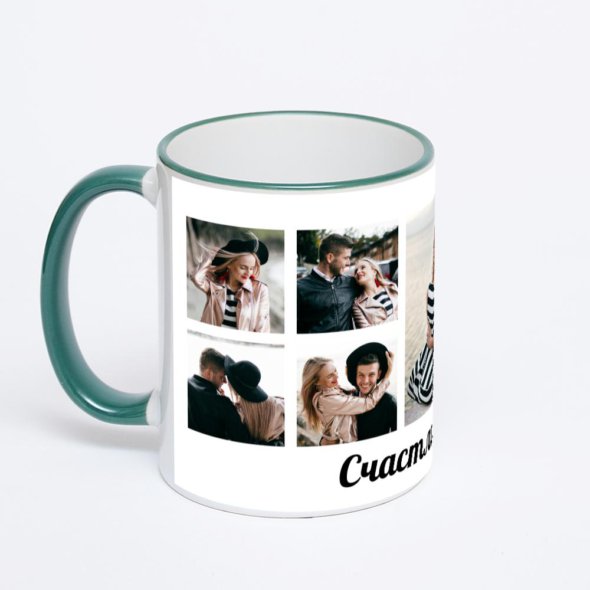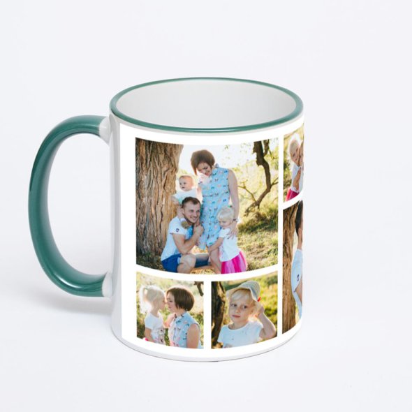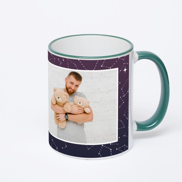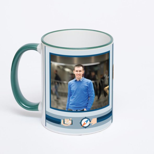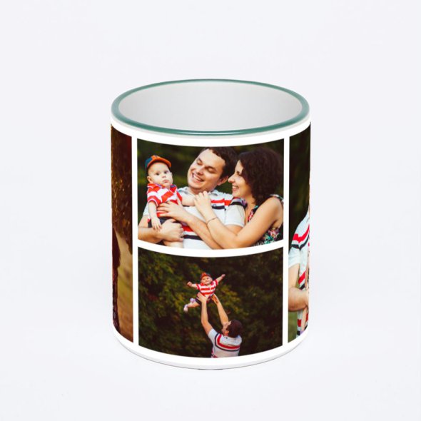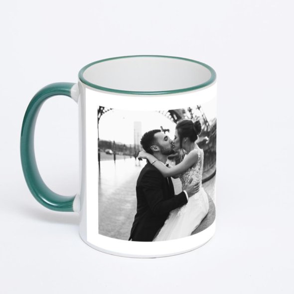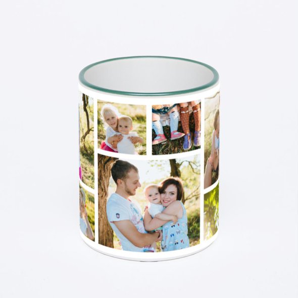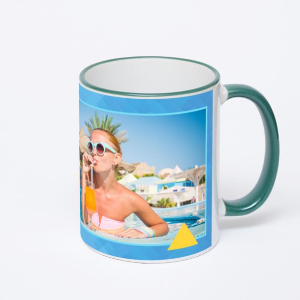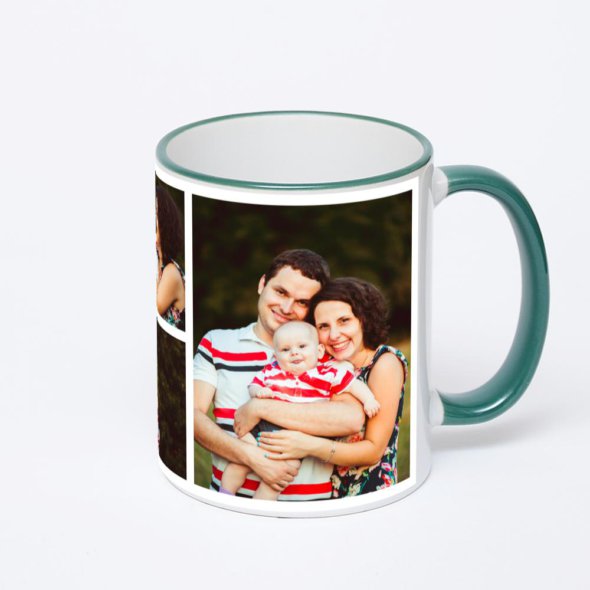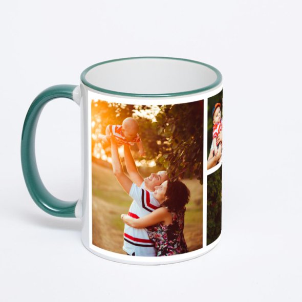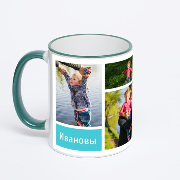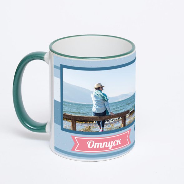 Керамическая кружка с зеленой ручкой и ободком с нанесением изображения. Кружка с вашим изображением – это уникальный и качественный подарок. Создать её вы можете прямо сейчас в редакторе, добавляя фотографии, стикеры и надписи.