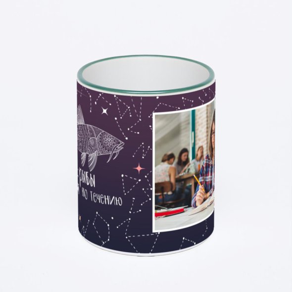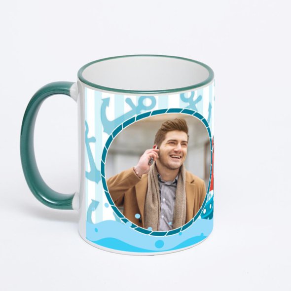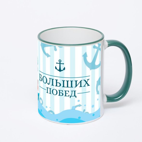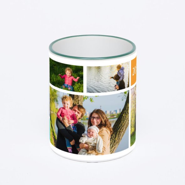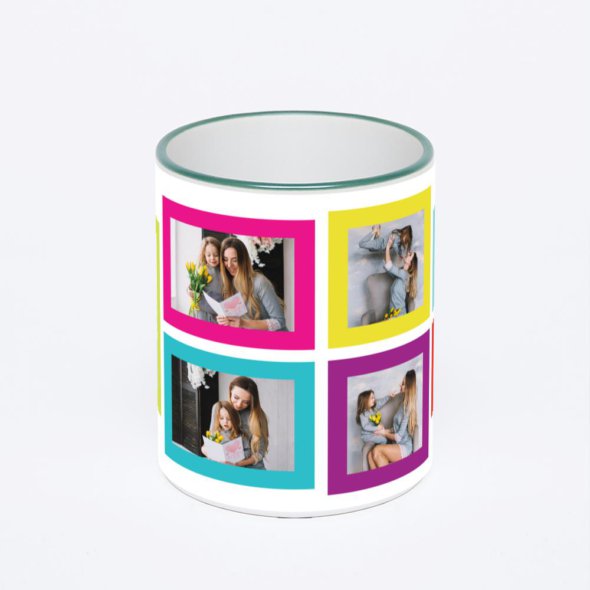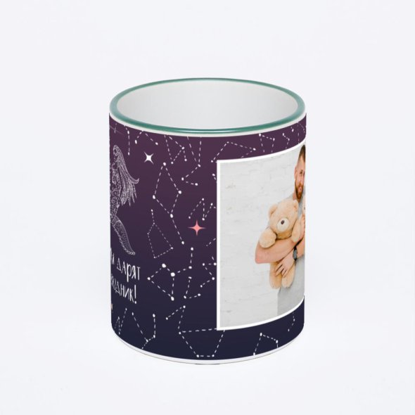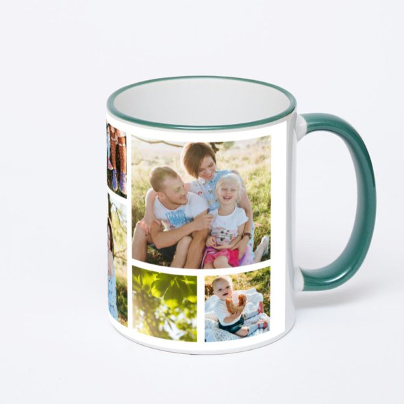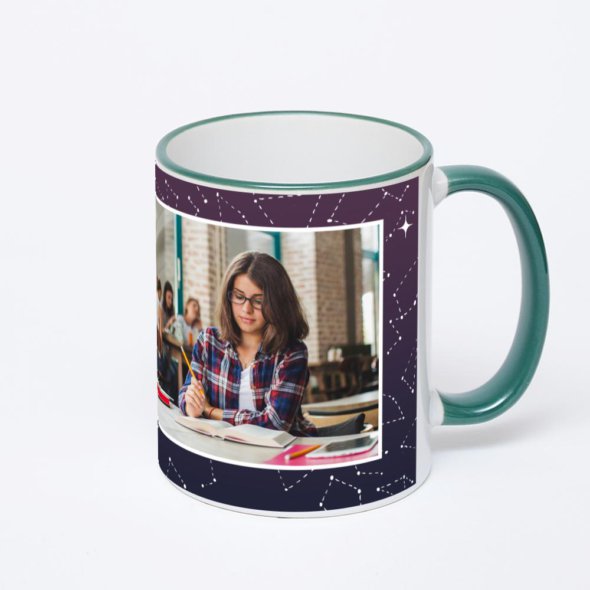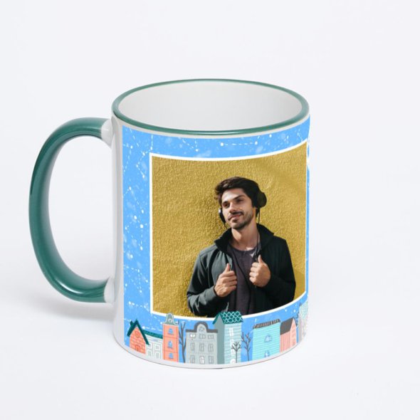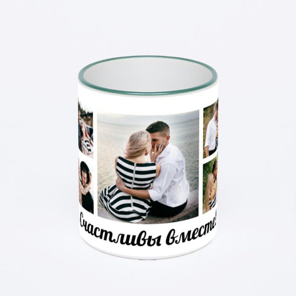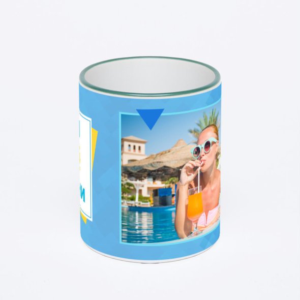 Керамическая кружка с зеленой ручкой и ободком с нанесением изображения. Кружка с вашим изображением – это уникальный и качественный подарок. Создать её вы можете прямо сейчас в редакторе, добавляя фотографии, стикеры и надписи.