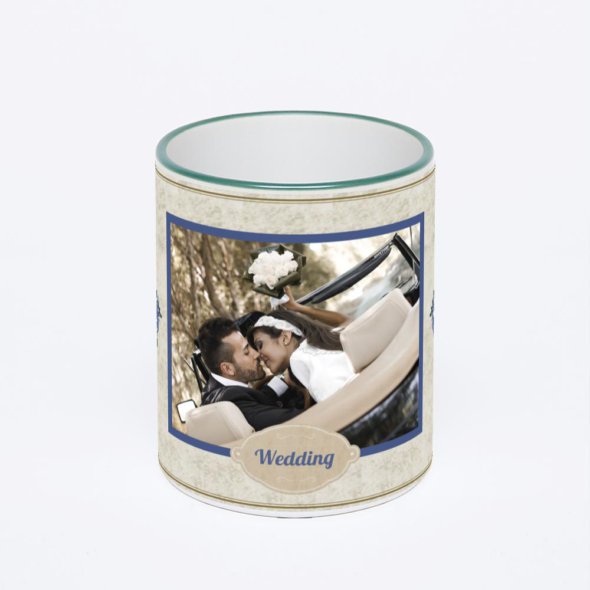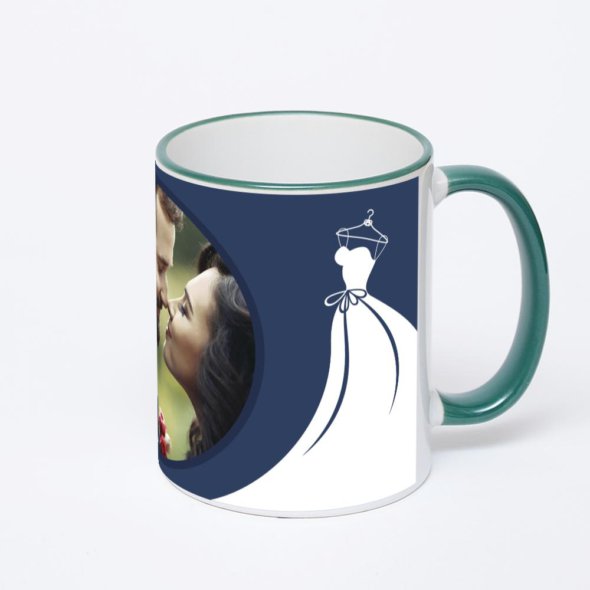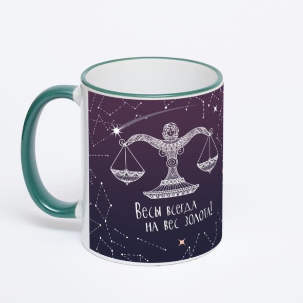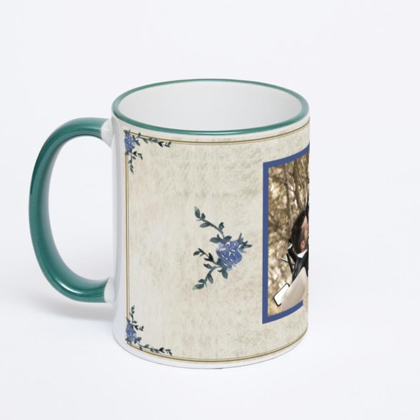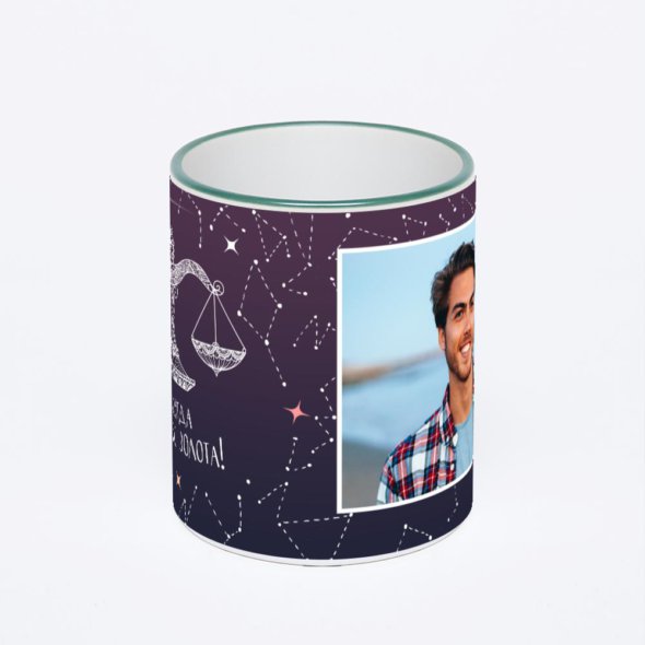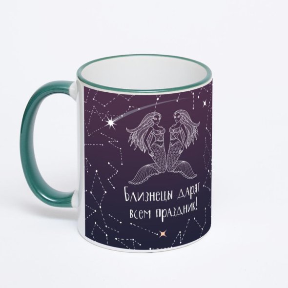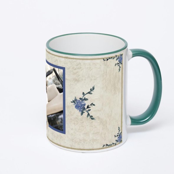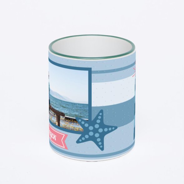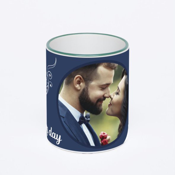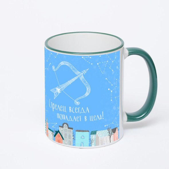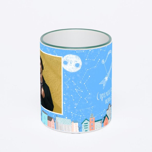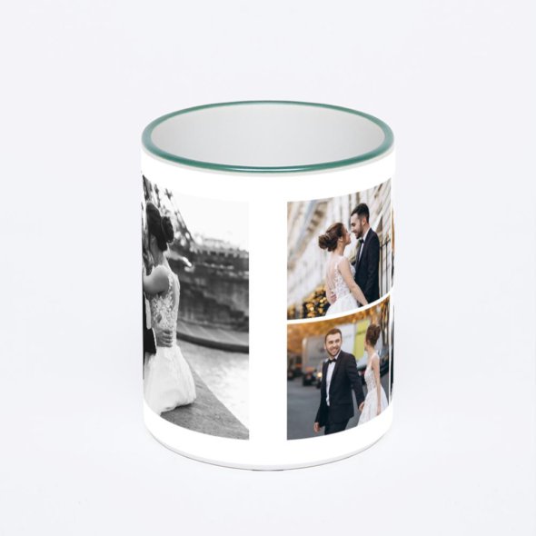 Керамическая кружка с зеленой ручкой и ободком с нанесением изображения. Кружка с вашим изображением – это уникальный и качественный подарок. Создать её вы можете прямо сейчас в редакторе, добавляя фотографии, стикеры и надписи.