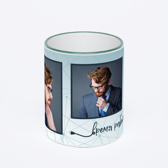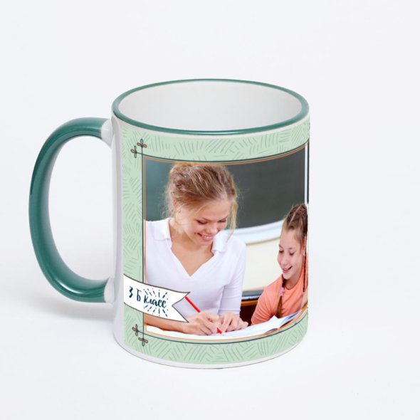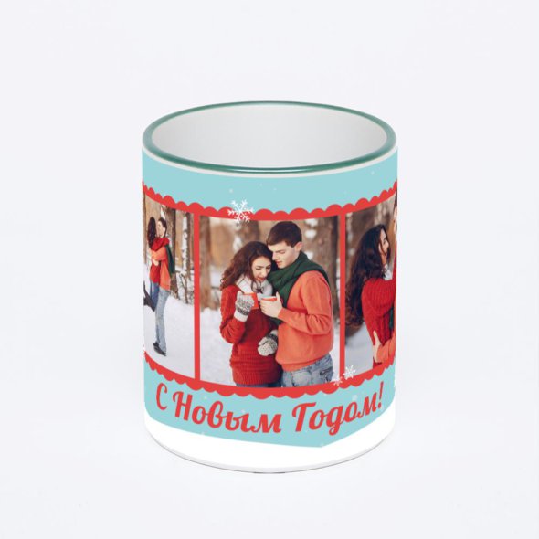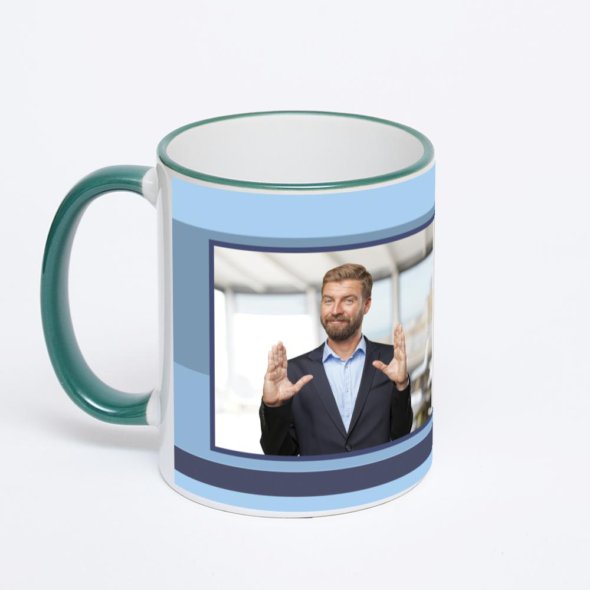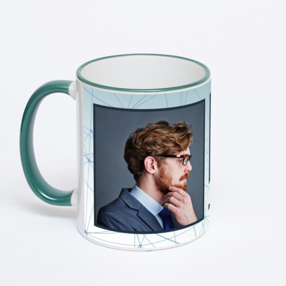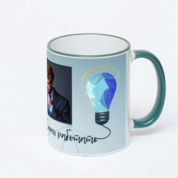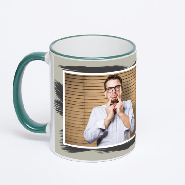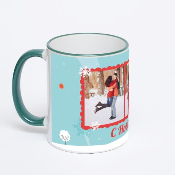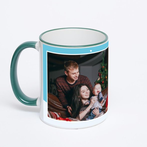 Керамическая кружка с зеленой ручкой и ободком с нанесением изображения. Кружка с вашим изображением – это уникальный и качественный подарок. Создать её вы можете прямо сейчас в редакторе, добавляя фотографии, стикеры и надписи.