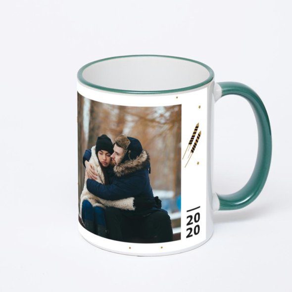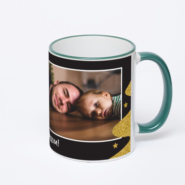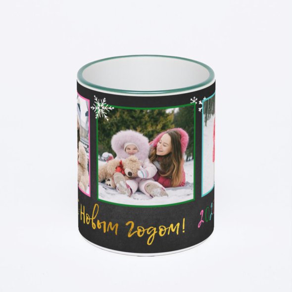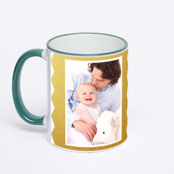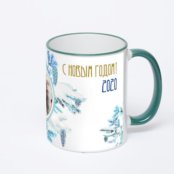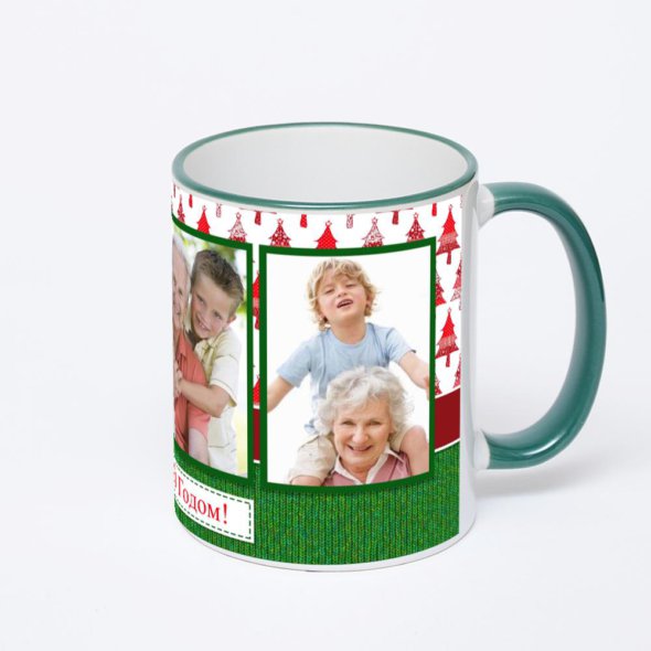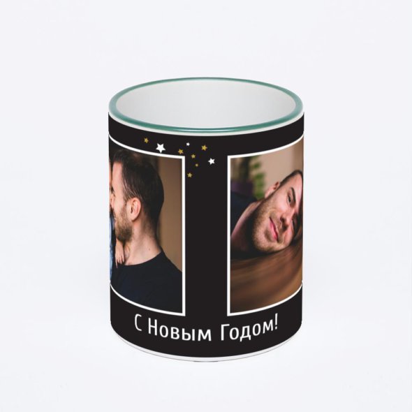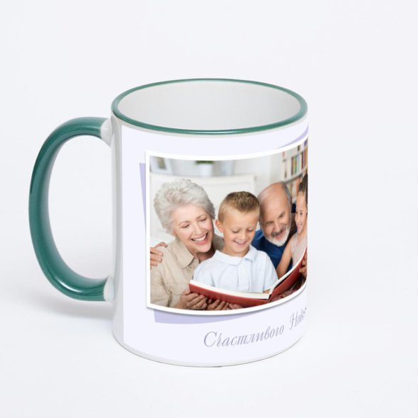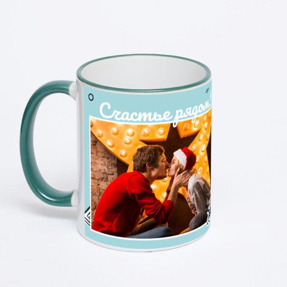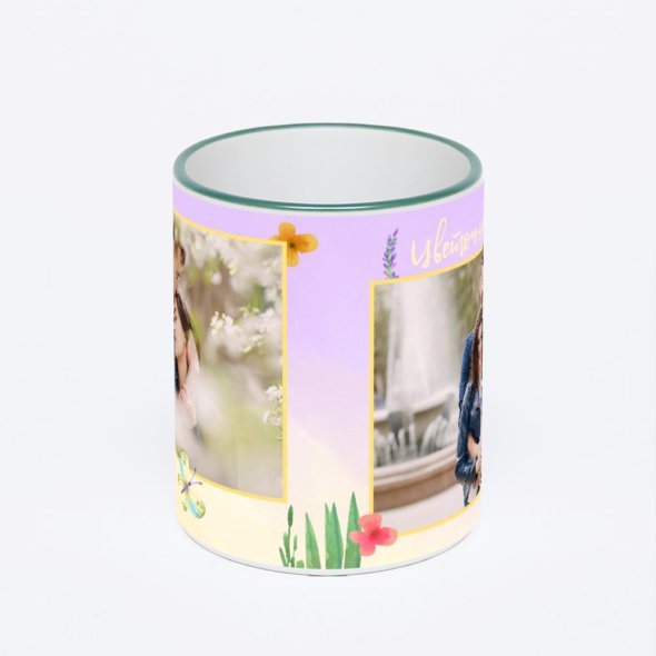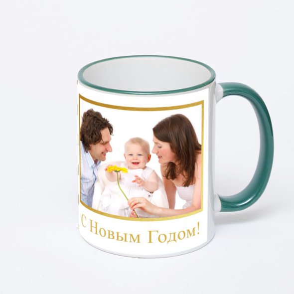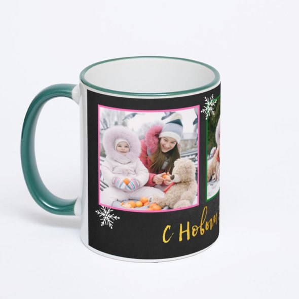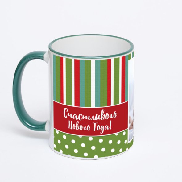 Керамическая кружка с зеленой ручкой и ободком с нанесением изображения. Кружка с вашим изображением – это уникальный и качественный подарок. Создать её вы можете прямо сейчас в редакторе, добавляя фотографии, стикеры и надписи.
