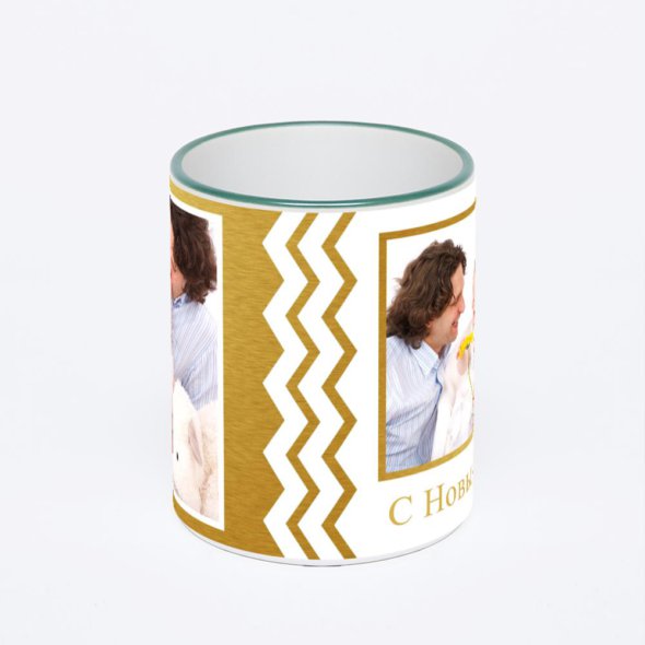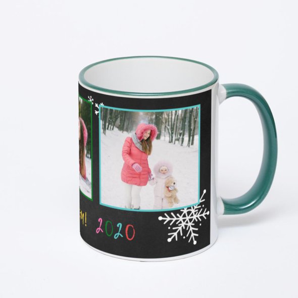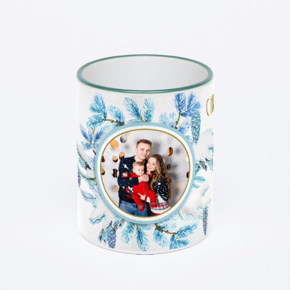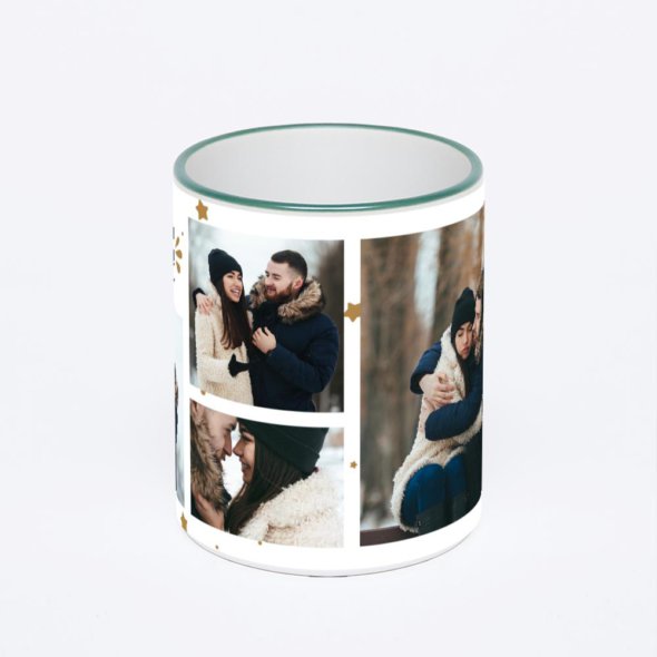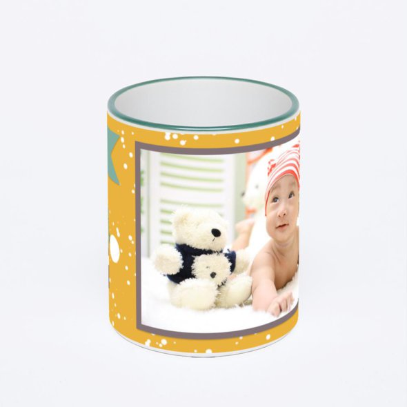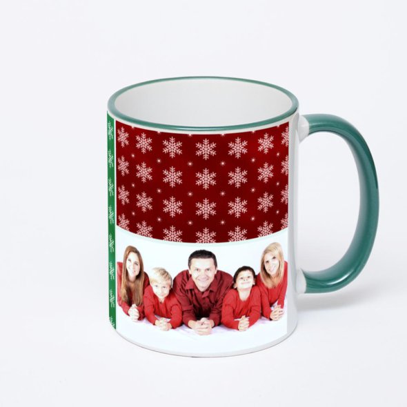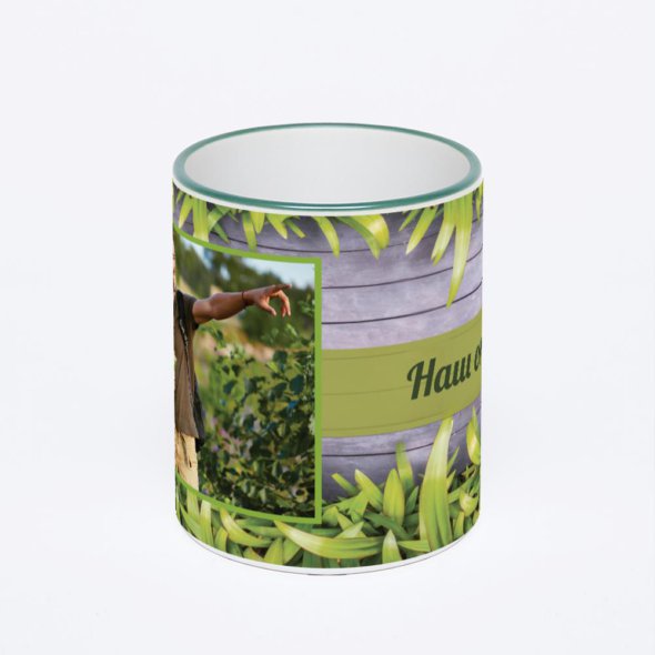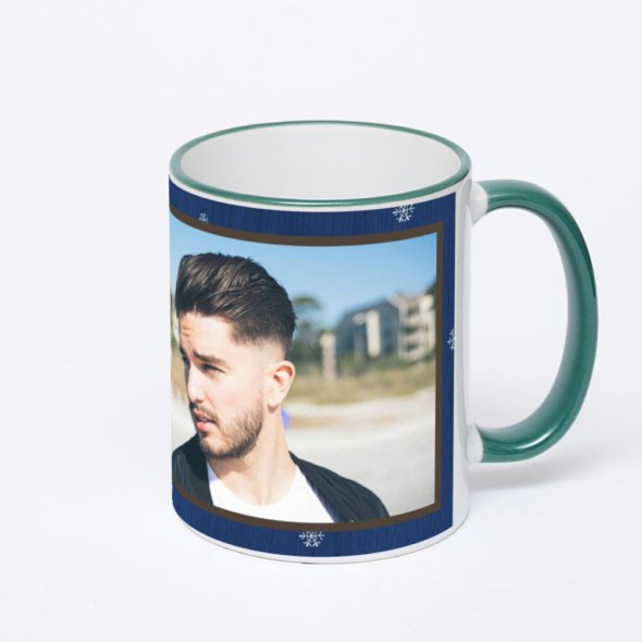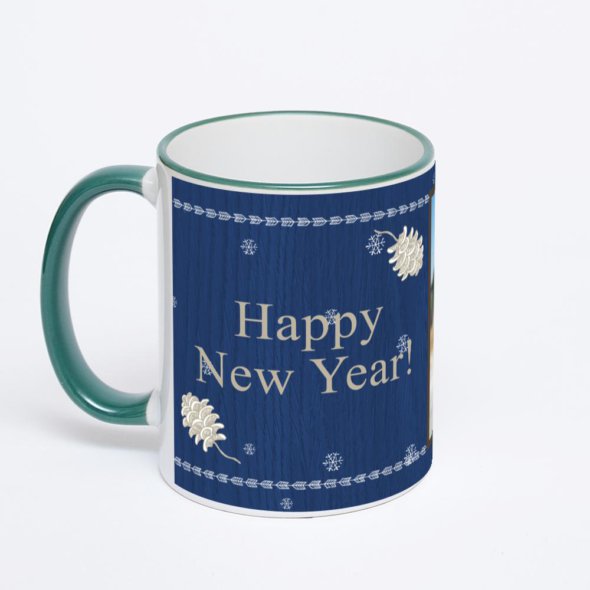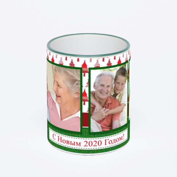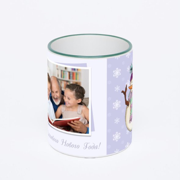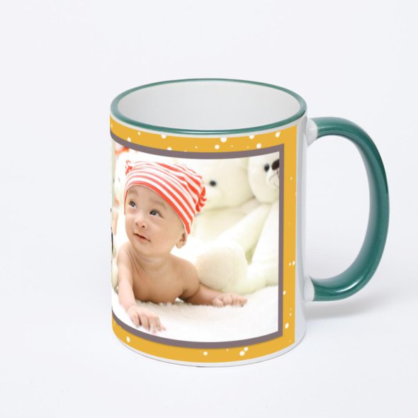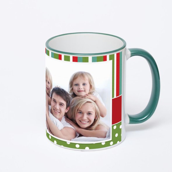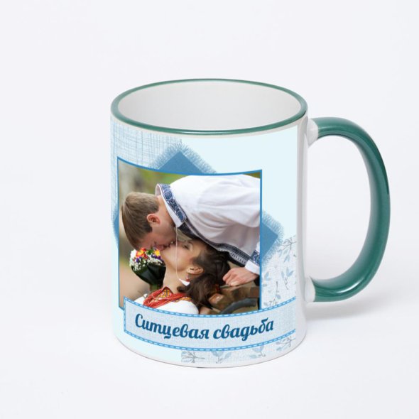 Керамическая кружка с зеленой ручкой и ободком с нанесением изображения. Кружка с вашим изображением – это уникальный и качественный подарок. Создать её вы можете прямо сейчас в редакторе, добавляя фотографии, стикеры и надписи.