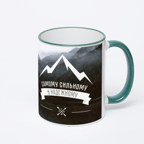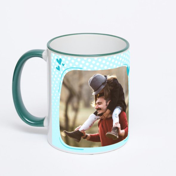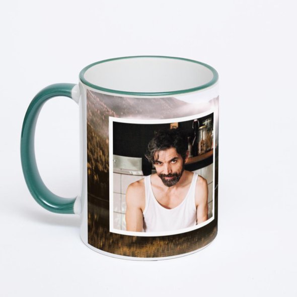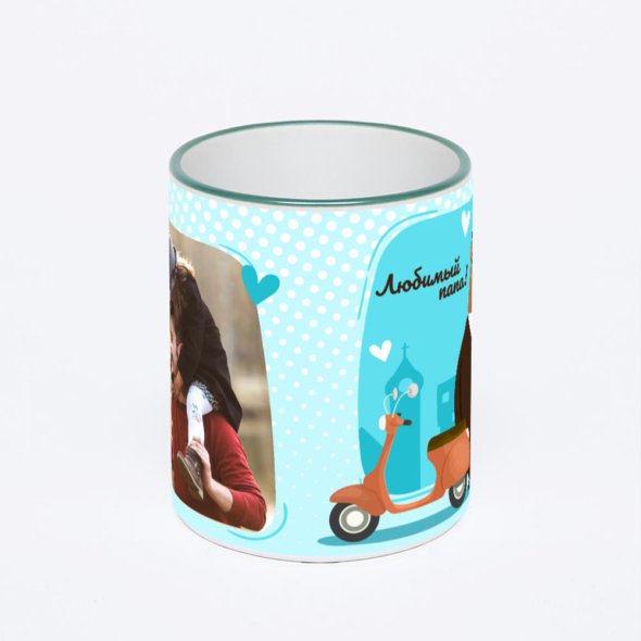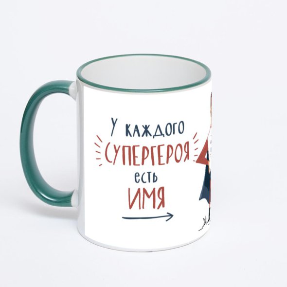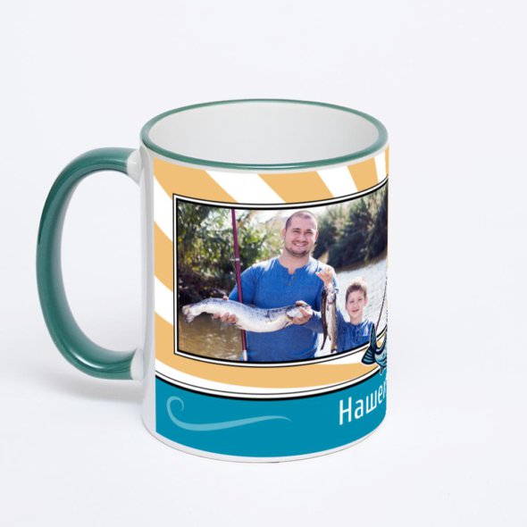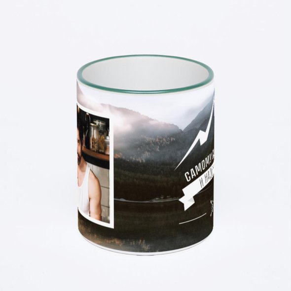 Керамическая кружка с зеленой ручкой и ободком с нанесением изображения. Кружка с вашим изображением – это уникальный и качественный подарок. Создать её вы можете прямо сейчас в редакторе, добавляя фотографии, стикеры и надписи.