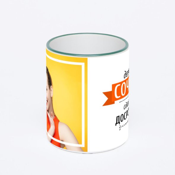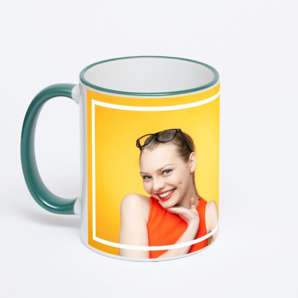 Керамическая кружка с зеленой ручкой и ободком с нанесением изображения. Кружка с вашим изображением – это уникальный и качественный подарок. Создать её вы можете прямо сейчас в редакторе, добавляя фотографии, стикеры и надписи.