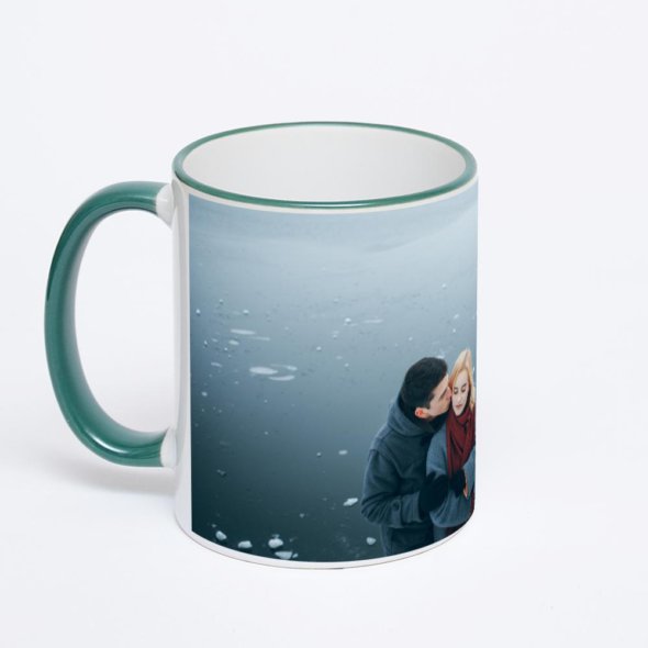 Керамическая кружка с зеленой ручкой и ободком с нанесением изображения. Кружка с вашим изображением – это уникальный и качественный подарок. Создать её вы можете прямо сейчас в редакторе, добавляя фотографии, стикеры и надписи.