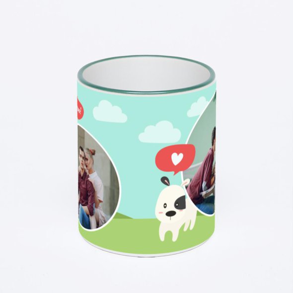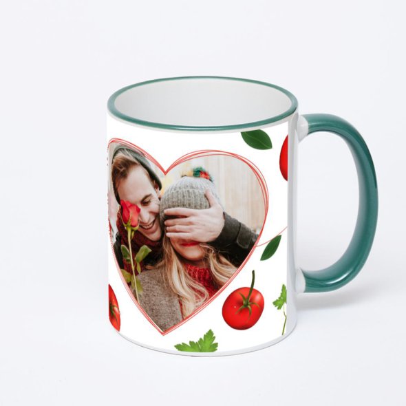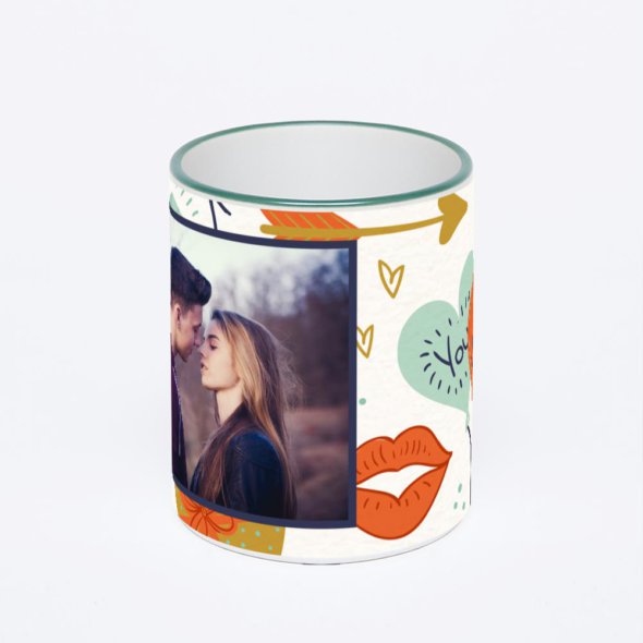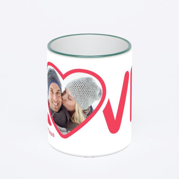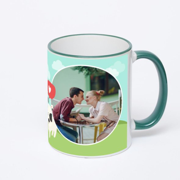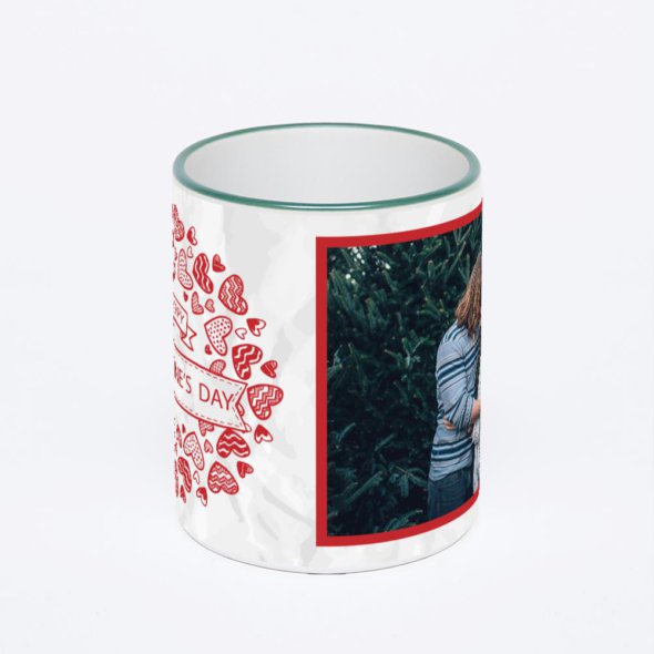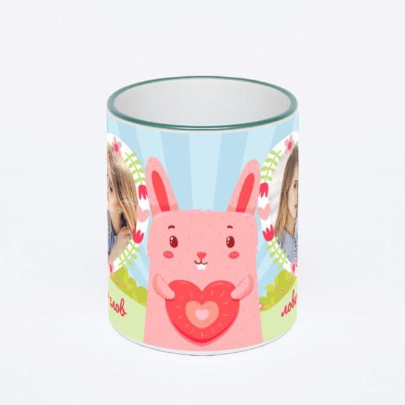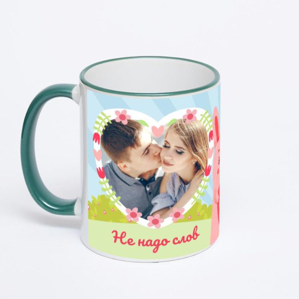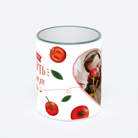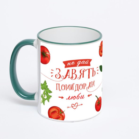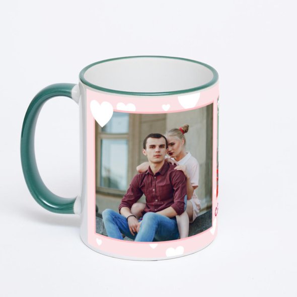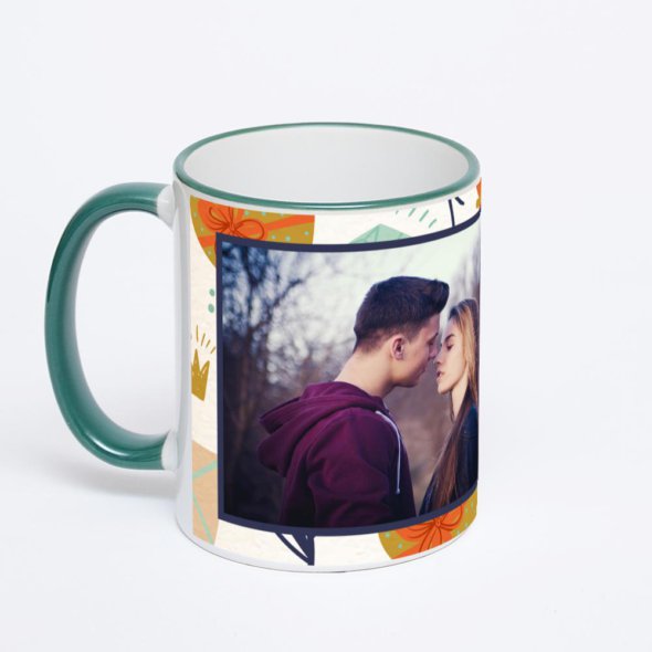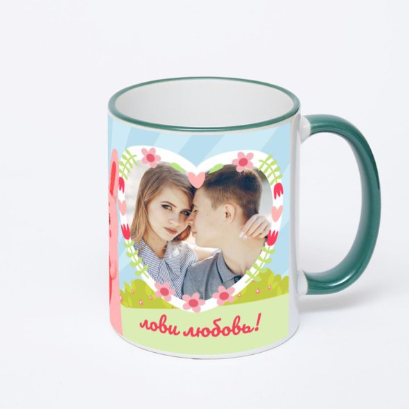 Керамическая кружка с зеленой ручкой и ободком с нанесением изображения. Кружка с вашим изображением – это уникальный и качественный подарок. Создать её вы можете прямо сейчас в редакторе, добавляя фотографии, стикеры и надписи.