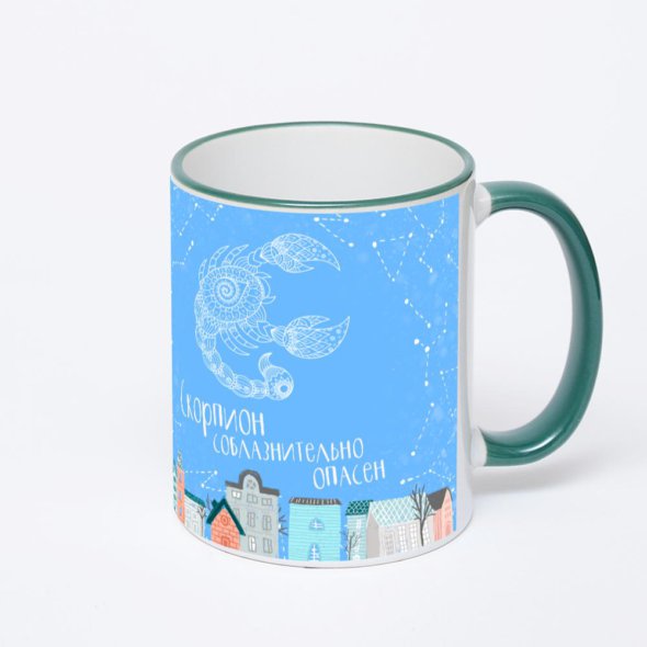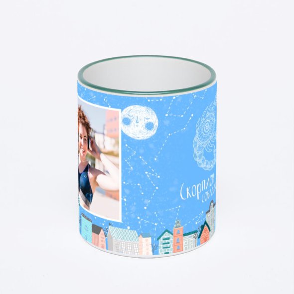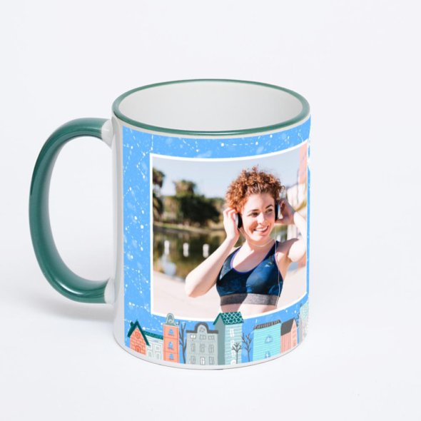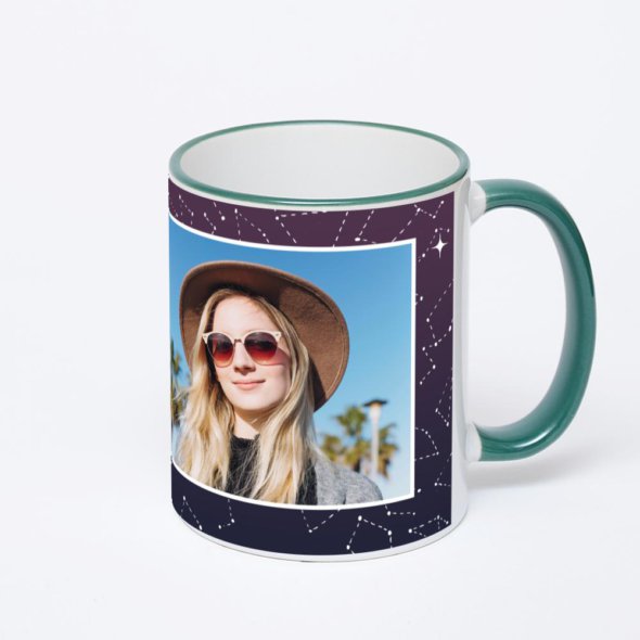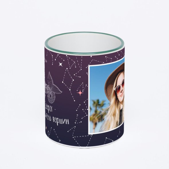 Керамическая кружка с зеленой ручкой и ободком с нанесением изображения. Кружка с вашим изображением – это уникальный и качественный подарок. Создать её вы можете прямо сейчас в редакторе, добавляя фотографии, стикеры и надписи.