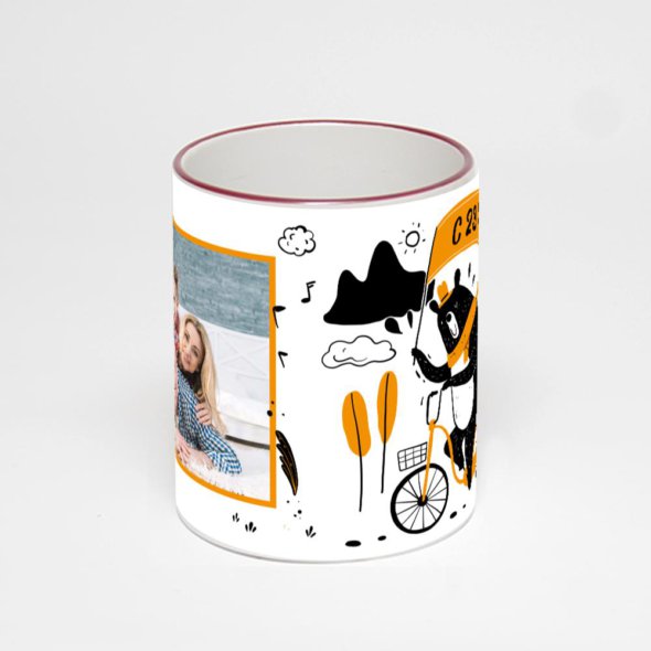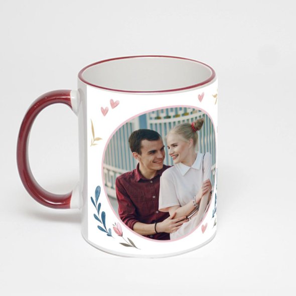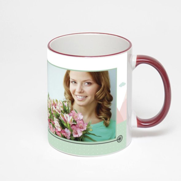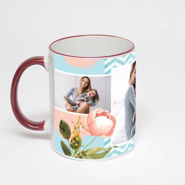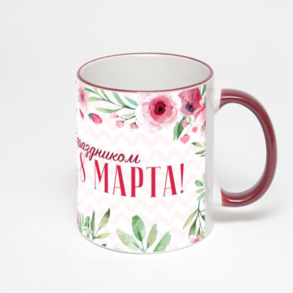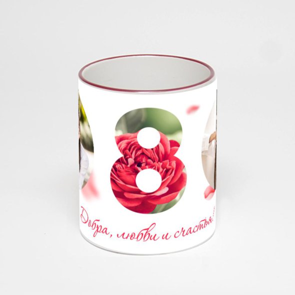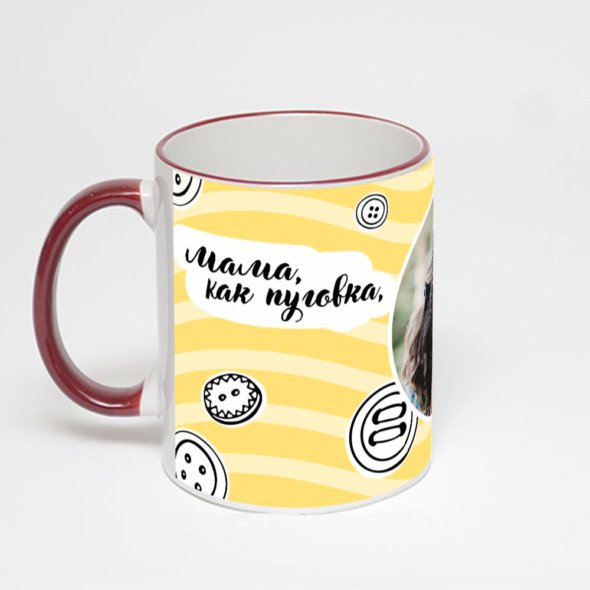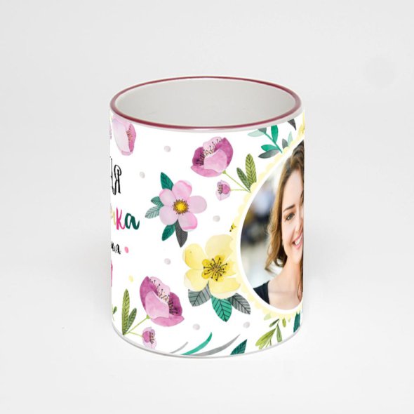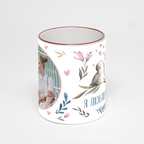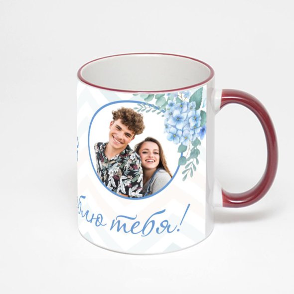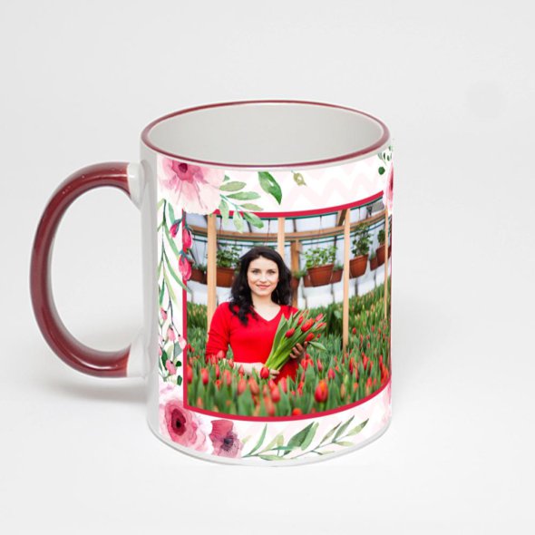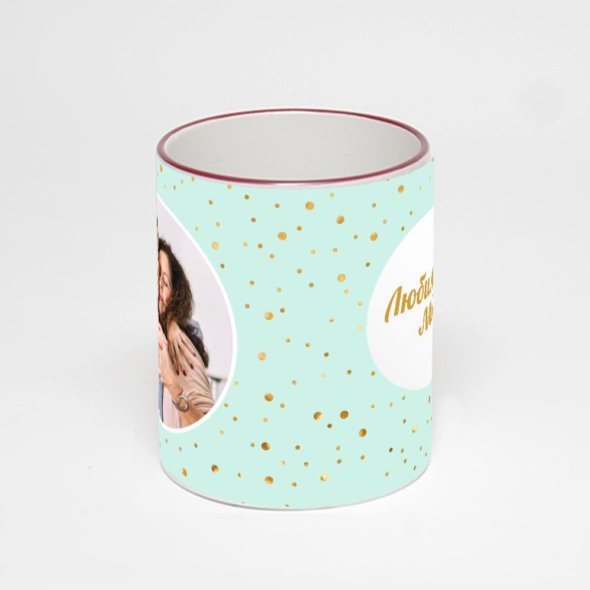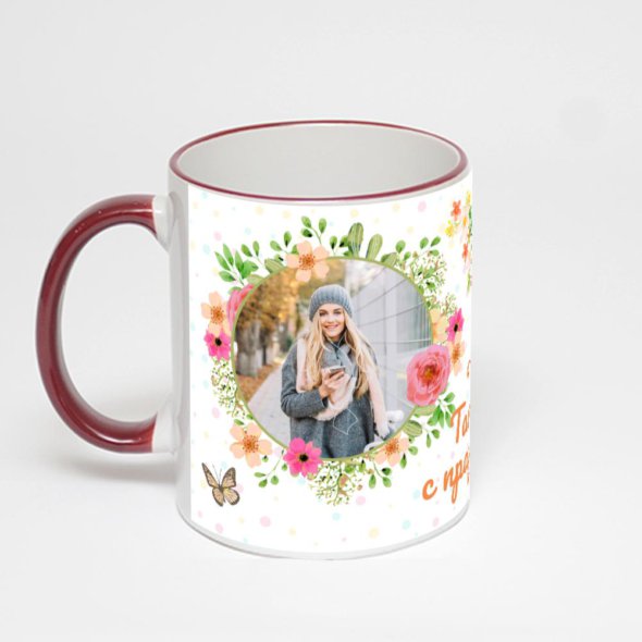 Керамическая кружка с бордовой ручкой и ободком с нанесением изображения. Кружка с вашим изображением – это уникальный и качественный подарок. Создать её вы можете прямо сейчас в редакторе, добавляя фотографии, стикеры и надписи.