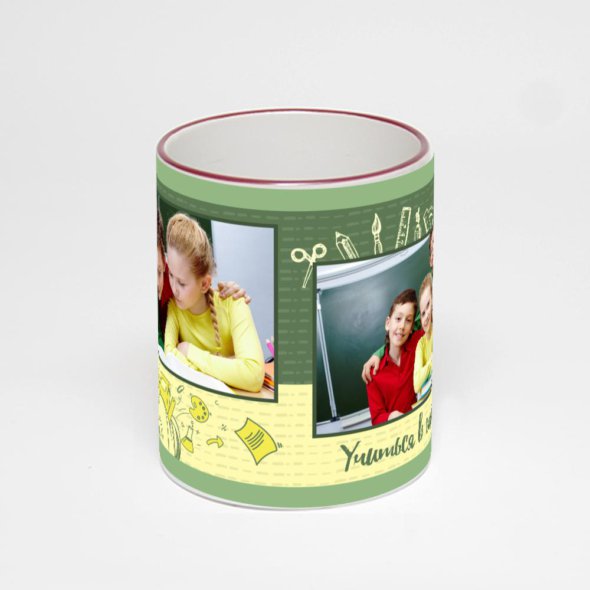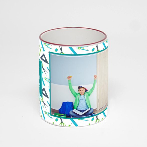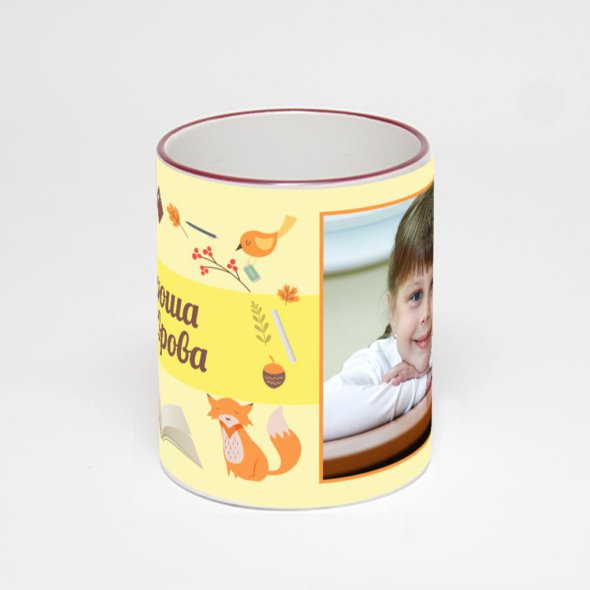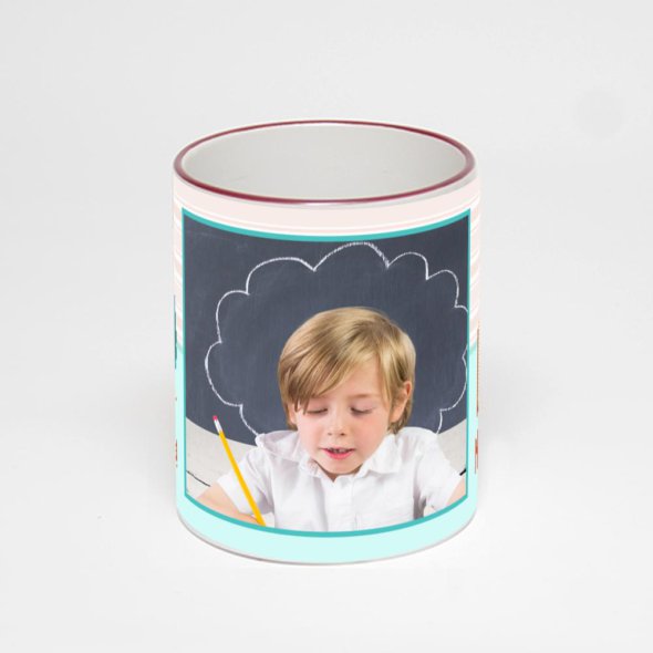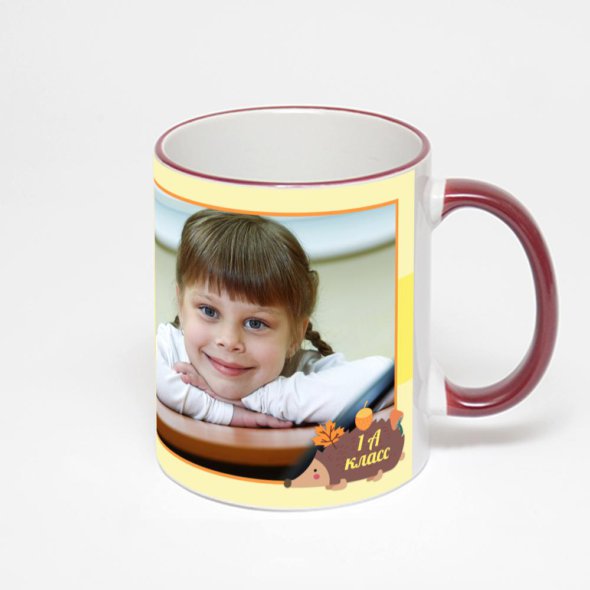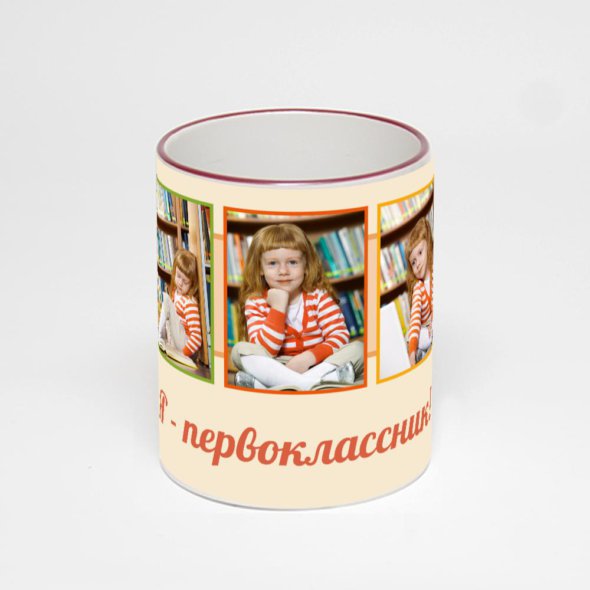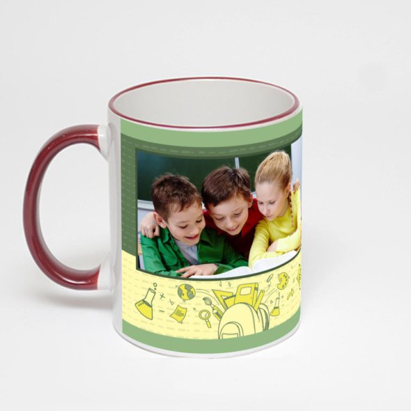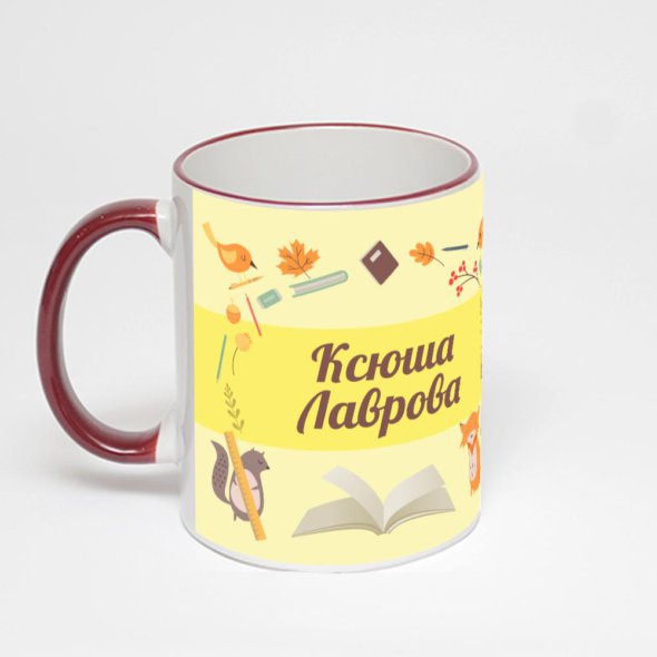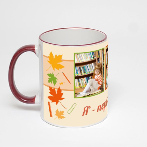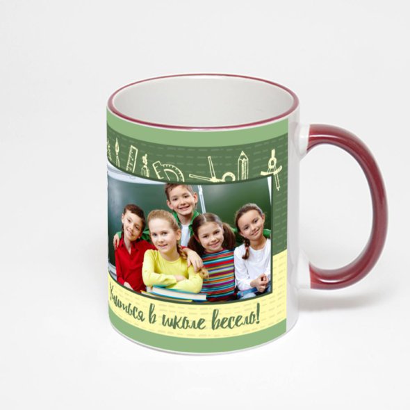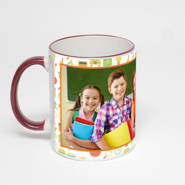 Керамическая кружка с бордовой ручкой и ободком с нанесением изображения. Кружка с вашим изображением – это уникальный и качественный подарок. Создать её вы можете прямо сейчас в редакторе, добавляя фотографии, стикеры и надписи.