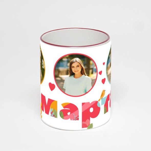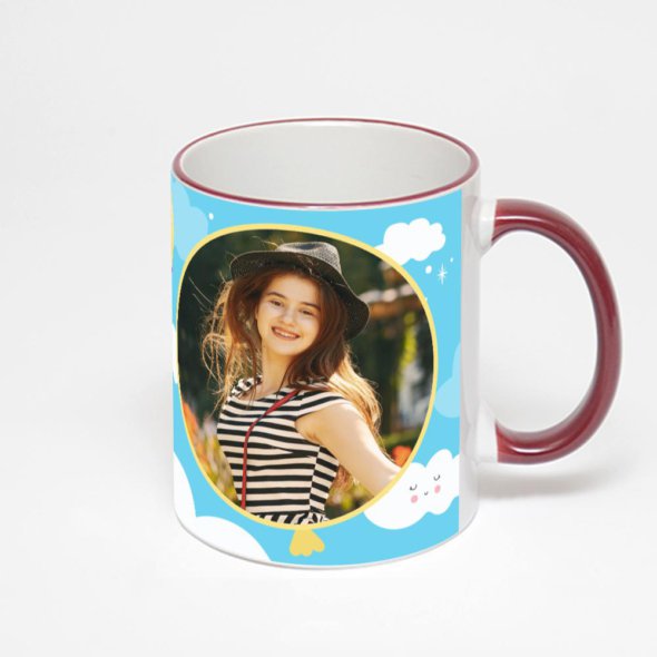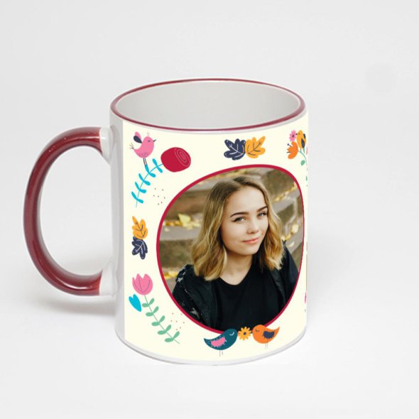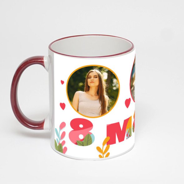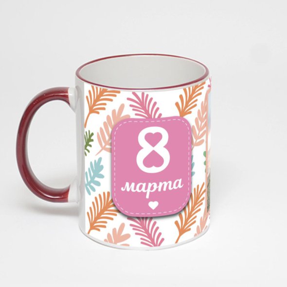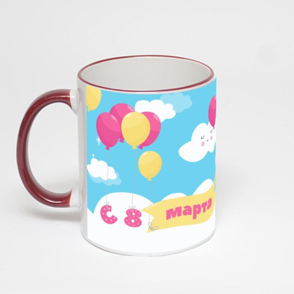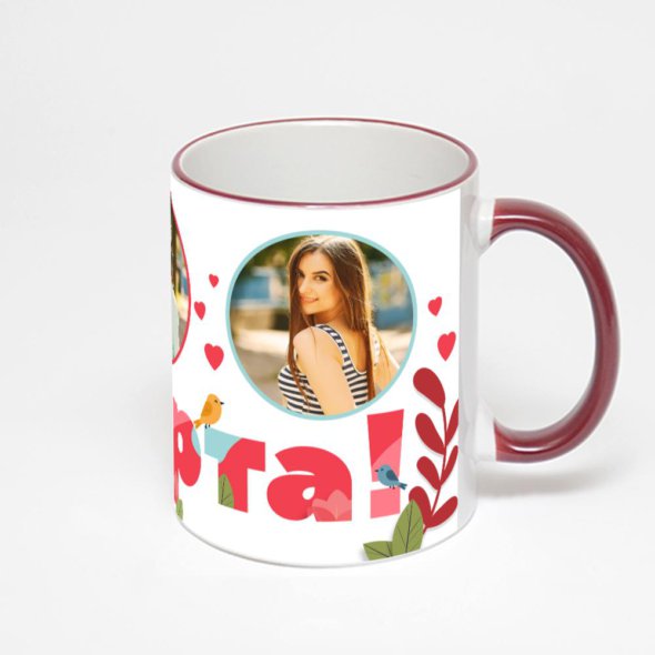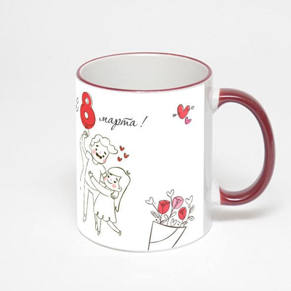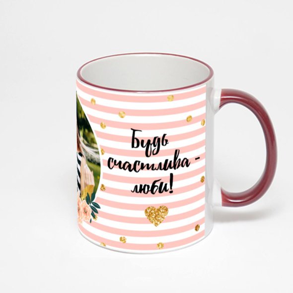 Керамическая кружка с бордовой ручкой и ободком с нанесением изображения. Кружка с вашим изображением – это уникальный и качественный подарок. Создать её вы можете прямо сейчас в редакторе, добавляя фотографии, стикеры и надписи.