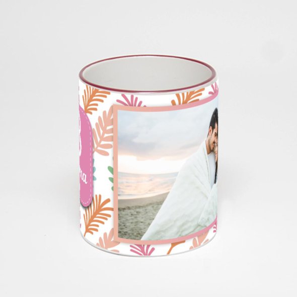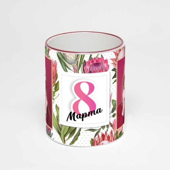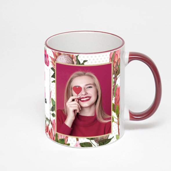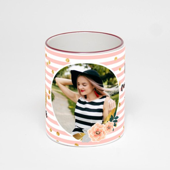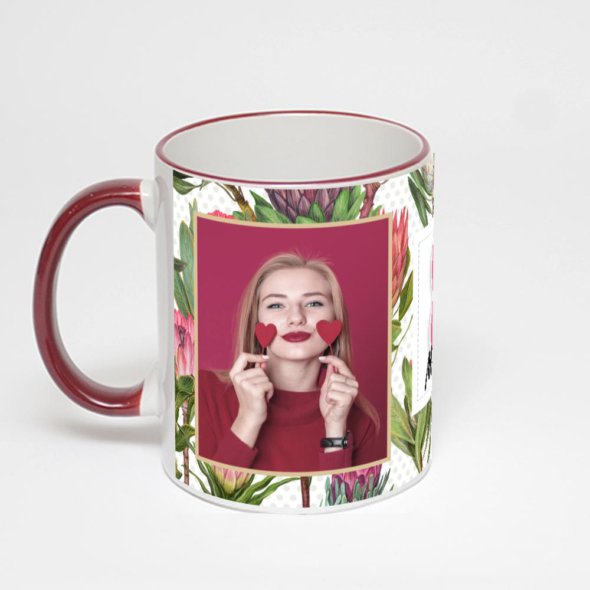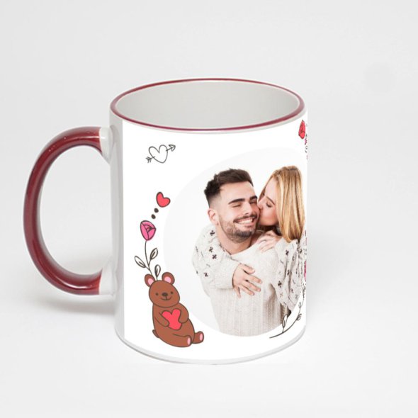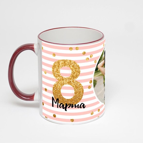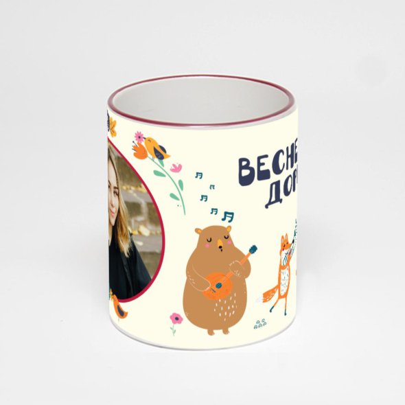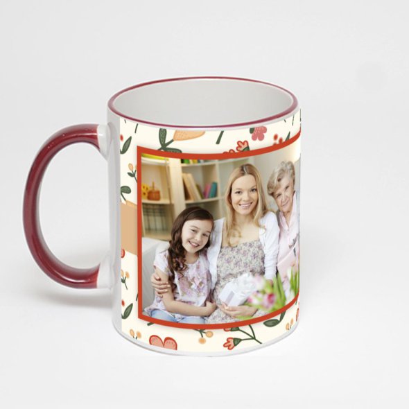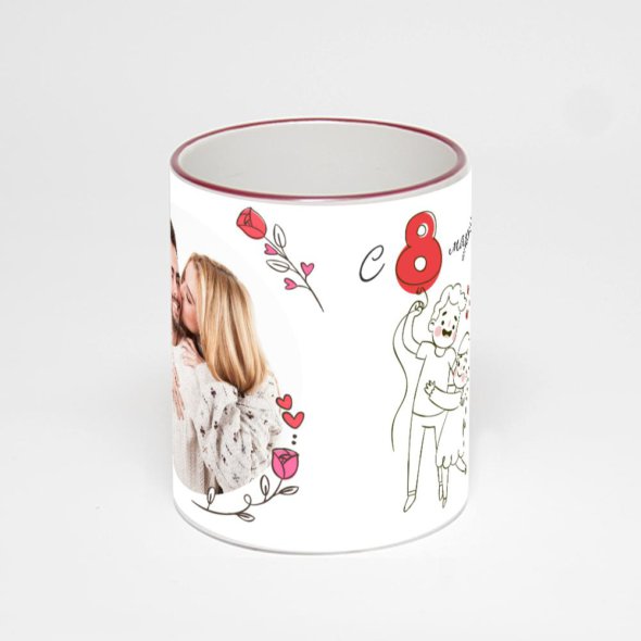 Керамическая кружка с бордовой ручкой и ободком с нанесением изображения. Кружка с вашим изображением – это уникальный и качественный подарок. Создать её вы можете прямо сейчас в редакторе, добавляя фотографии, стикеры и надписи.