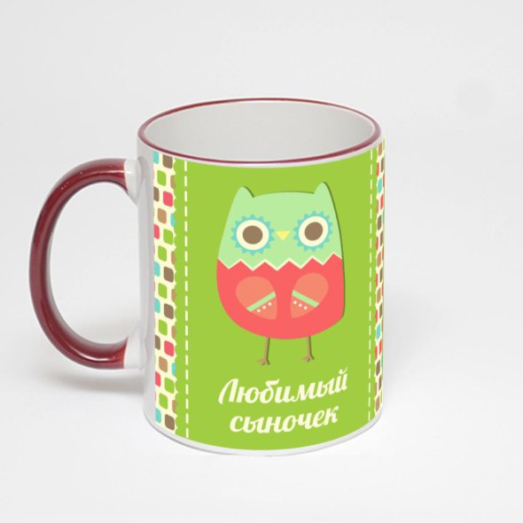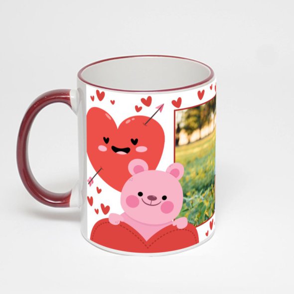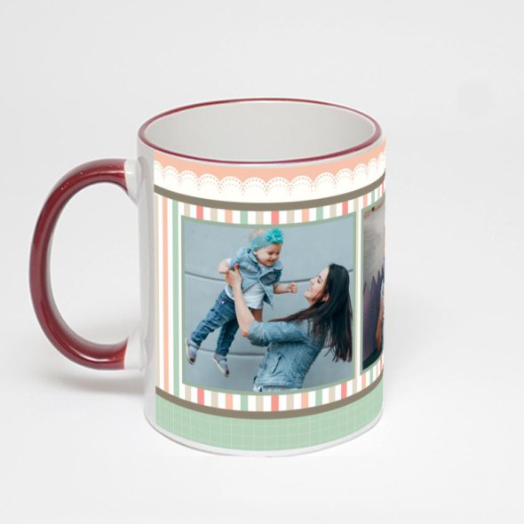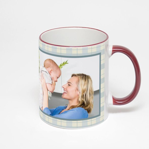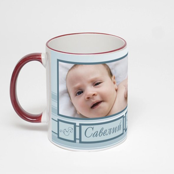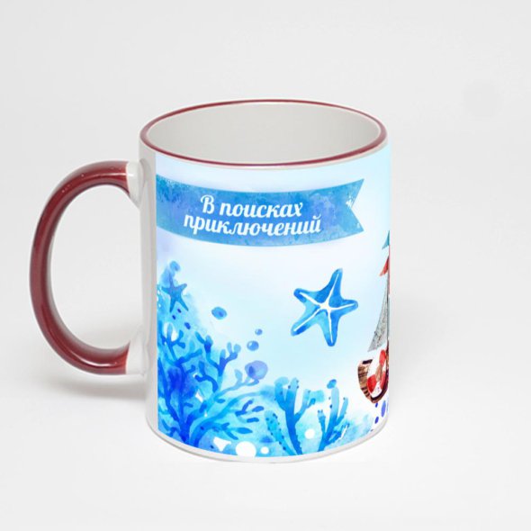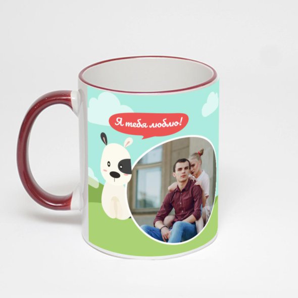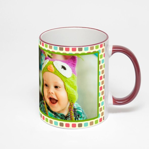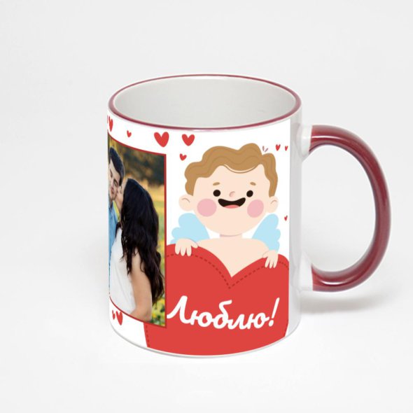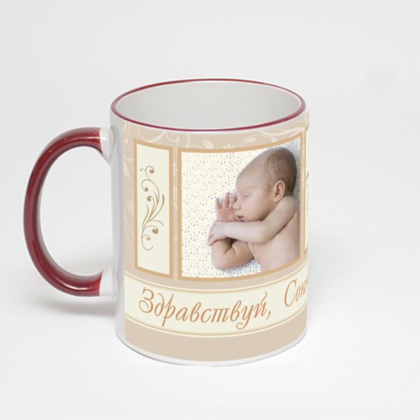 Керамическая кружка с бордовой ручкой и ободком с нанесением изображения. Кружка с вашим изображением – это уникальный и качественный подарок. Создать её вы можете прямо сейчас в редакторе, добавляя фотографии, стикеры и надписи.