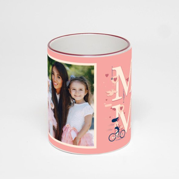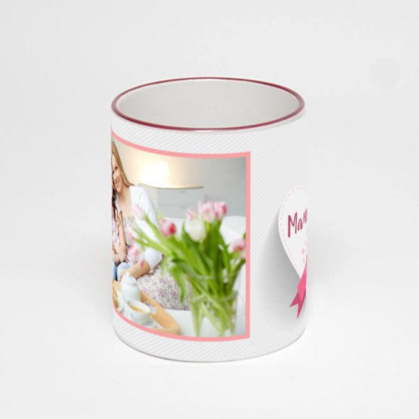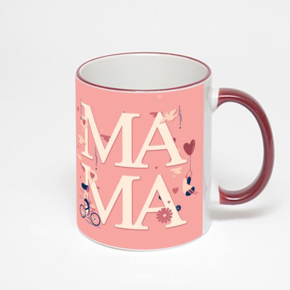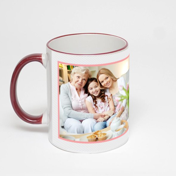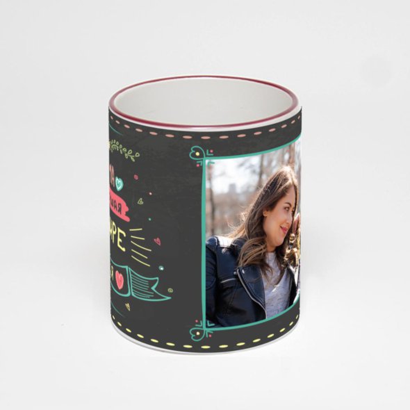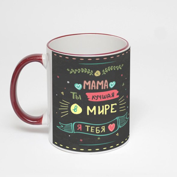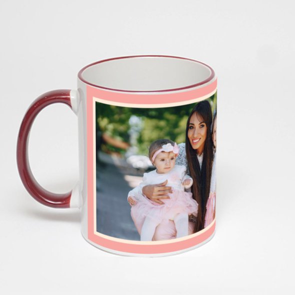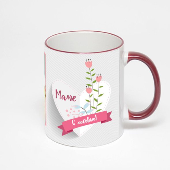 Керамическая кружка с бордовой ручкой и ободком с нанесением изображения. Кружка с вашим изображением – это уникальный и качественный подарок. Создать её вы можете прямо сейчас в редакторе, добавляя фотографии, стикеры и надписи.