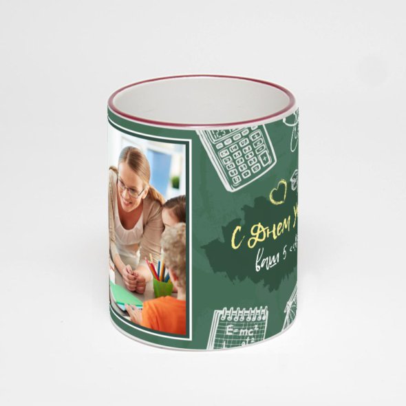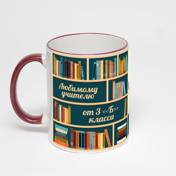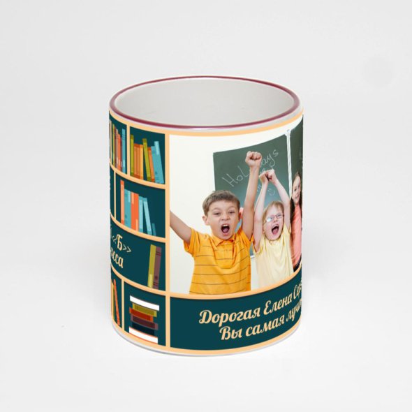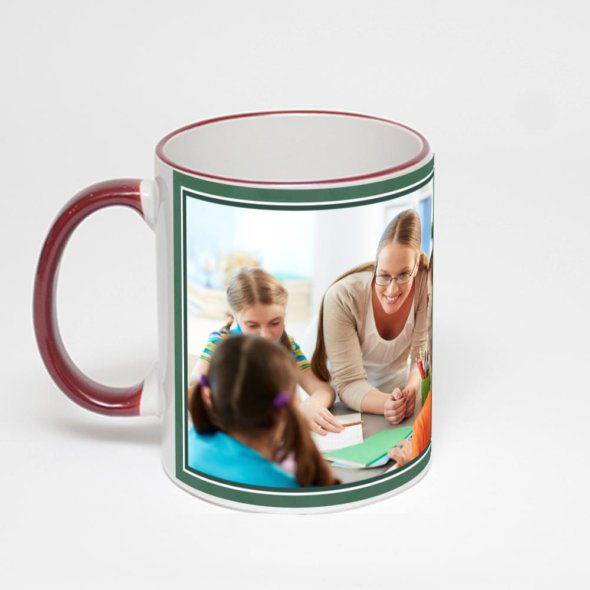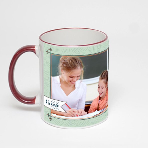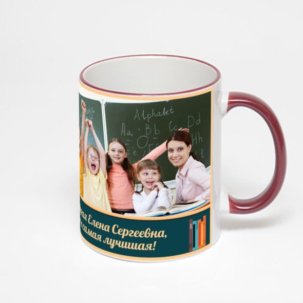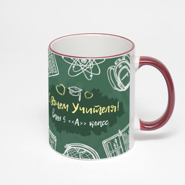Керамическая кружка с бордовой ручкой и ободком с нанесением изображения. Кружка с вашим изображением – это уникальный и качественный подарок. Создать её вы можете прямо сейчас в редакторе, добавляя фотографии, стикеры и надписи.