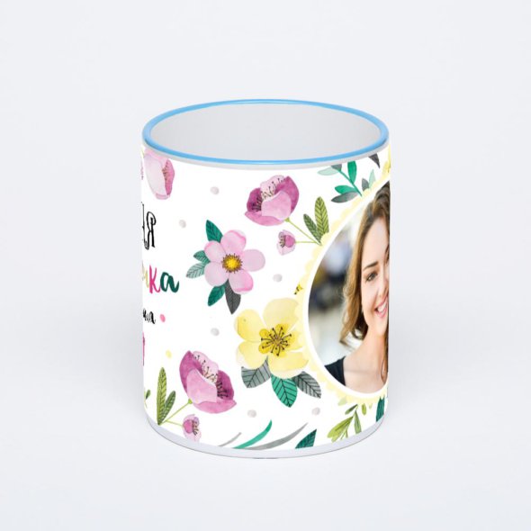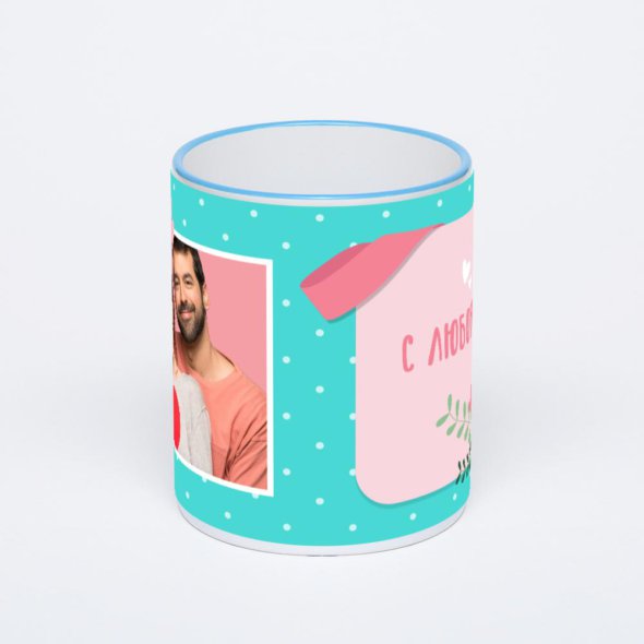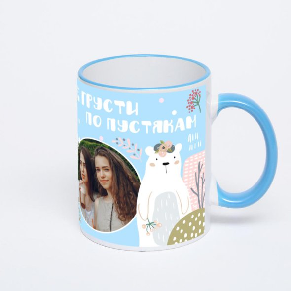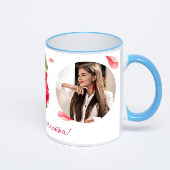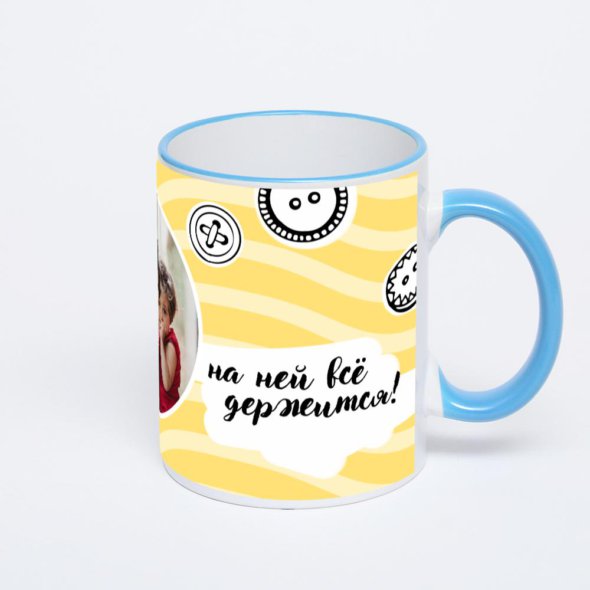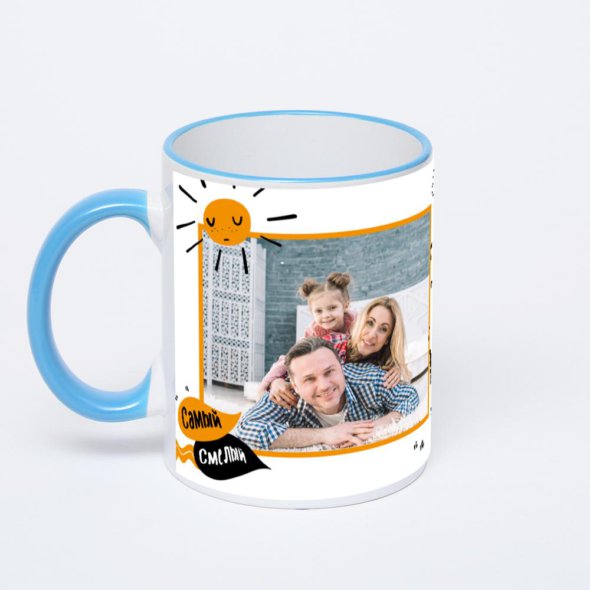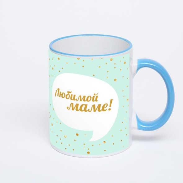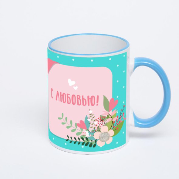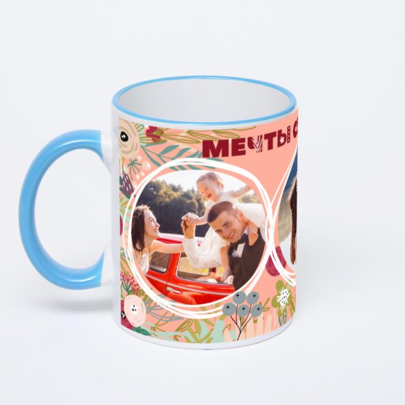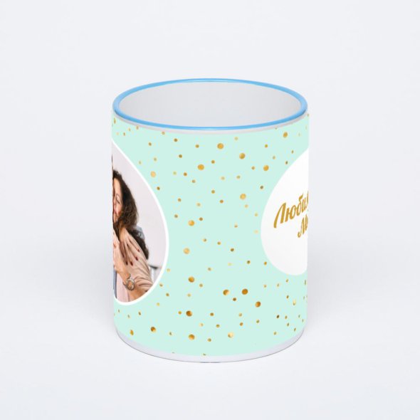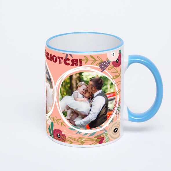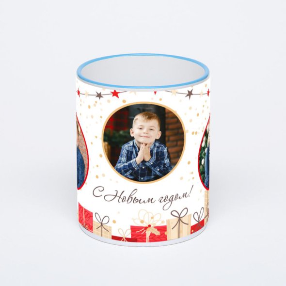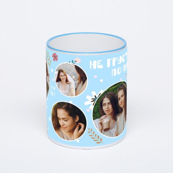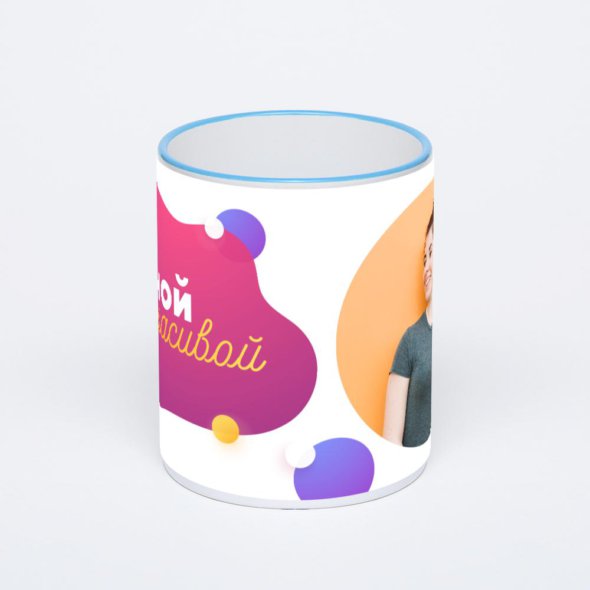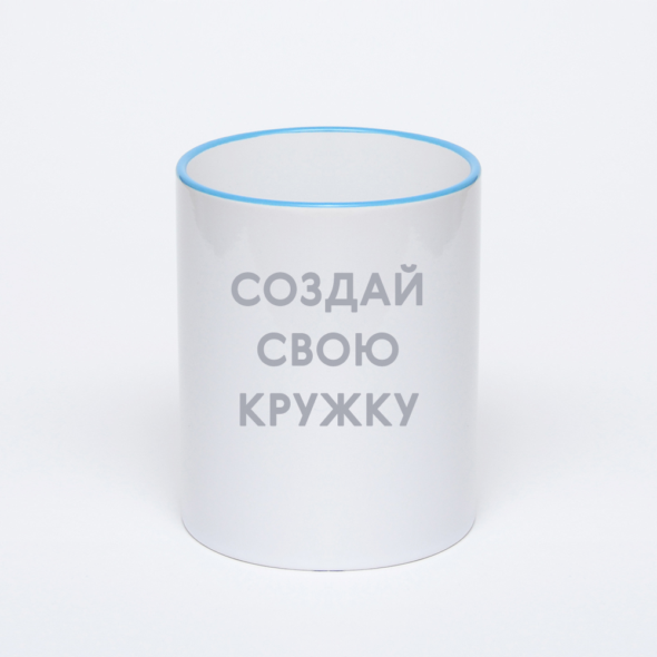 Керамическая кружка с синей ручкой и ободком с нанесением изображения. Кружка с вашим изображением – это уникальный и качественный подарок. Создать её вы можете прямо сейчас в редакторе, добавляя фотографии, стикеры и надписи.