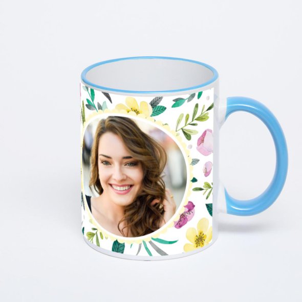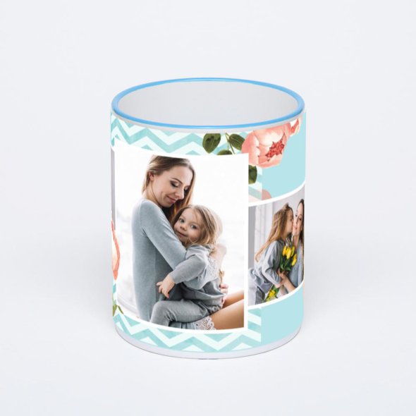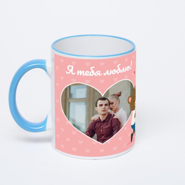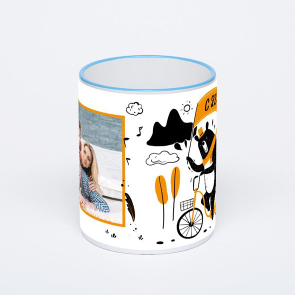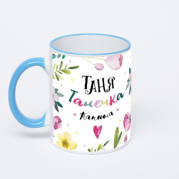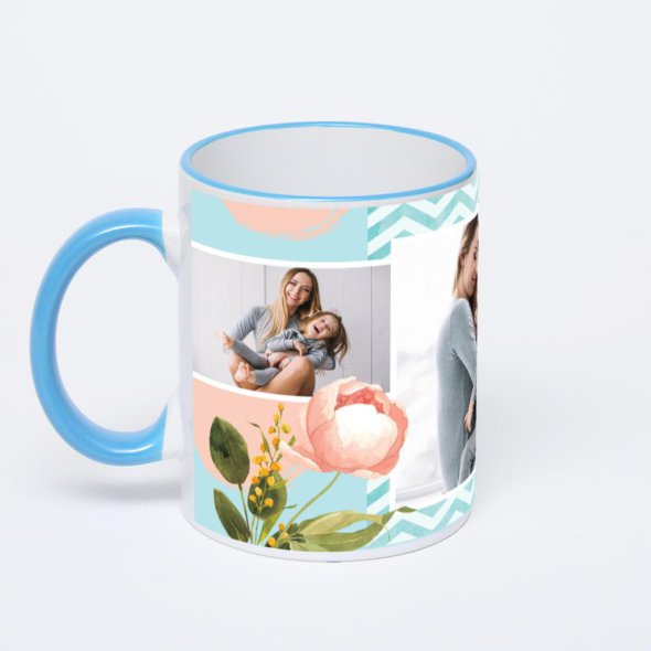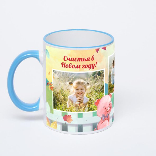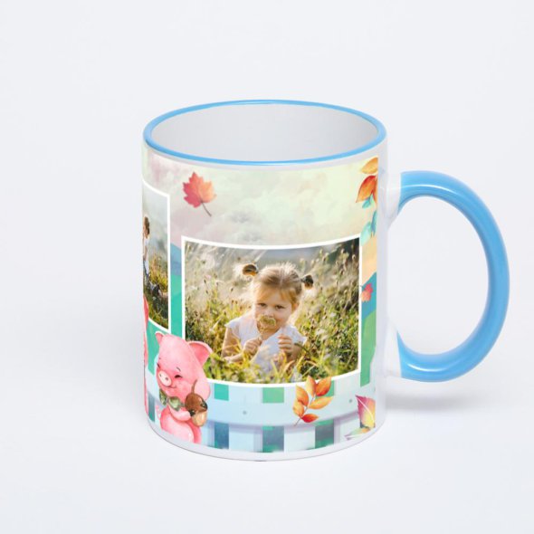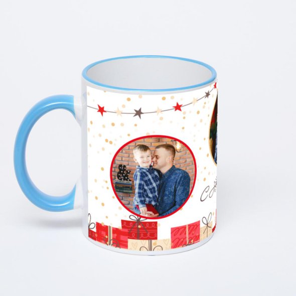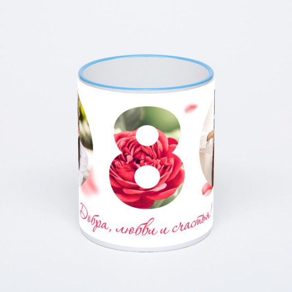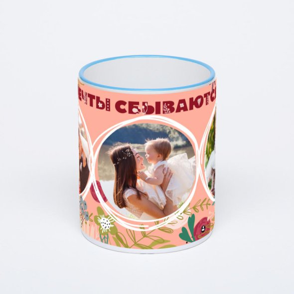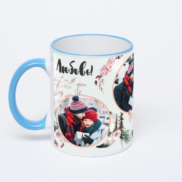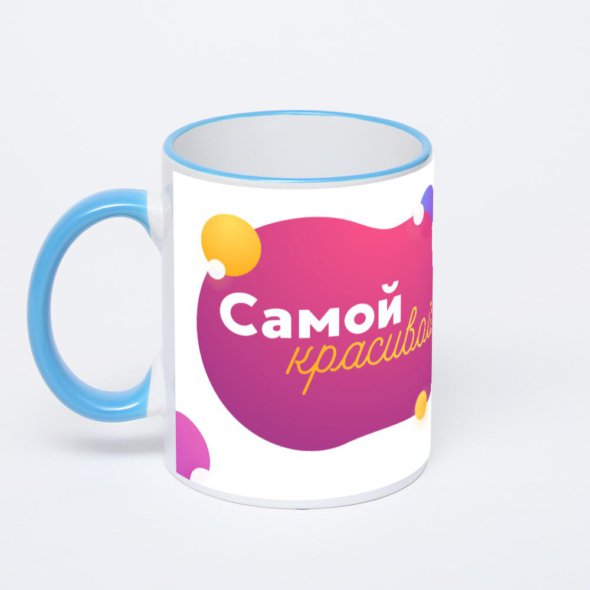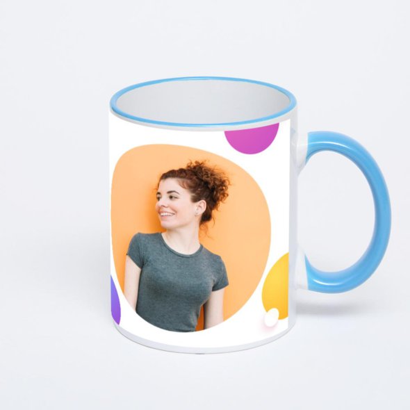 Керамическая кружка с синей ручкой и ободком с нанесением изображения. Кружка с вашим изображением – это уникальный и качественный подарок. Создать её вы можете прямо сейчас в редакторе, добавляя фотографии, стикеры и надписи.
