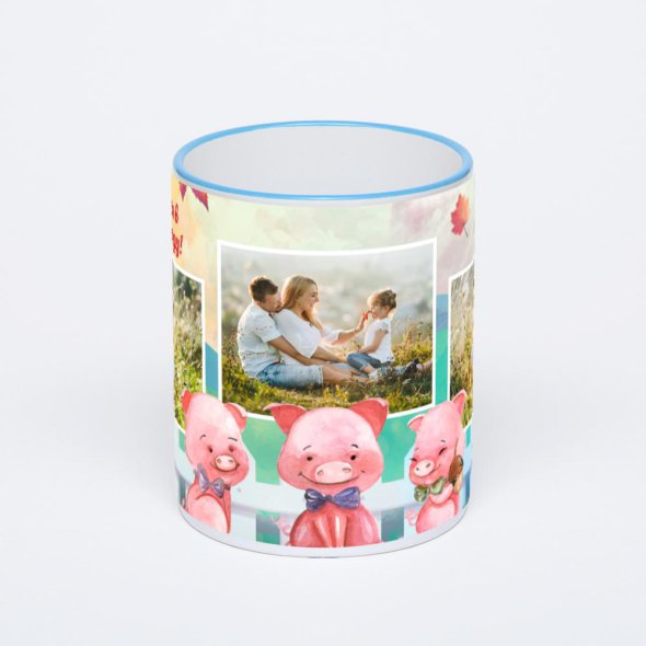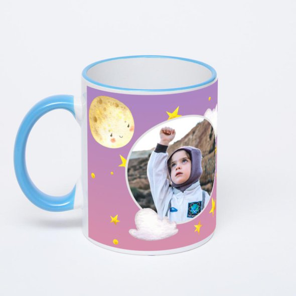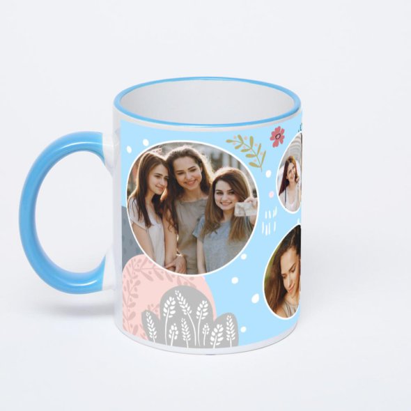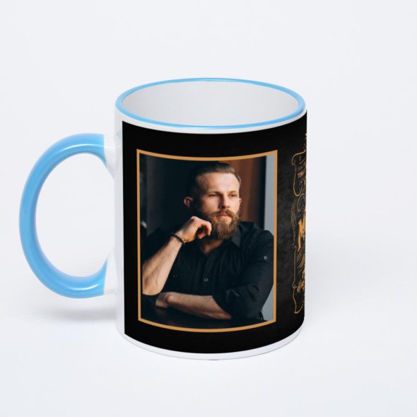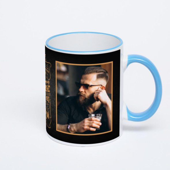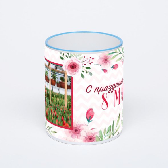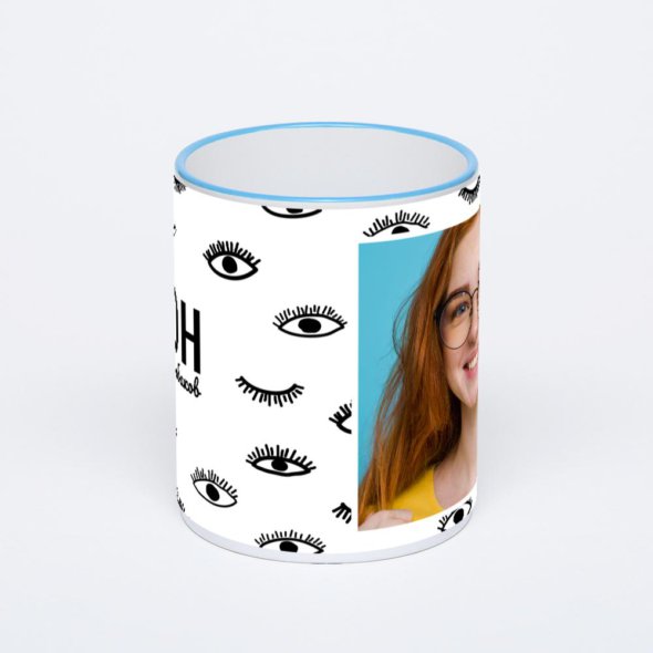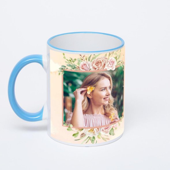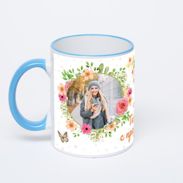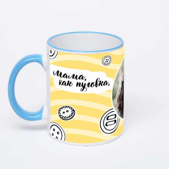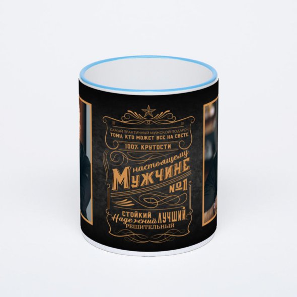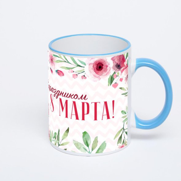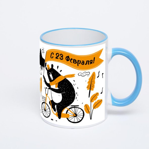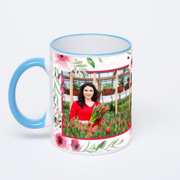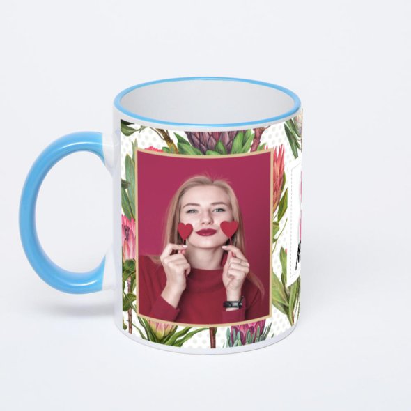 Керамическая кружка с синей ручкой и ободком с нанесением изображения. Кружка с вашим изображением – это уникальный и качественный подарок. Создать её вы можете прямо сейчас в редакторе, добавляя фотографии, стикеры и надписи.