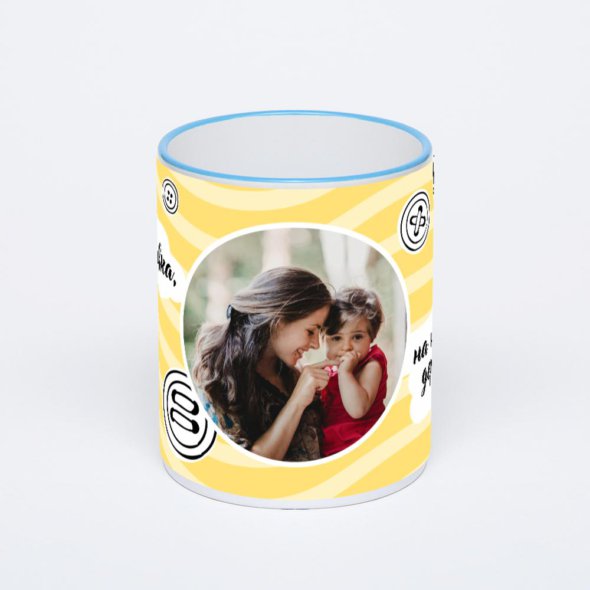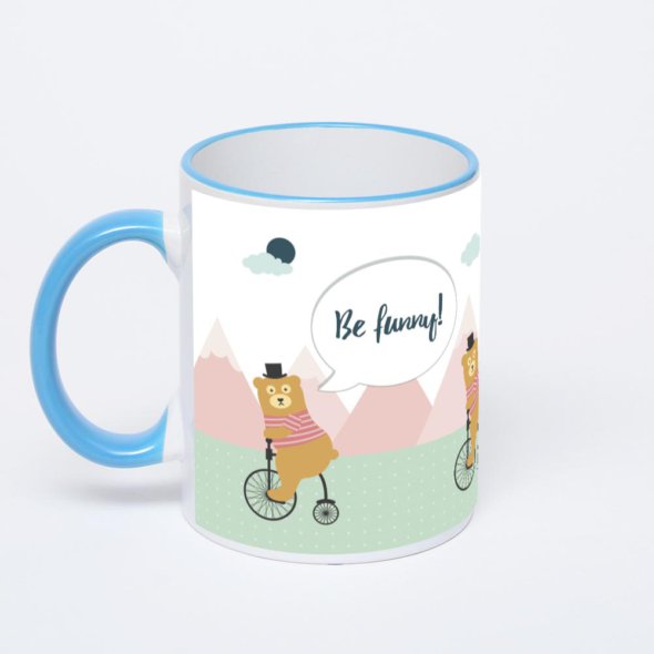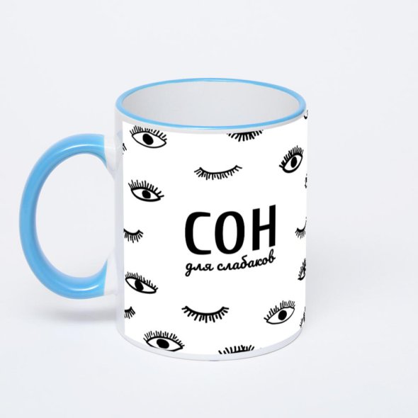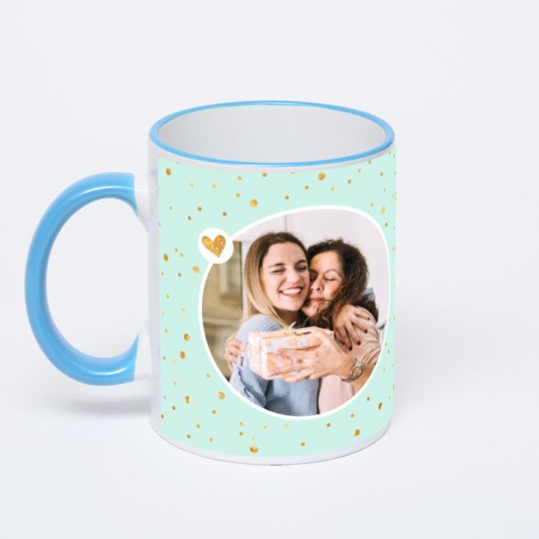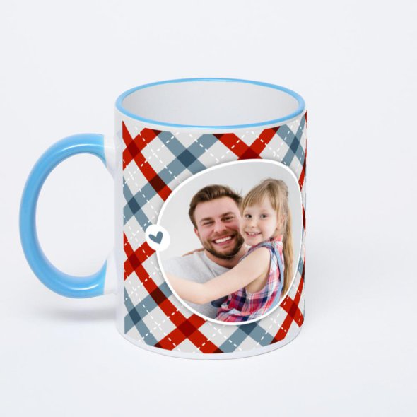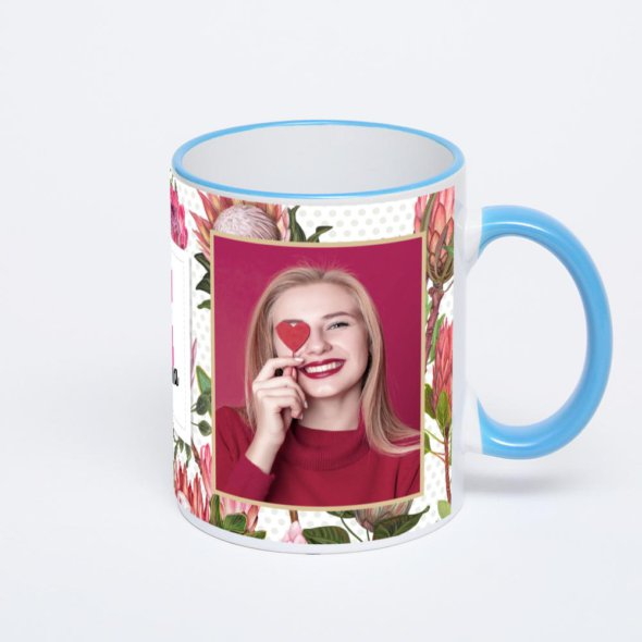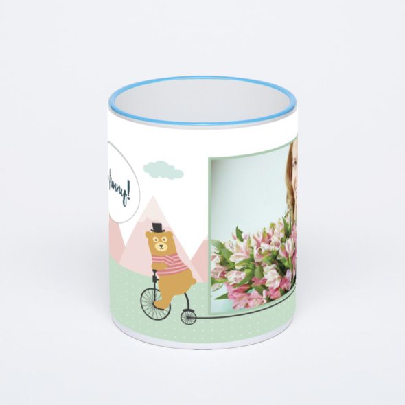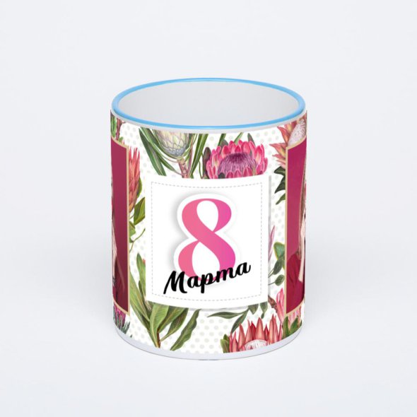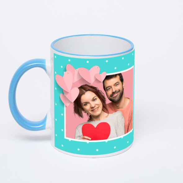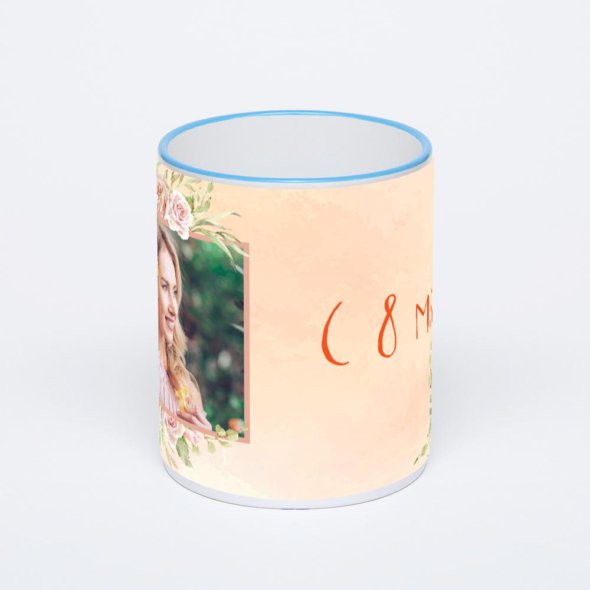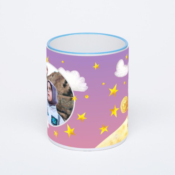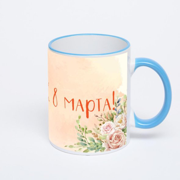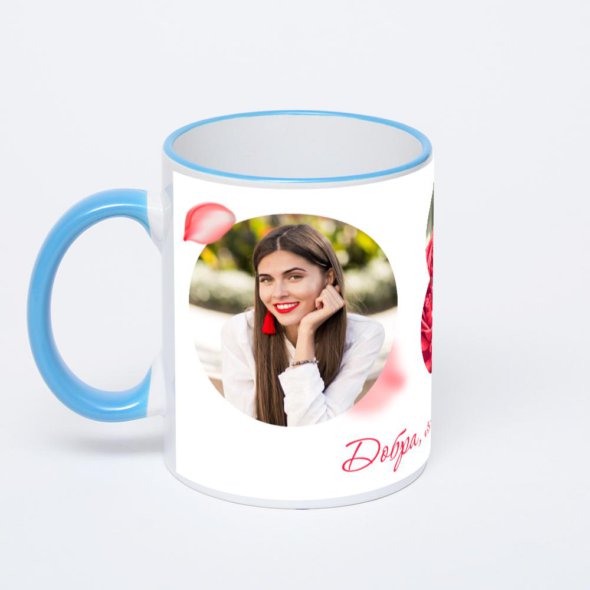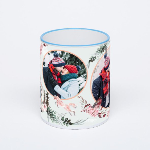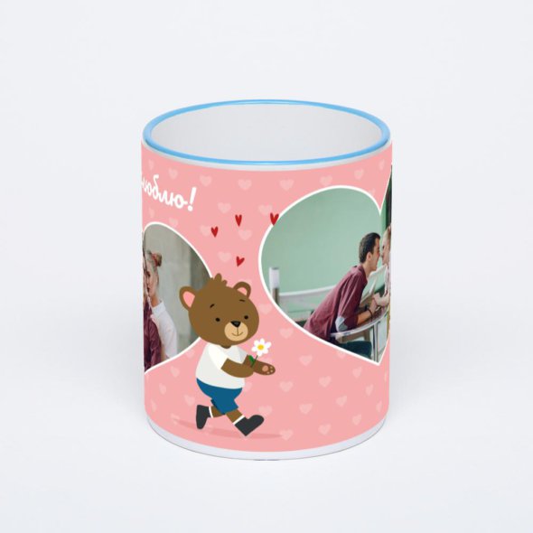 Керамическая кружка с синей ручкой и ободком с нанесением изображения. Кружка с вашим изображением – это уникальный и качественный подарок. Создать её вы можете прямо сейчас в редакторе, добавляя фотографии, стикеры и надписи.
