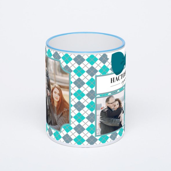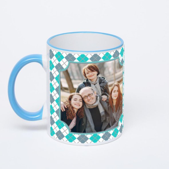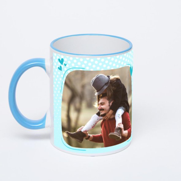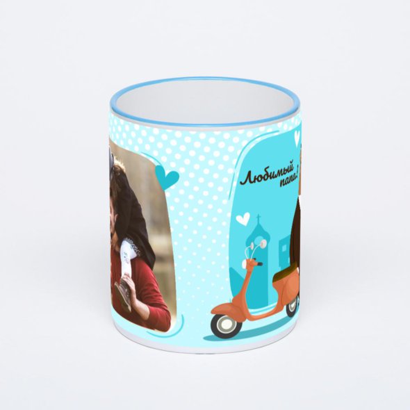 Керамическая кружка с синей ручкой и ободком с нанесением изображения. Кружка с вашим изображением – это уникальный и качественный подарок. Создать её вы можете прямо сейчас в редакторе, добавляя фотографии, стикеры и надписи.