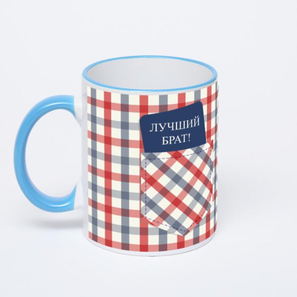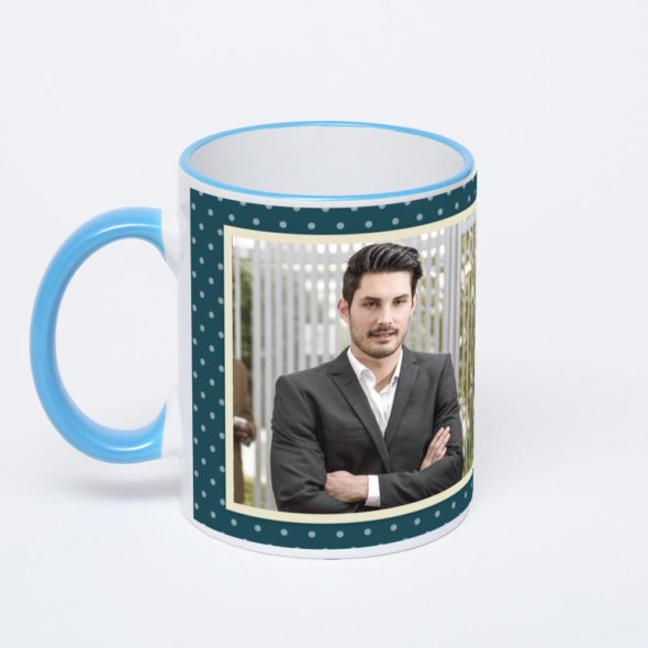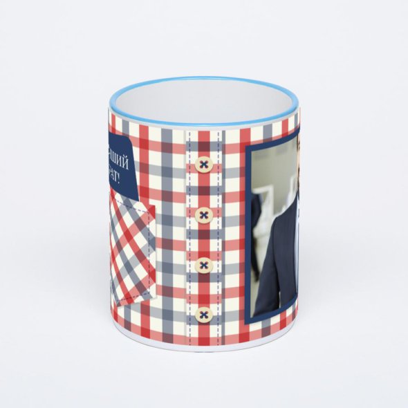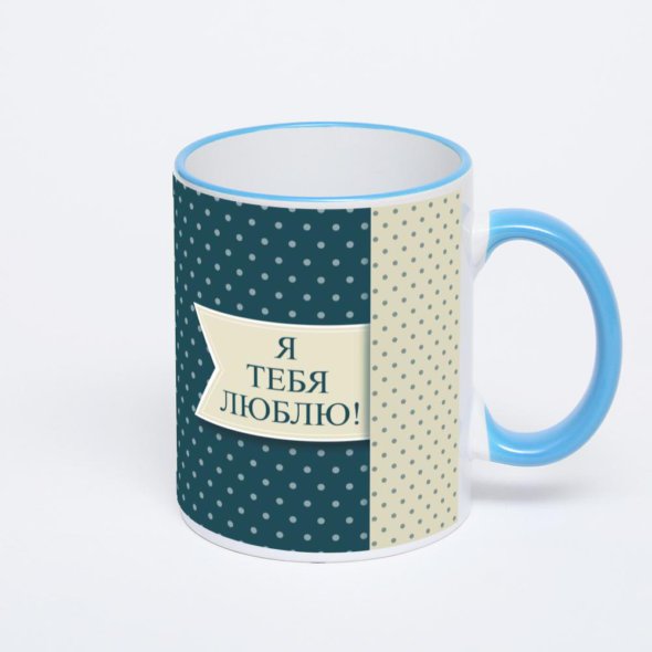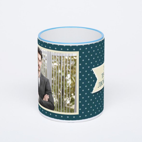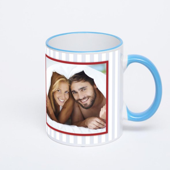 Керамическая кружка с синей ручкой и ободком с нанесением изображения. Кружка с вашим изображением – это уникальный и качественный подарок. Создать её вы можете прямо сейчас в редакторе, добавляя фотографии, стикеры и надписи.