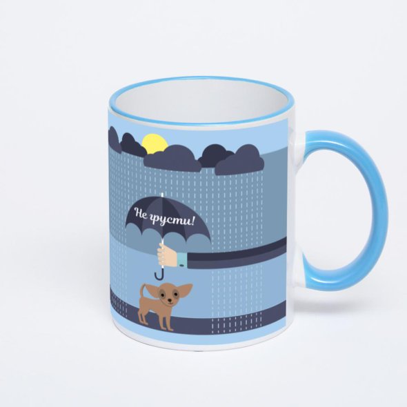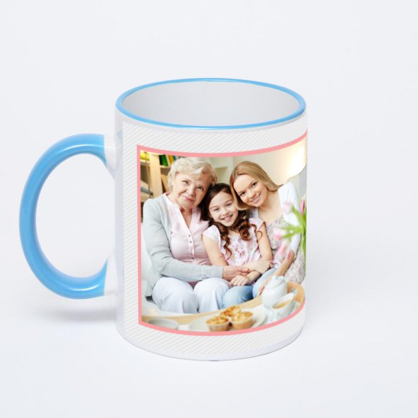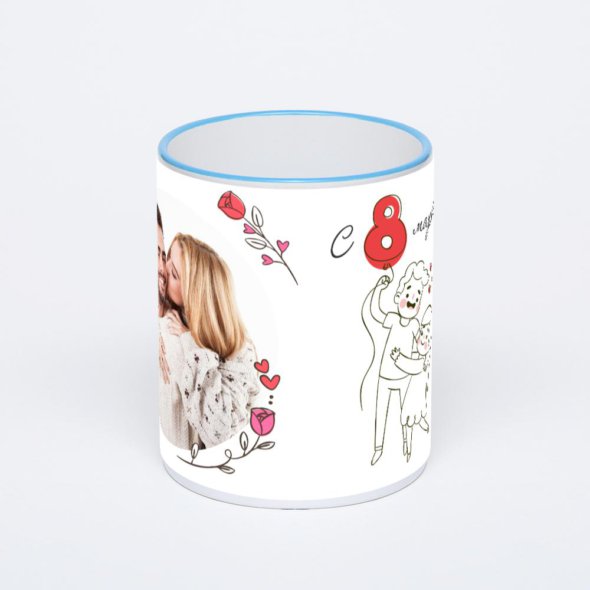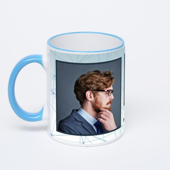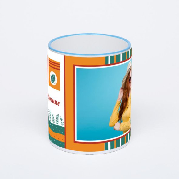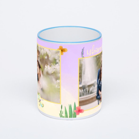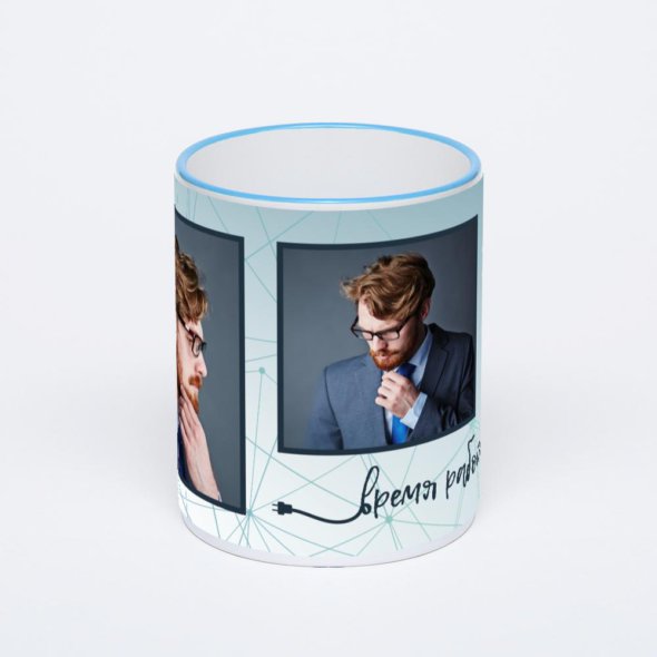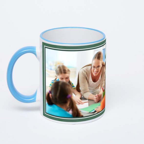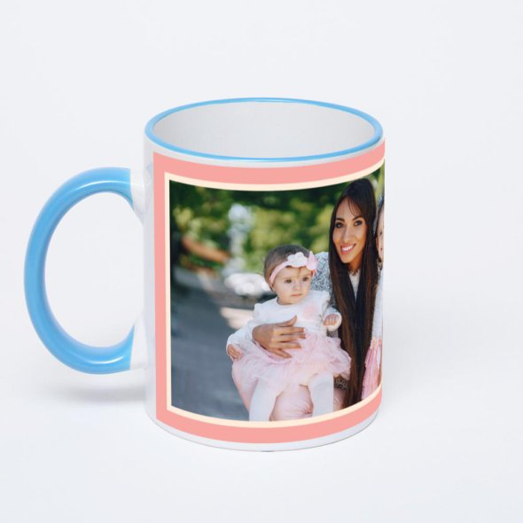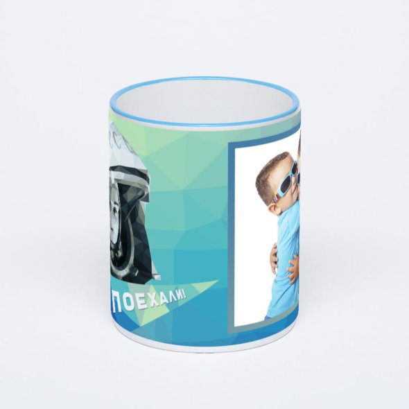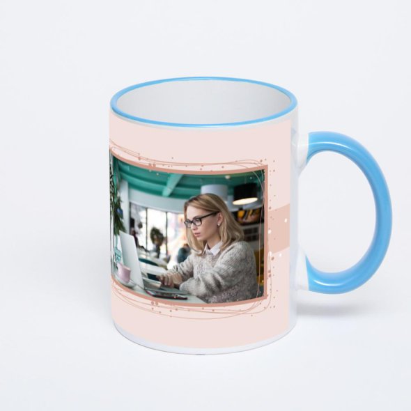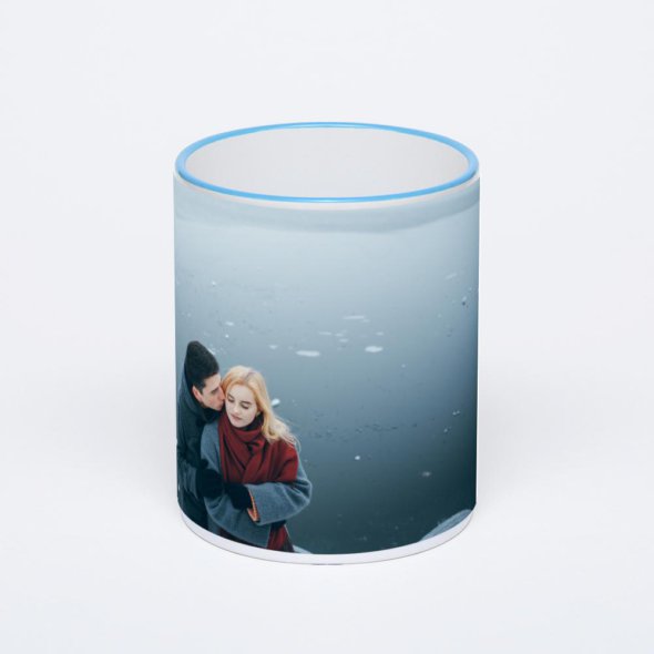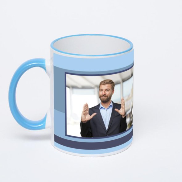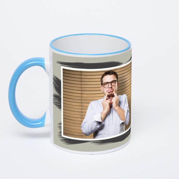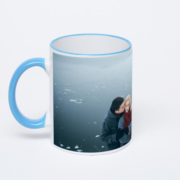 Керамическая кружка с синей ручкой и ободком с нанесением изображения. Кружка с вашим изображением – это уникальный и качественный подарок. Создать её вы можете прямо сейчас в редакторе, добавляя фотографии, стикеры и надписи.