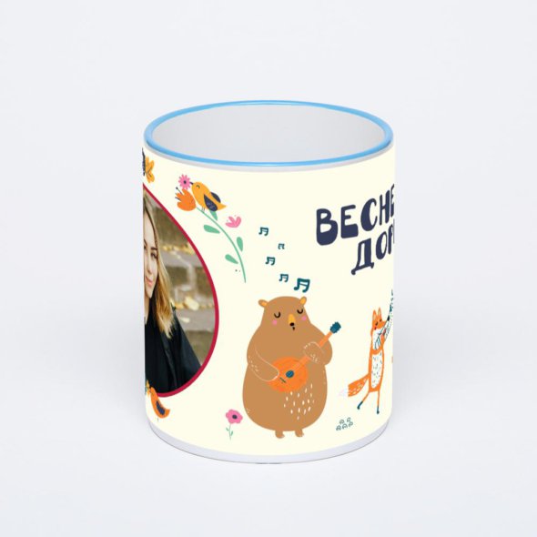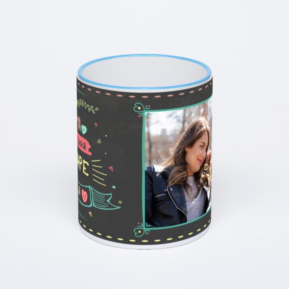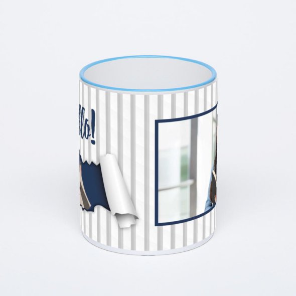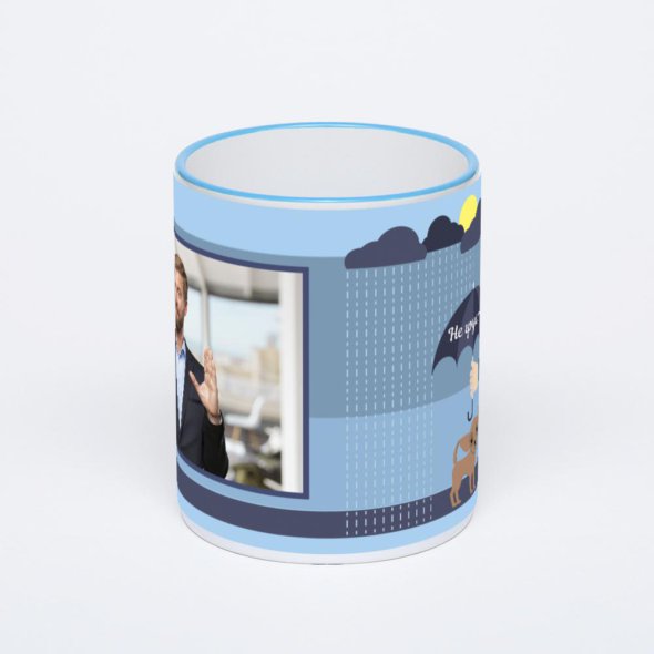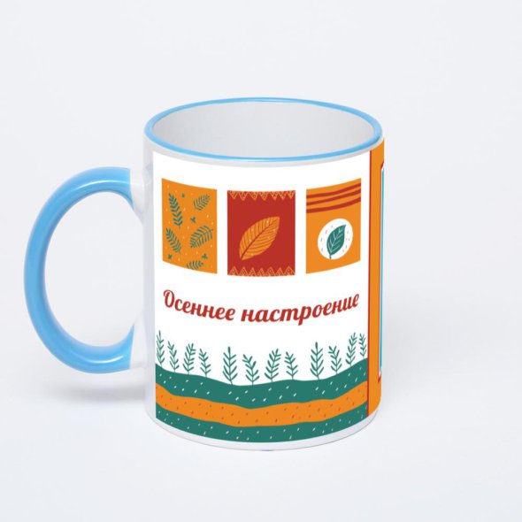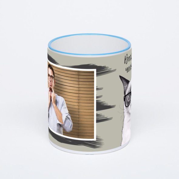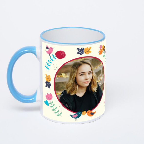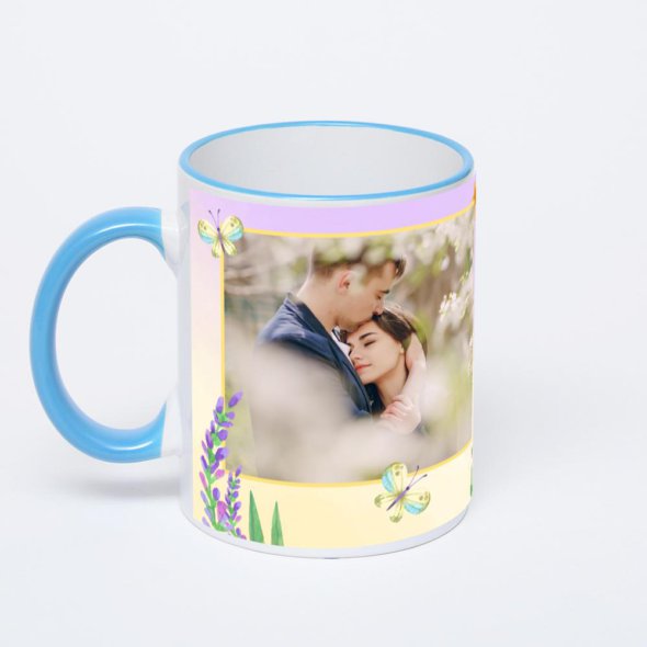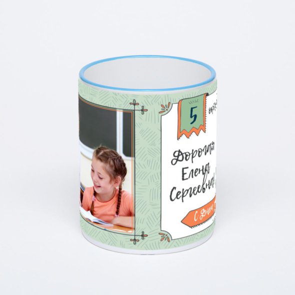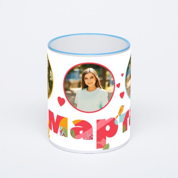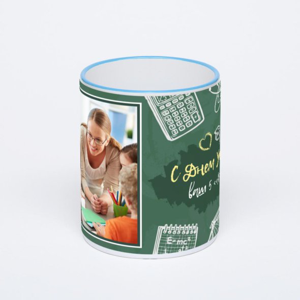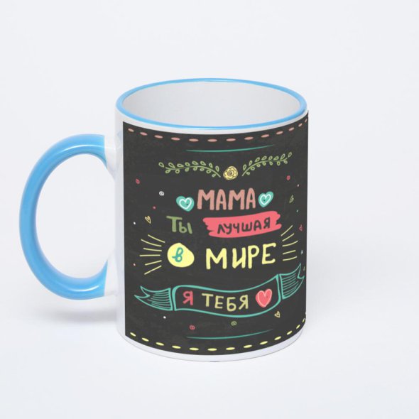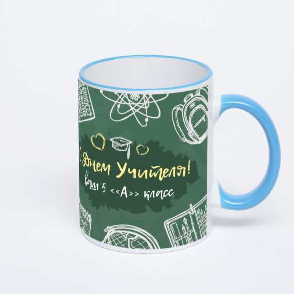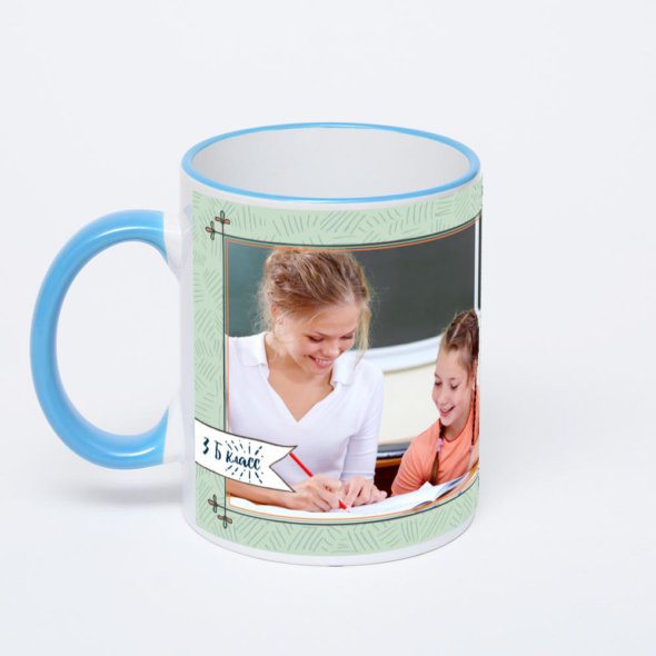 Керамическая кружка с синей ручкой и ободком с нанесением изображения. Кружка с вашим изображением – это уникальный и качественный подарок. Создать её вы можете прямо сейчас в редакторе, добавляя фотографии, стикеры и надписи.