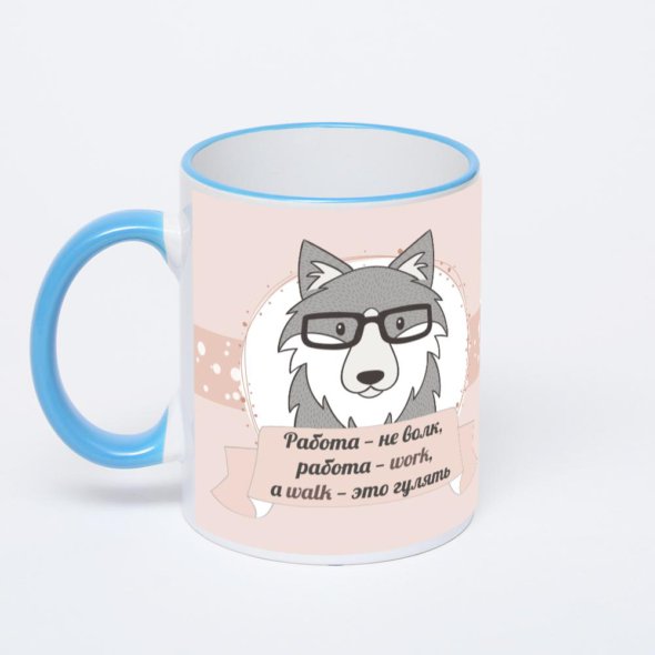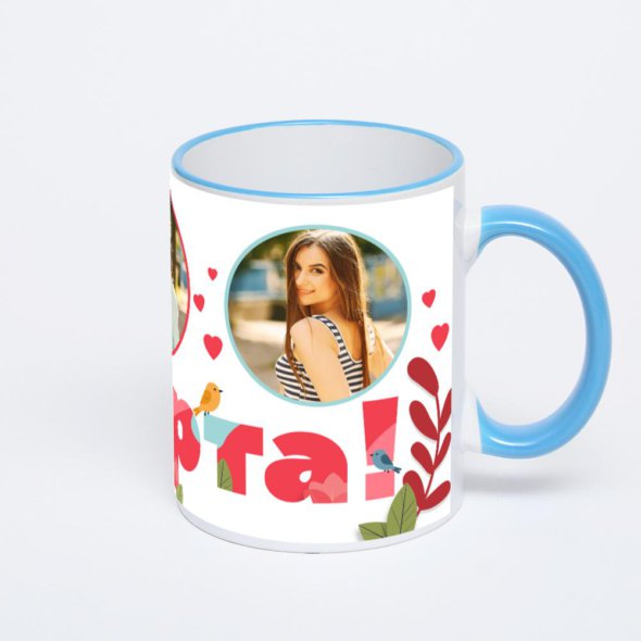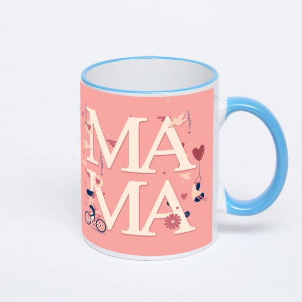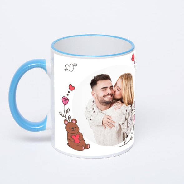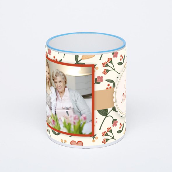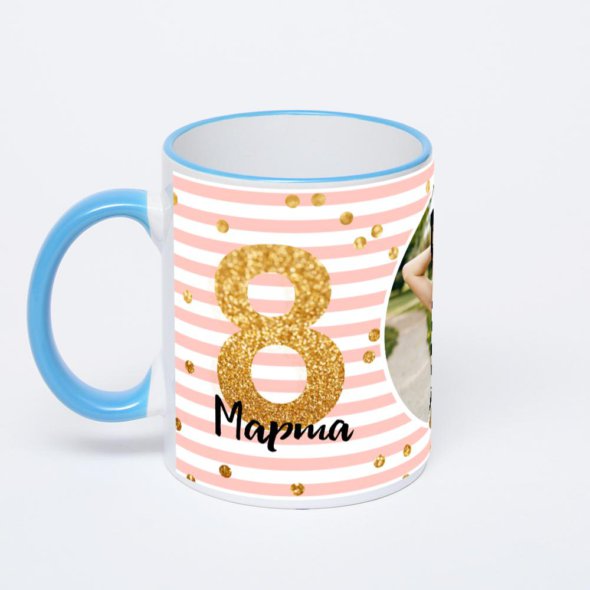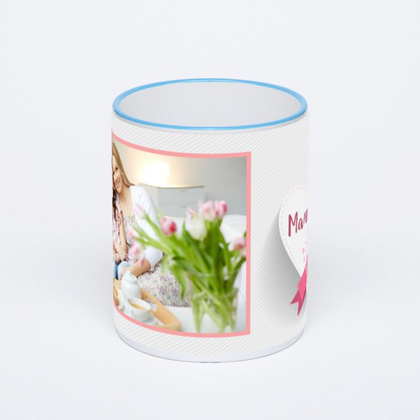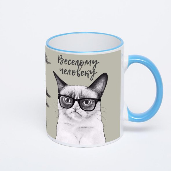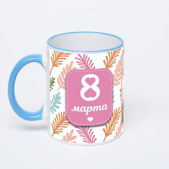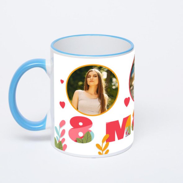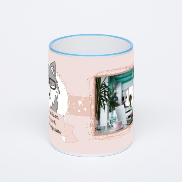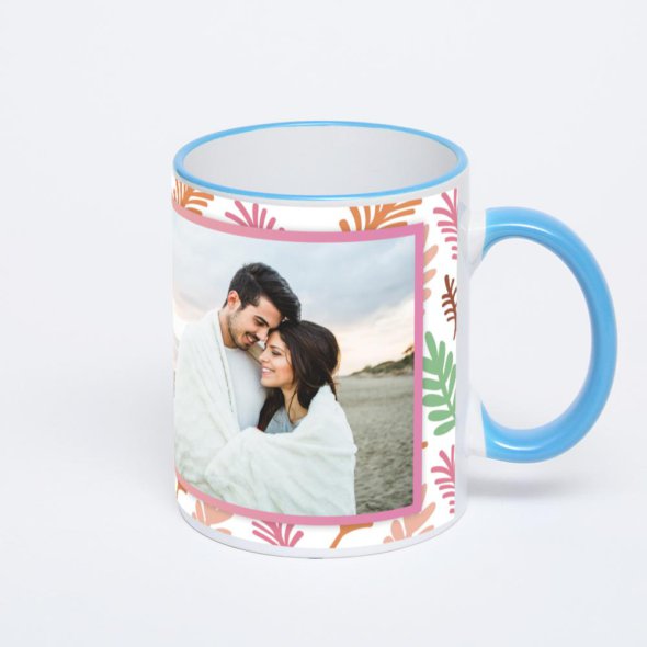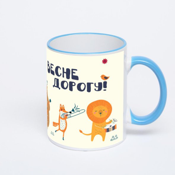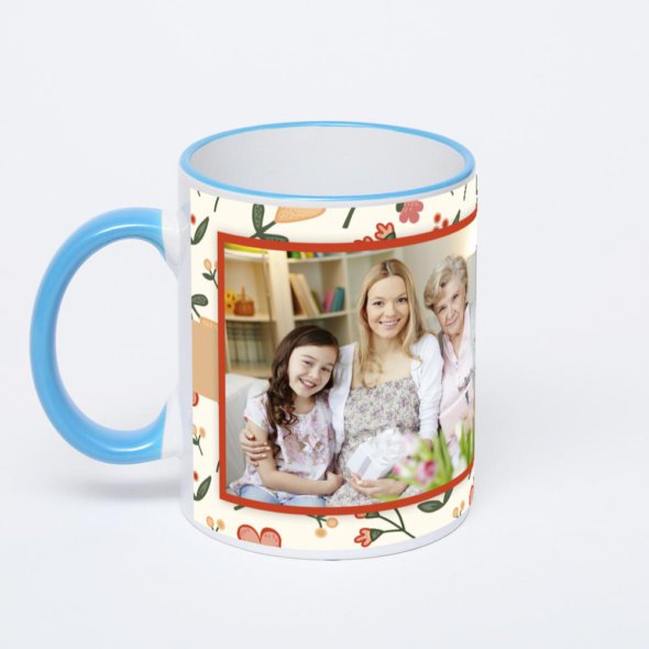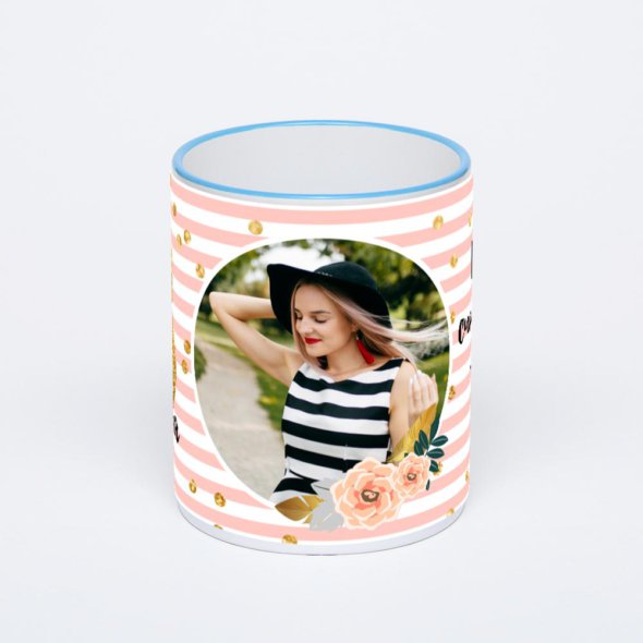 Керамическая кружка с синей ручкой и ободком с нанесением изображения. Кружка с вашим изображением – это уникальный и качественный подарок. Создать её вы можете прямо сейчас в редакторе, добавляя фотографии, стикеры и надписи.