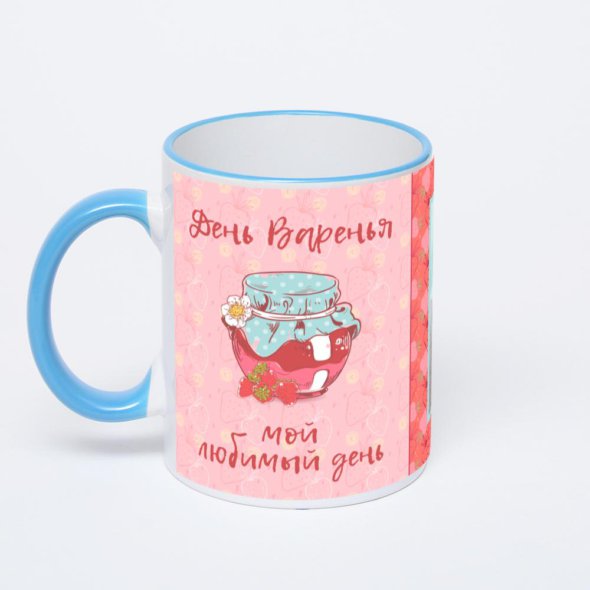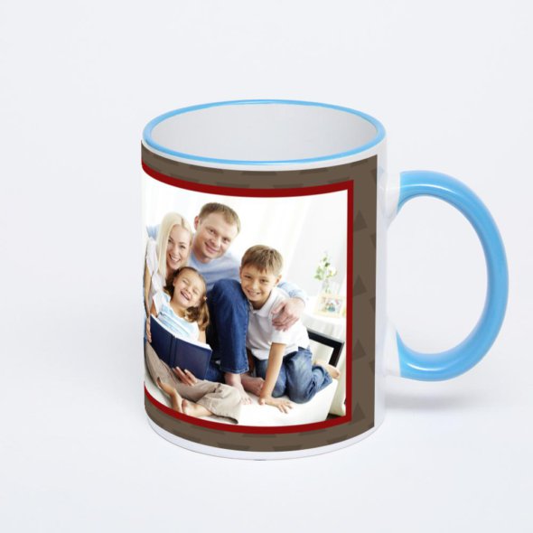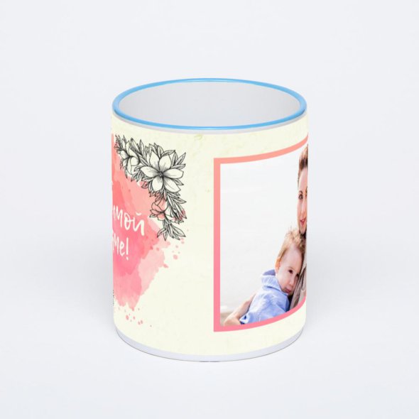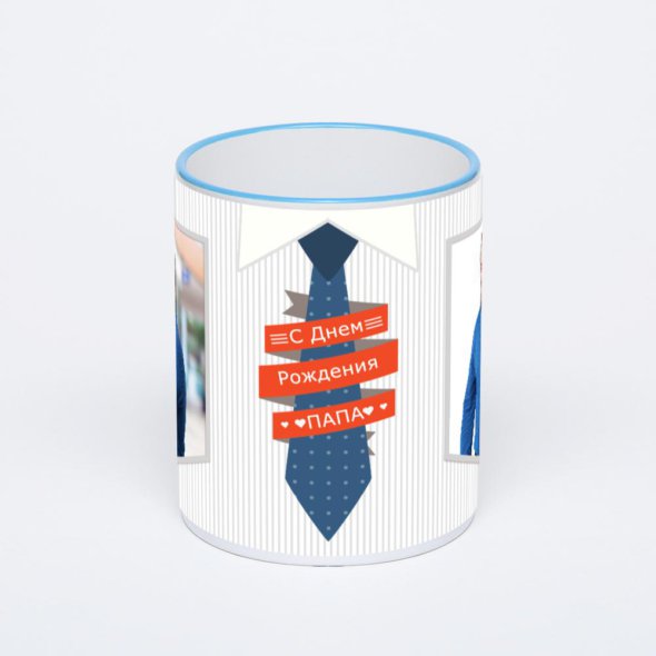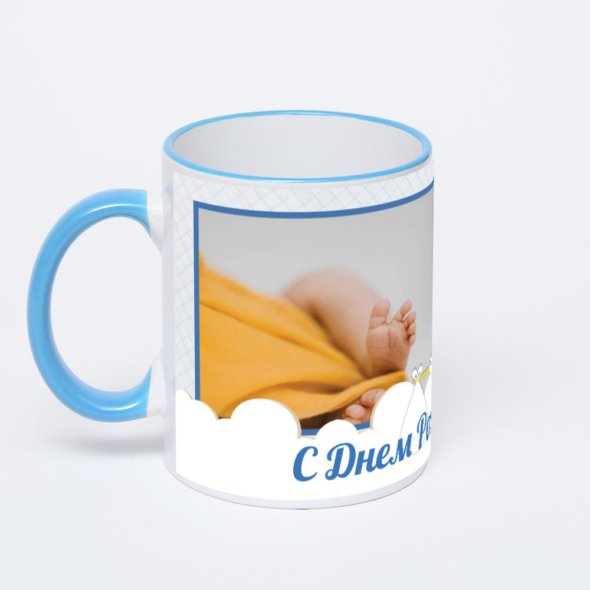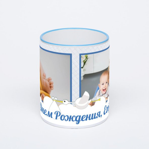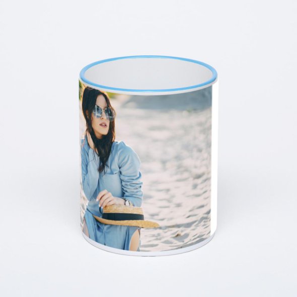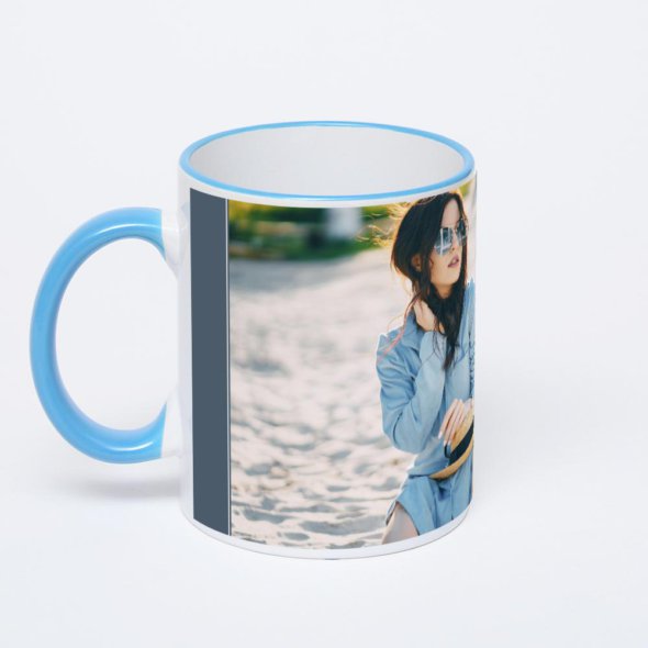Керамическая кружка с синей ручкой и ободком с нанесением изображения. Кружка с вашим изображением – это уникальный и качественный подарок. Создать её вы можете прямо сейчас в редакторе, добавляя фотографии, стикеры и надписи.