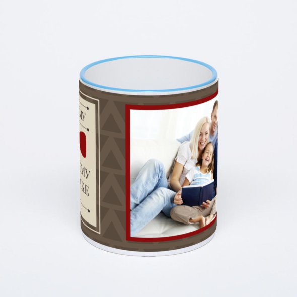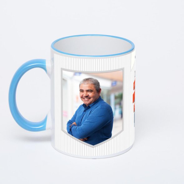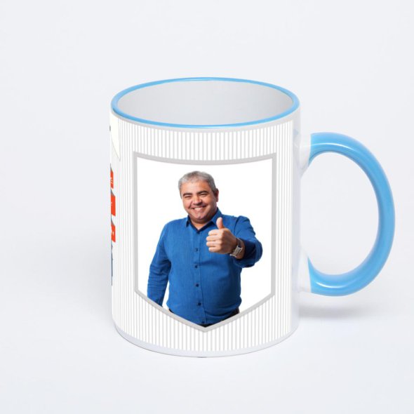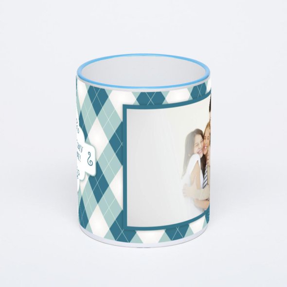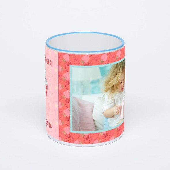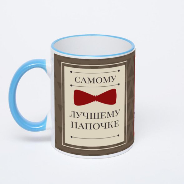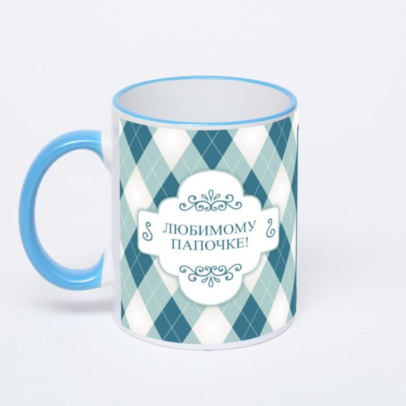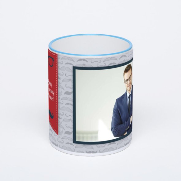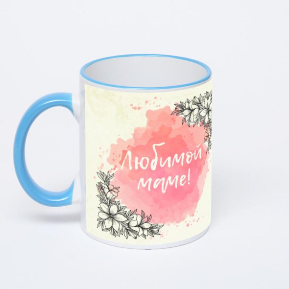 Керамическая кружка с синей ручкой и ободком с нанесением изображения. Кружка с вашим изображением – это уникальный и качественный подарок. Создать её вы можете прямо сейчас в редакторе, добавляя фотографии, стикеры и надписи.