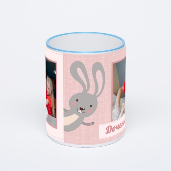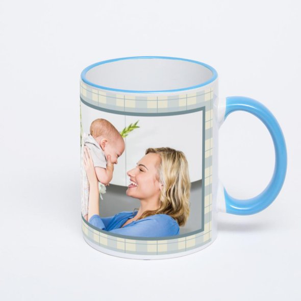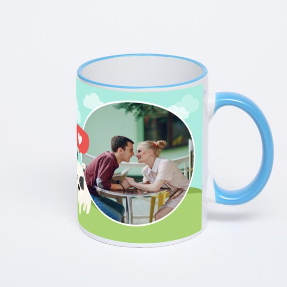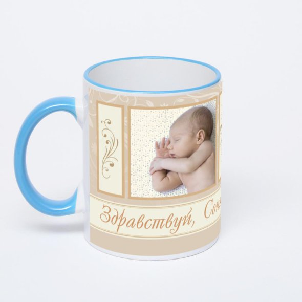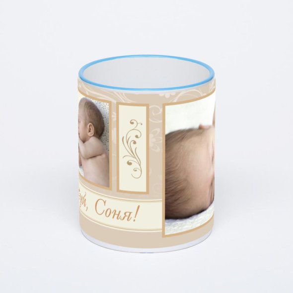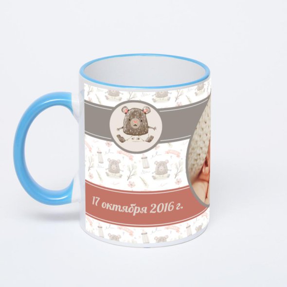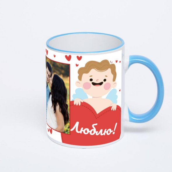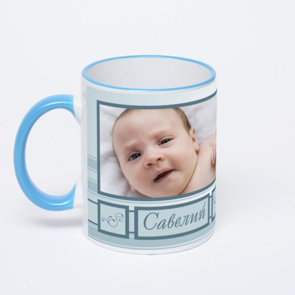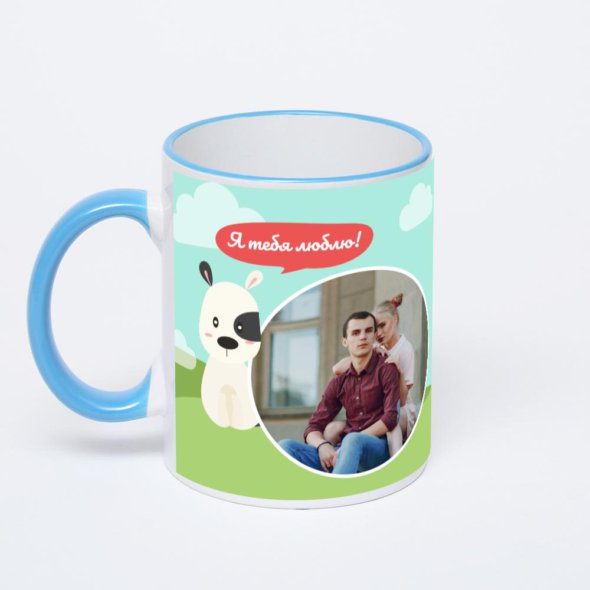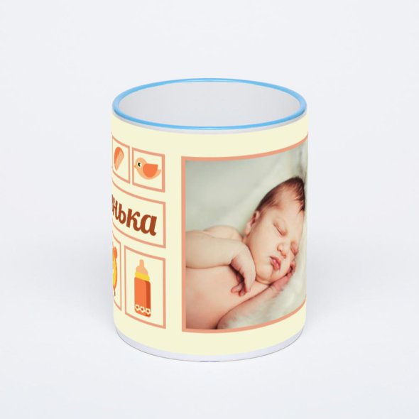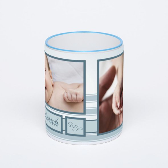 Керамическая кружка с синей ручкой и ободком с нанесением изображения. Кружка с вашим изображением – это уникальный и качественный подарок. Создать её вы можете прямо сейчас в редакторе, добавляя фотографии, стикеры и надписи.