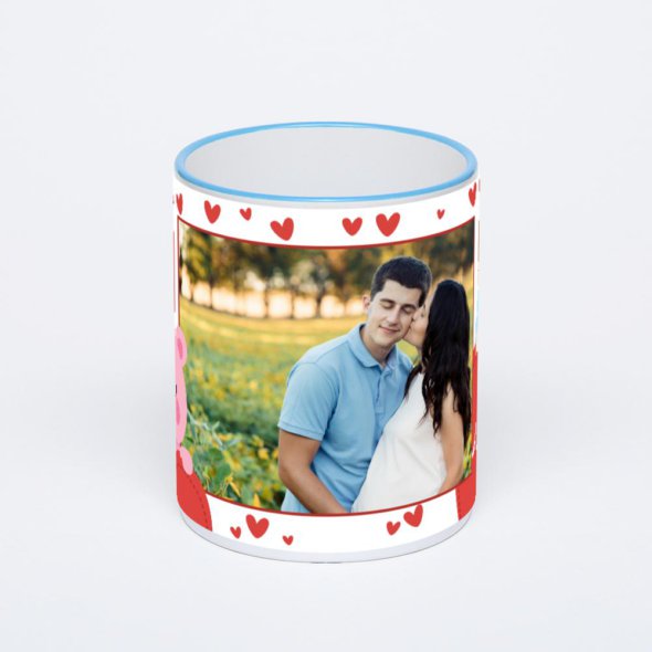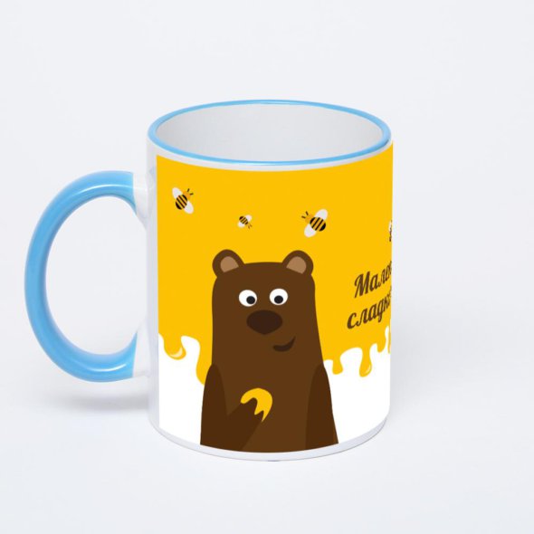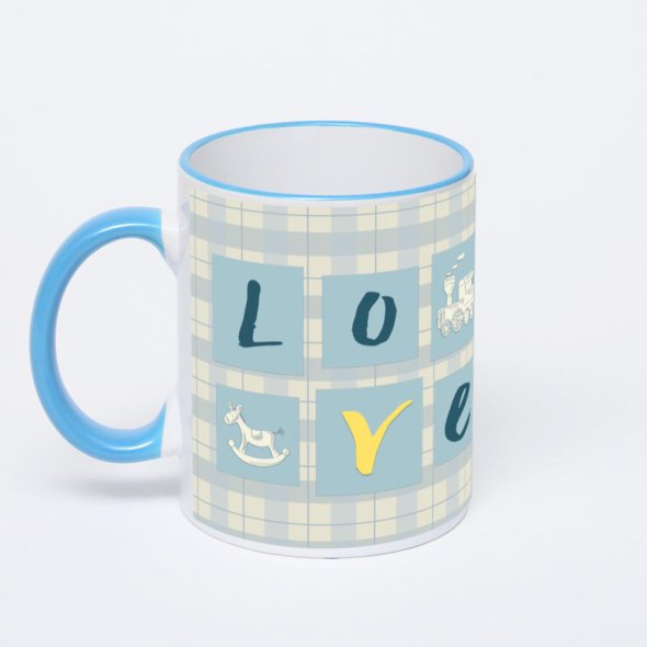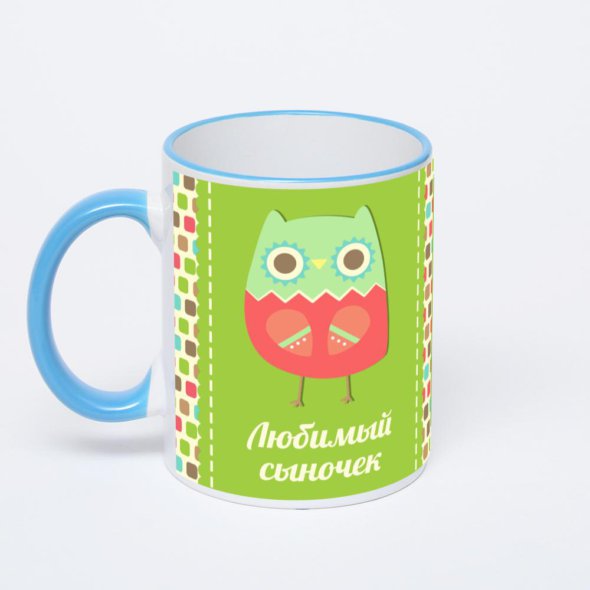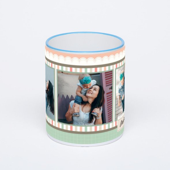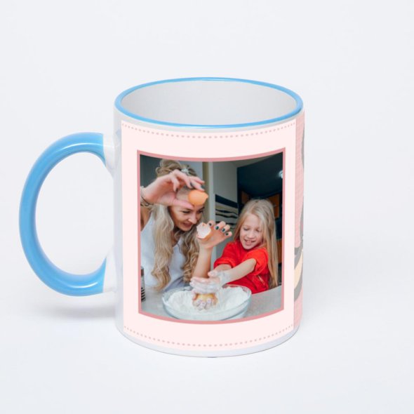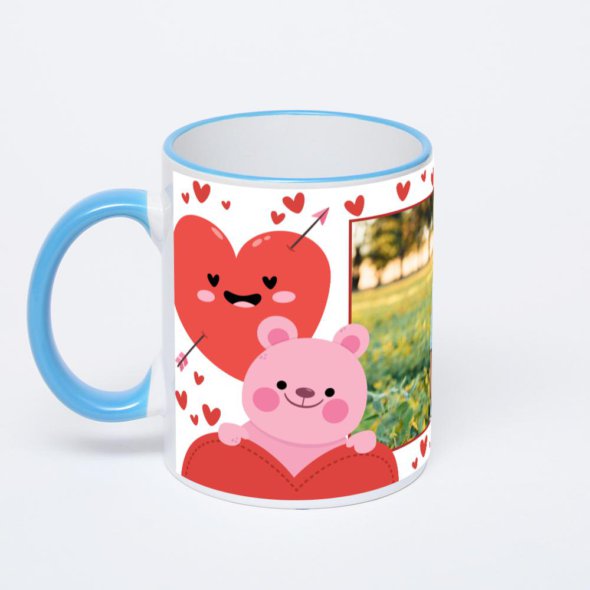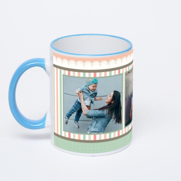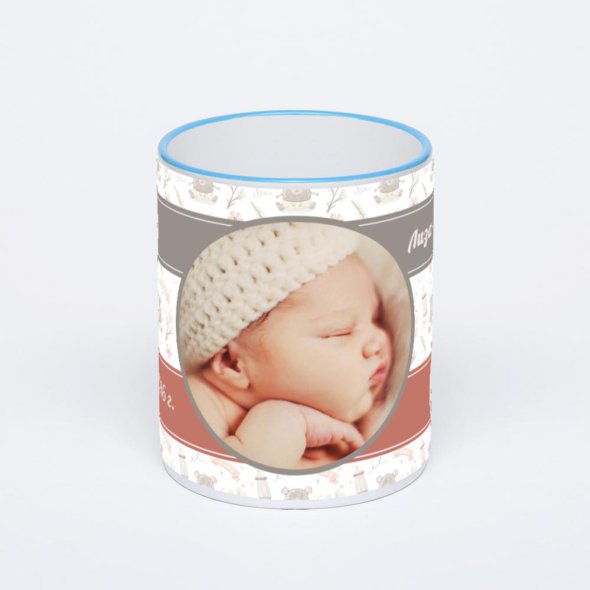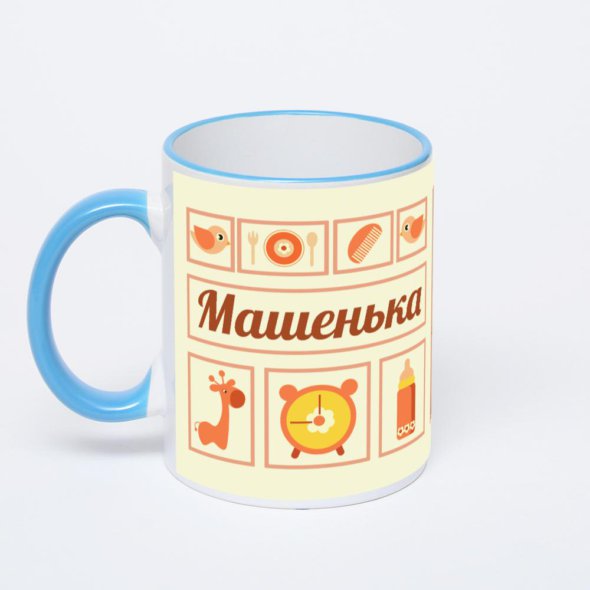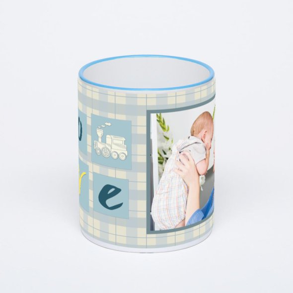 Керамическая кружка с синей ручкой и ободком с нанесением изображения. Кружка с вашим изображением – это уникальный и качественный подарок. Создать её вы можете прямо сейчас в редакторе, добавляя фотографии, стикеры и надписи.