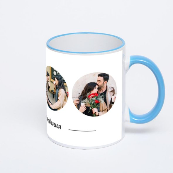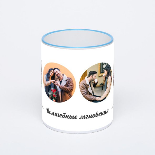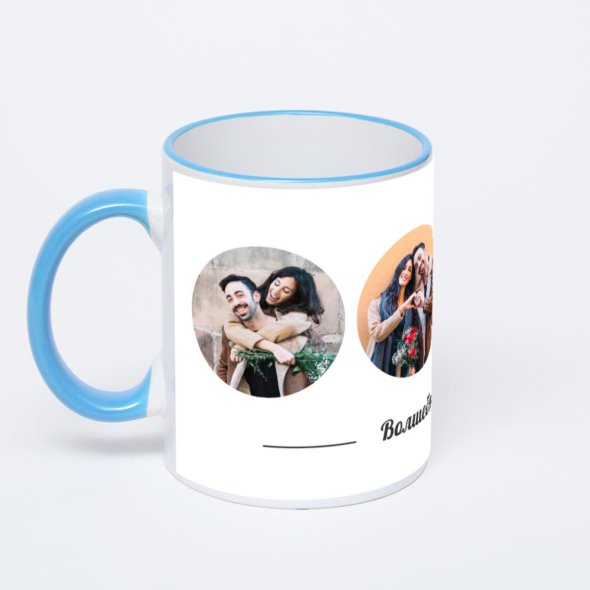 Керамическая кружка с синей ручкой и ободком с нанесением изображения. Кружка с вашим изображением – это уникальный и качественный подарок. Создать её вы можете прямо сейчас в редакторе, добавляя фотографии, стикеры и надписи.
