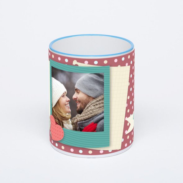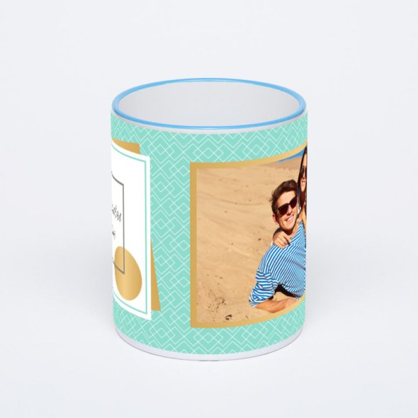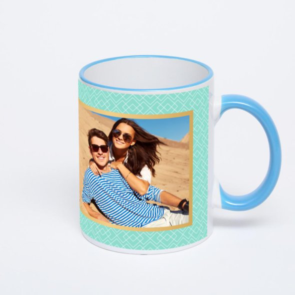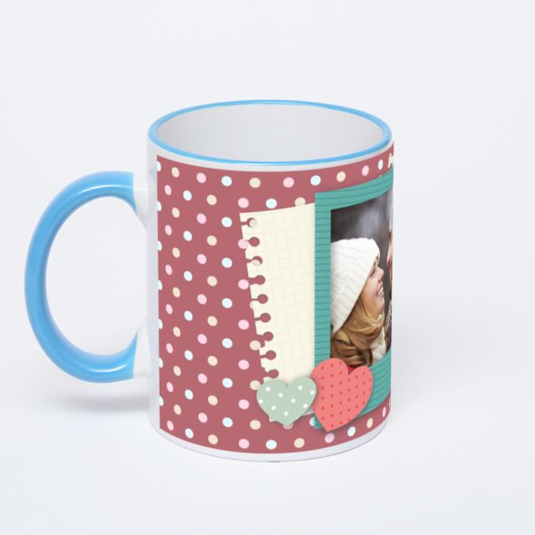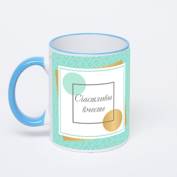 Керамическая кружка с синей ручкой и ободком с нанесением изображения. Кружка с вашим изображением – это уникальный и качественный подарок. Создать её вы можете прямо сейчас в редакторе, добавляя фотографии, стикеры и надписи.