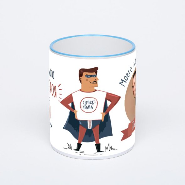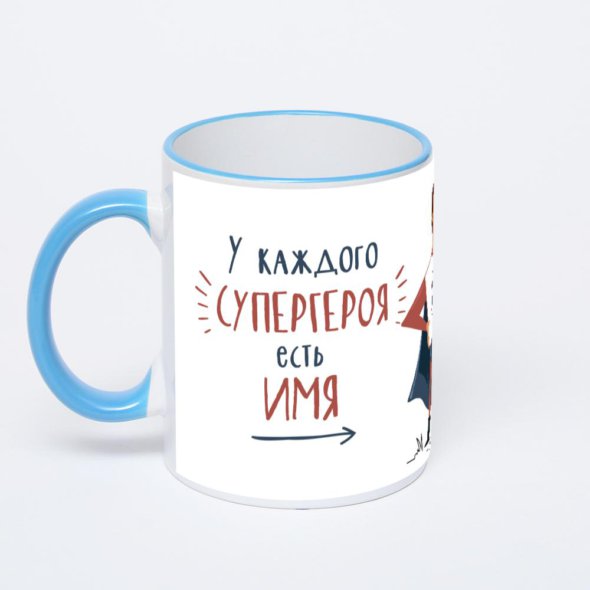Керамическая кружка с синей ручкой и ободком с нанесением изображения. Кружка с вашим изображением – это уникальный и качественный подарок. Создать её вы можете прямо сейчас в редакторе, добавляя фотографии, стикеры и надписи.