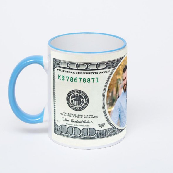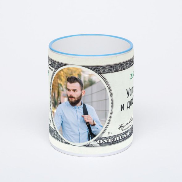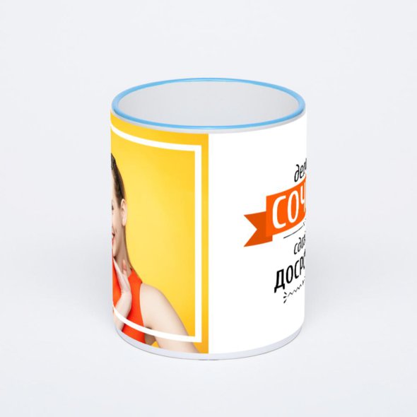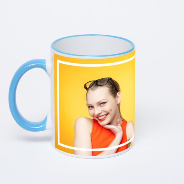 Керамическая кружка с синей ручкой и ободком с нанесением изображения. Кружка с вашим изображением – это уникальный и качественный подарок. Создать её вы можете прямо сейчас в редакторе, добавляя фотографии, стикеры и надписи.
