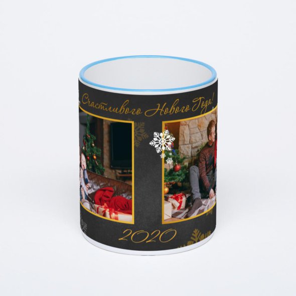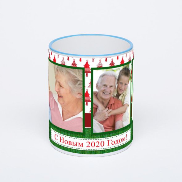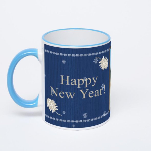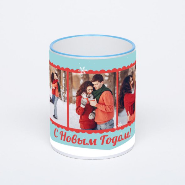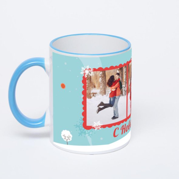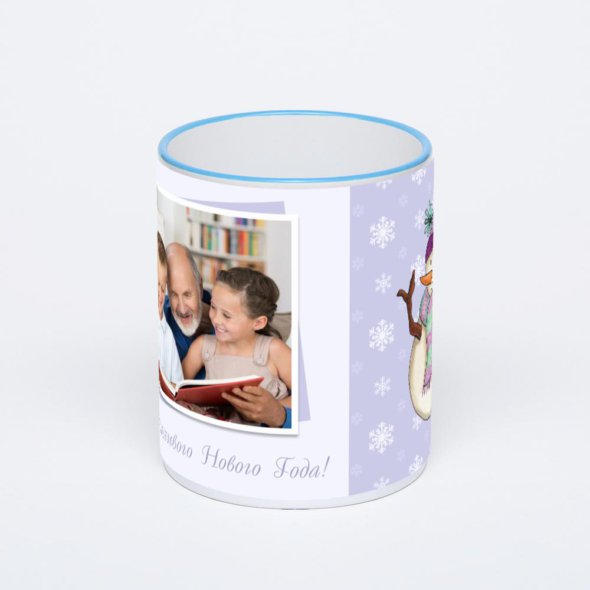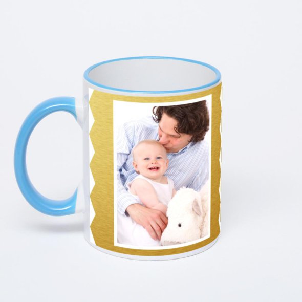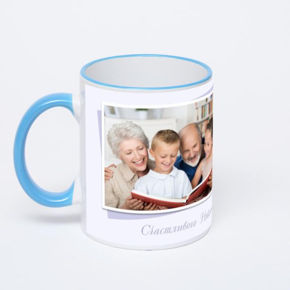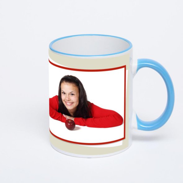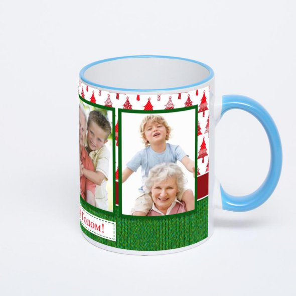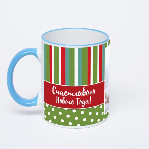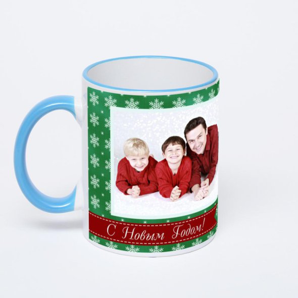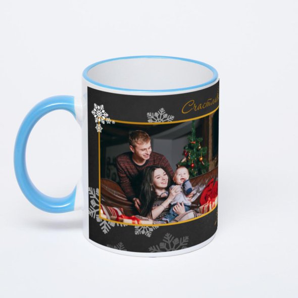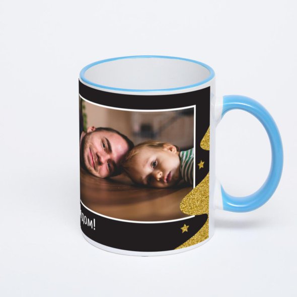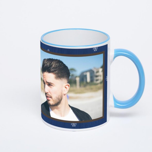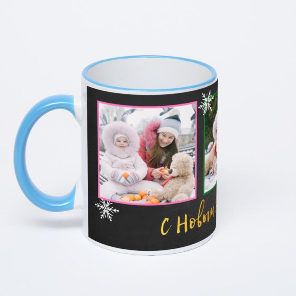 Керамическая кружка с синей ручкой и ободком с нанесением изображения. Кружка с вашим изображением – это уникальный и качественный подарок. Создать её вы можете прямо сейчас в редакторе, добавляя фотографии, стикеры и надписи.