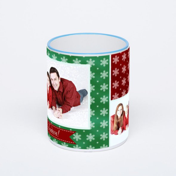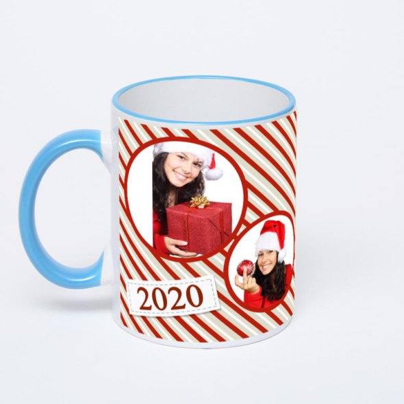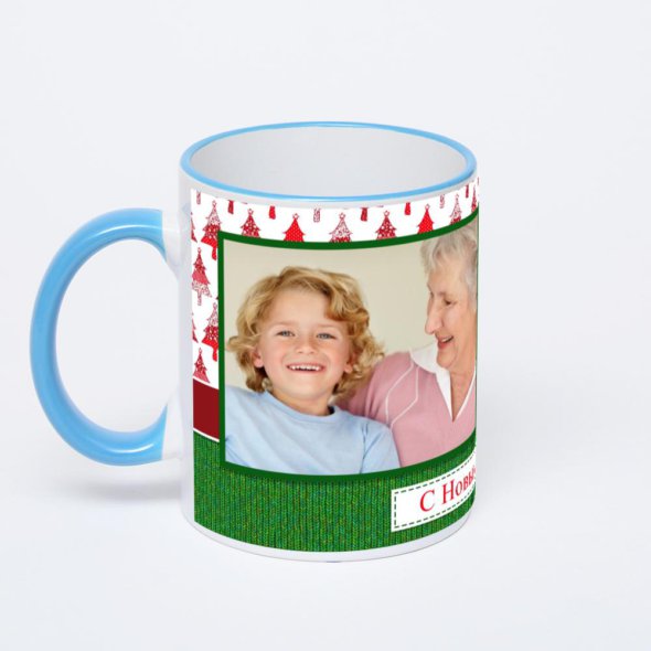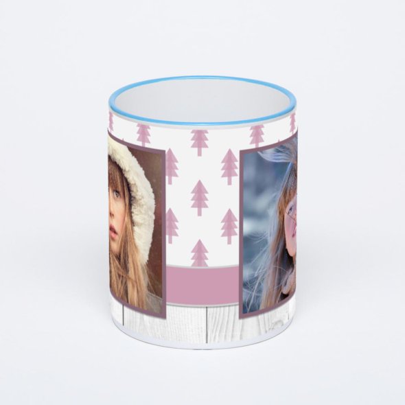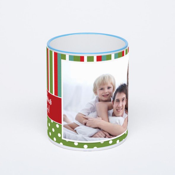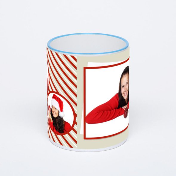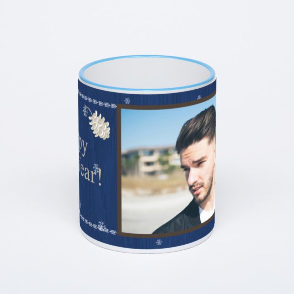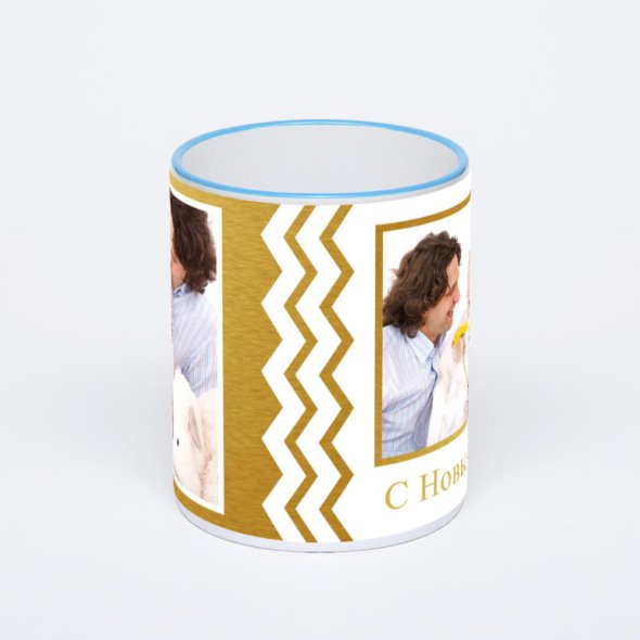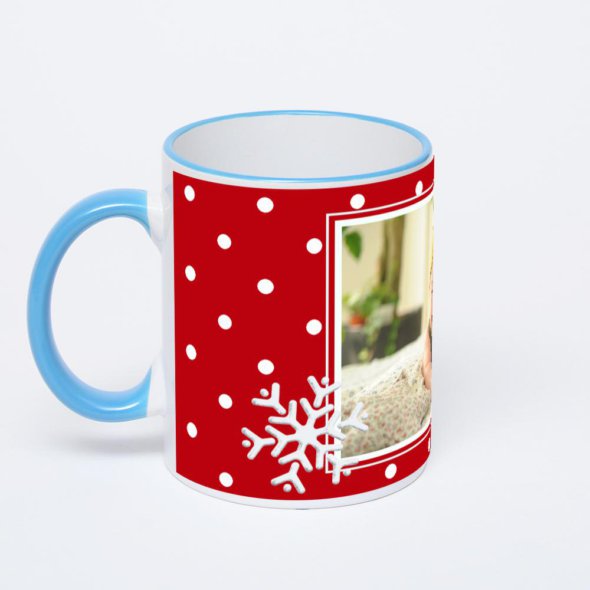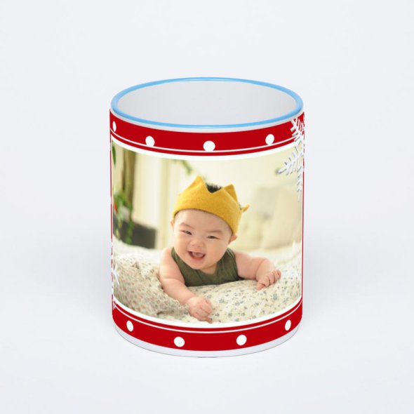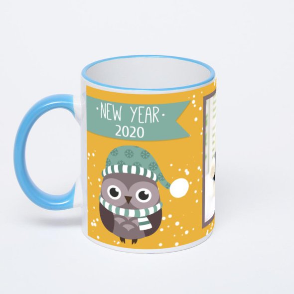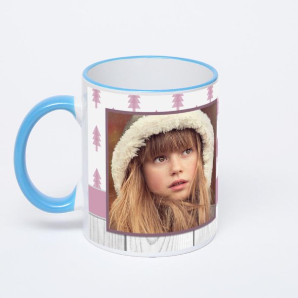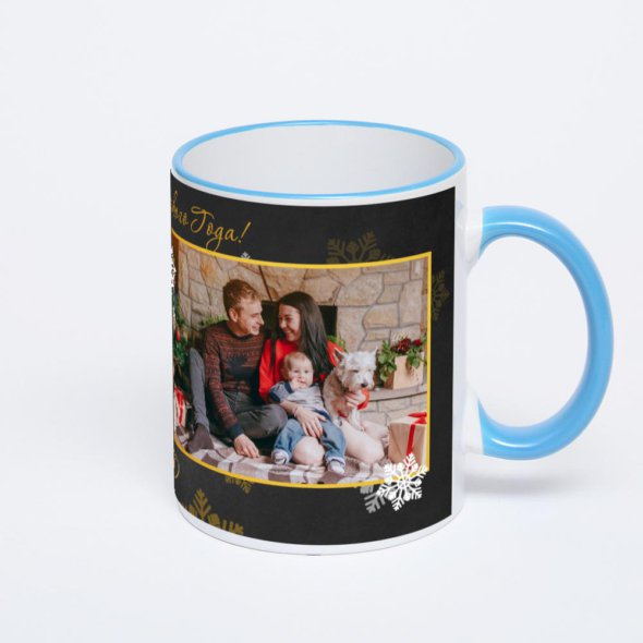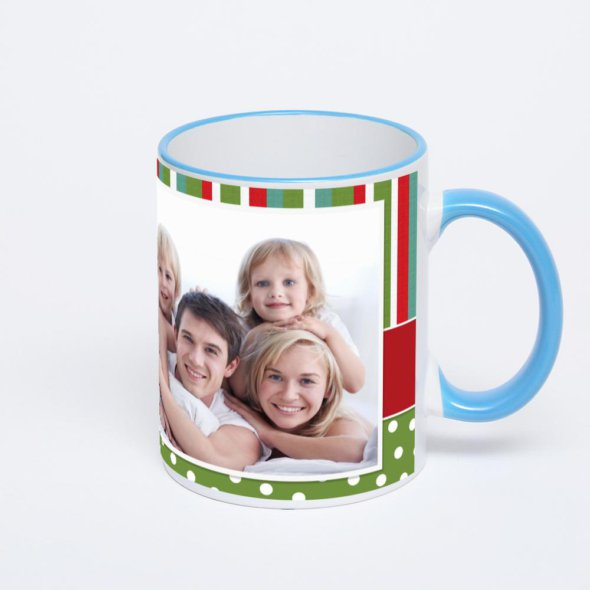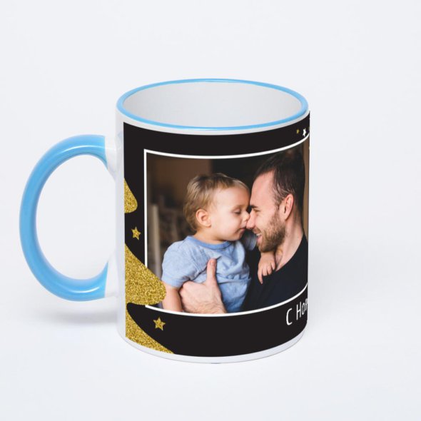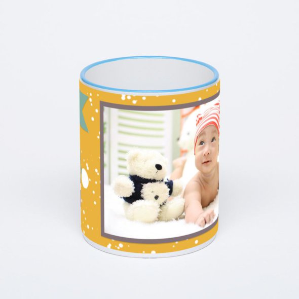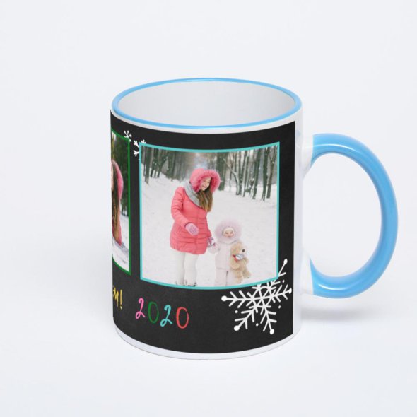 Керамическая кружка с синей ручкой и ободком с нанесением изображения. Кружка с вашим изображением – это уникальный и качественный подарок. Создать её вы можете прямо сейчас в редакторе, добавляя фотографии, стикеры и надписи.