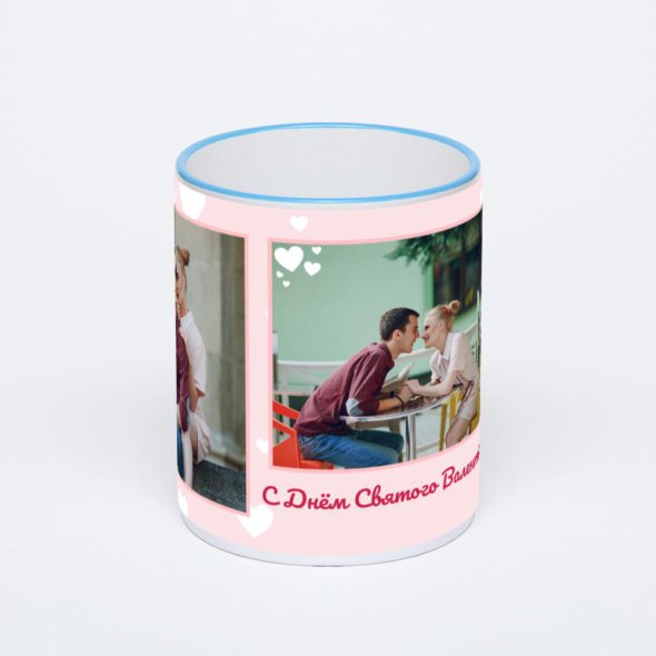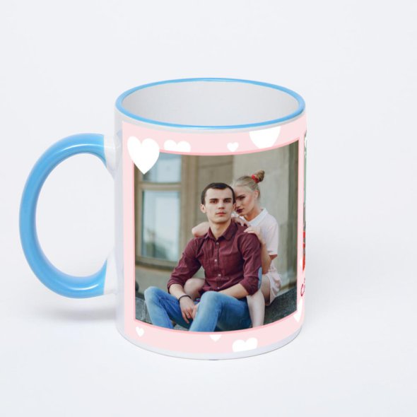 Керамическая кружка с синей ручкой и ободком с нанесением изображения. Кружка с вашим изображением – это уникальный и качественный подарок. Создать её вы можете прямо сейчас в редакторе, добавляя фотографии, стикеры и надписи.