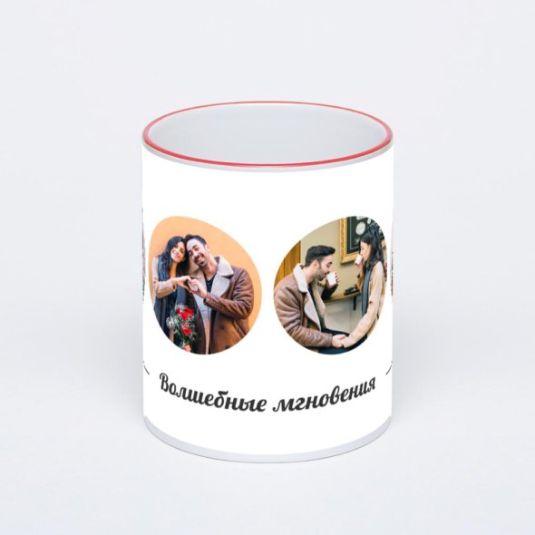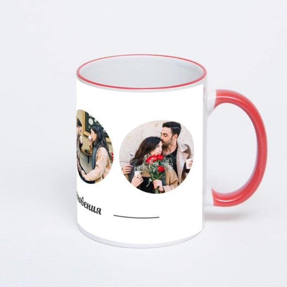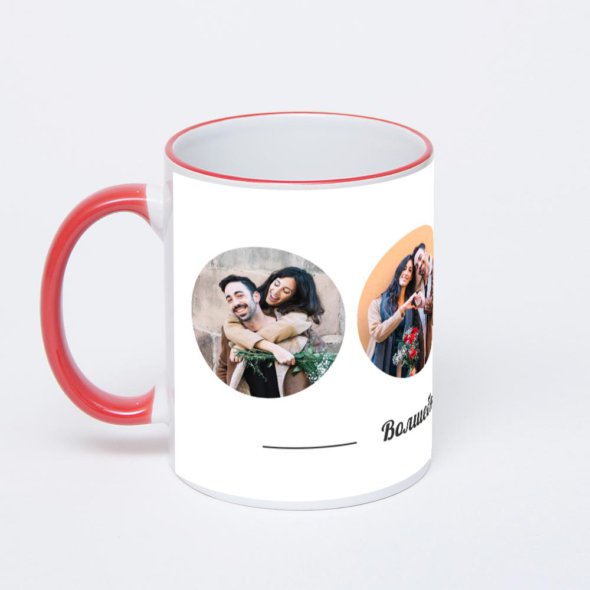 Керамическая кружка с красной ручкой и ободком с нанесением изображения. Кружка с вашим изображением – это уникальный и качественный подарок. Создать её вы можете прямо сейчас в редакторе, добавляя фотографии, стикеры и надписи.