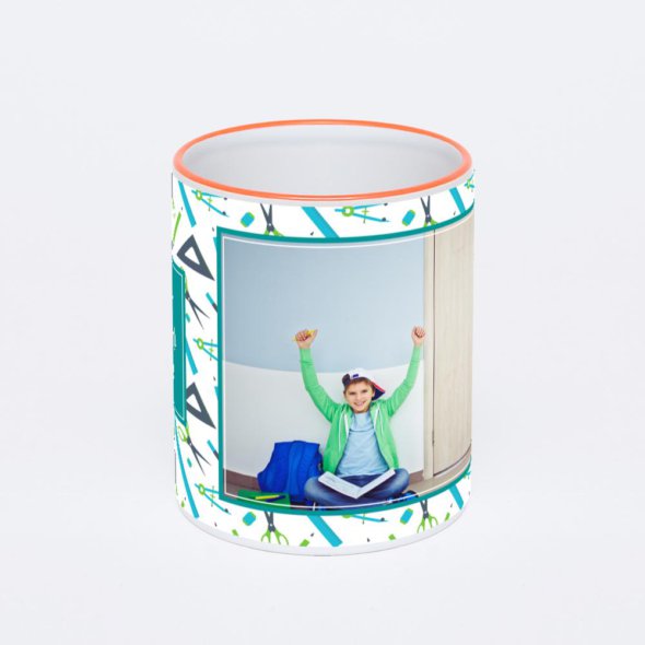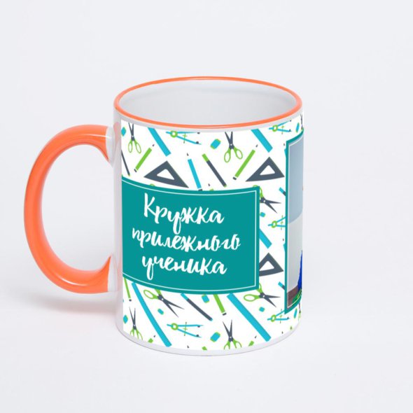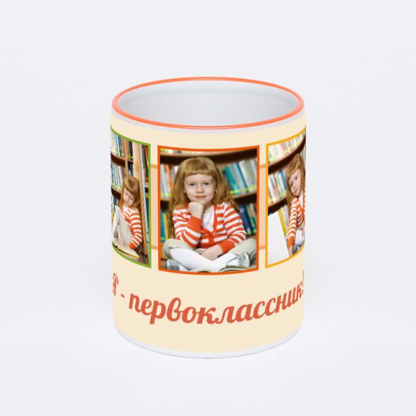 Керамическая кружка с оранжевой ручкой и ободком с нанесением изображения. Кружка с вашим изображением – это уникальный и качественный подарок. Создать её вы можете прямо сейчас в редакторе, добавляя фотографии, стикеры и надписи.