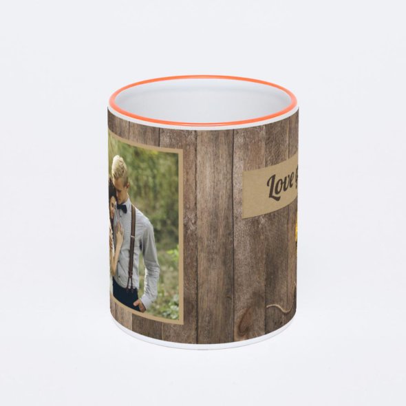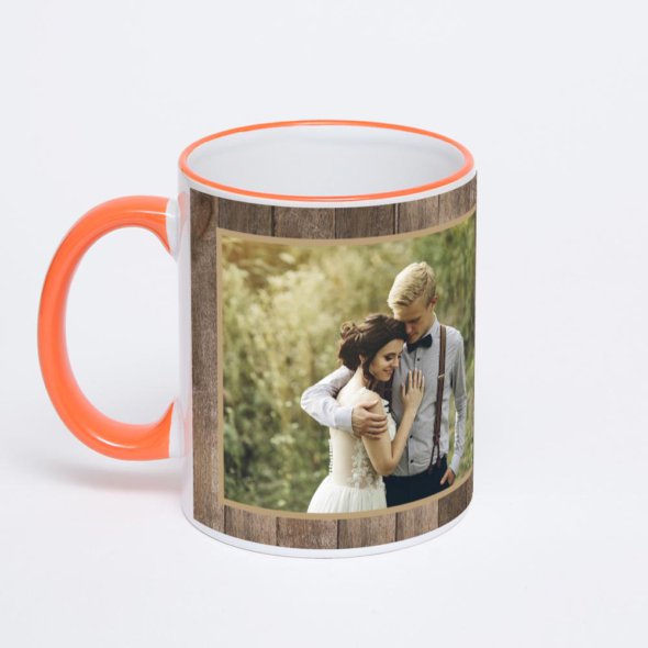 Керамическая кружка с оранжевой ручкой и ободком с нанесением изображения. Кружка с вашим изображением – это уникальный и качественный подарок. Создать её вы можете прямо сейчас в редакторе, добавляя фотографии, стикеры и надписи.