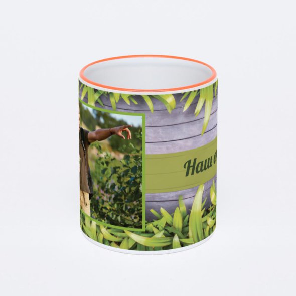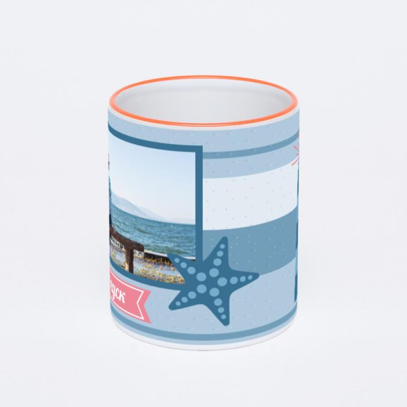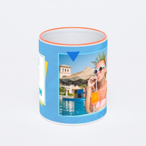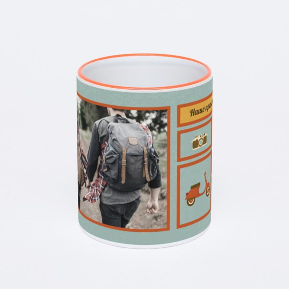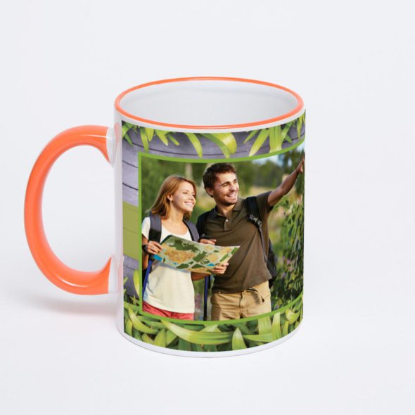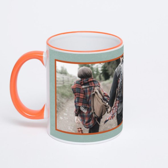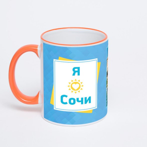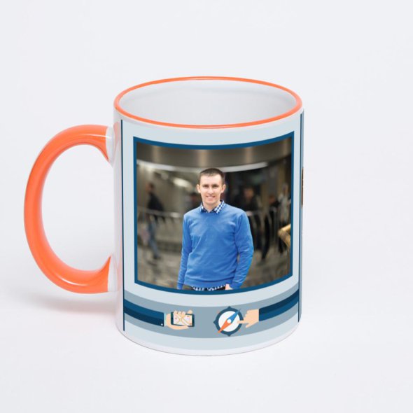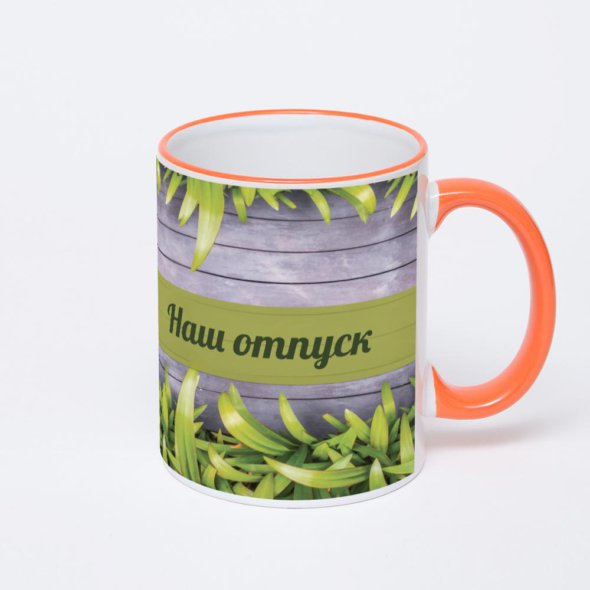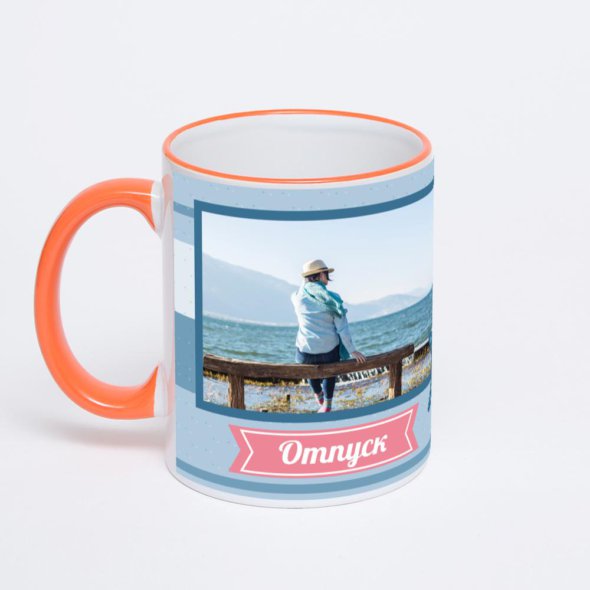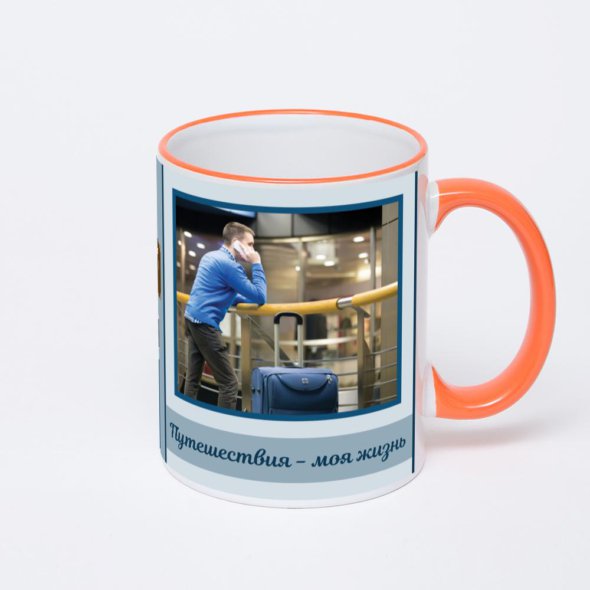 Керамическая кружка с оранжевой ручкой и ободком с нанесением изображения. Кружка с вашим изображением – это уникальный и качественный подарок. Создать её вы можете прямо сейчас в редакторе, добавляя фотографии, стикеры и надписи.