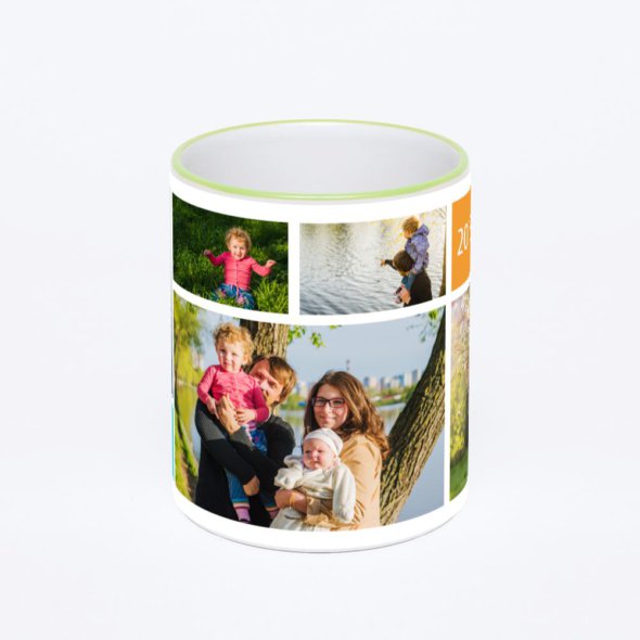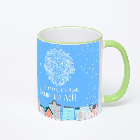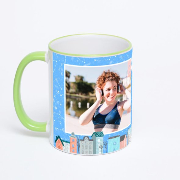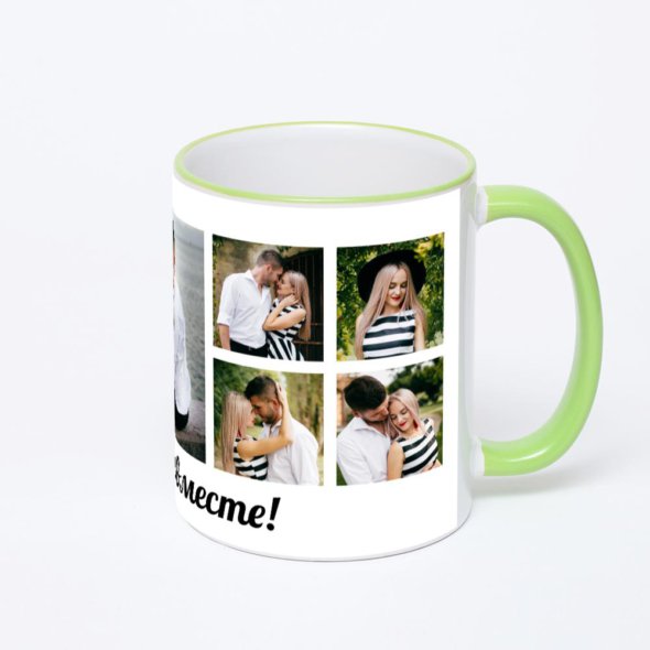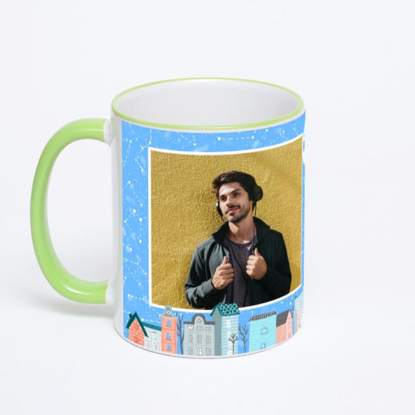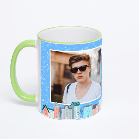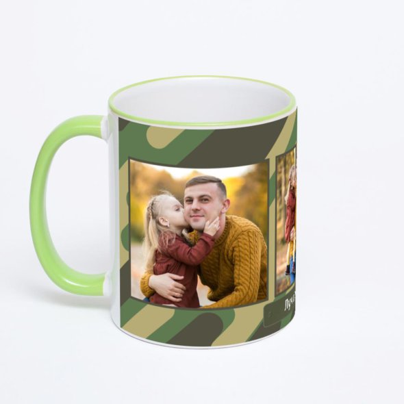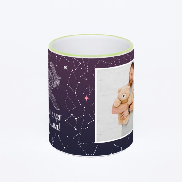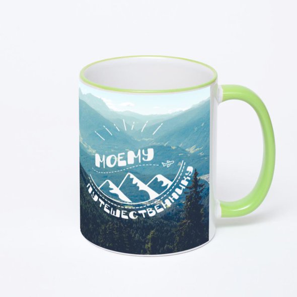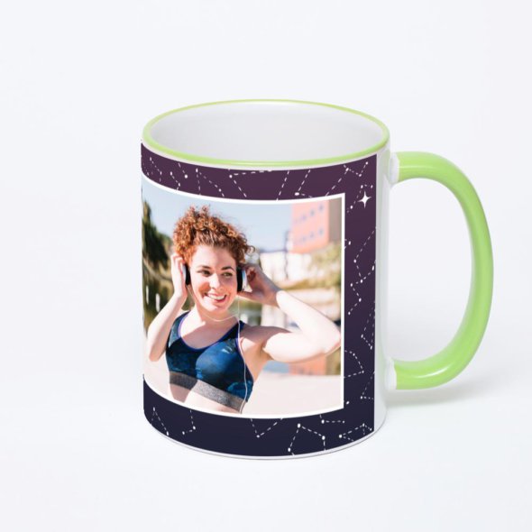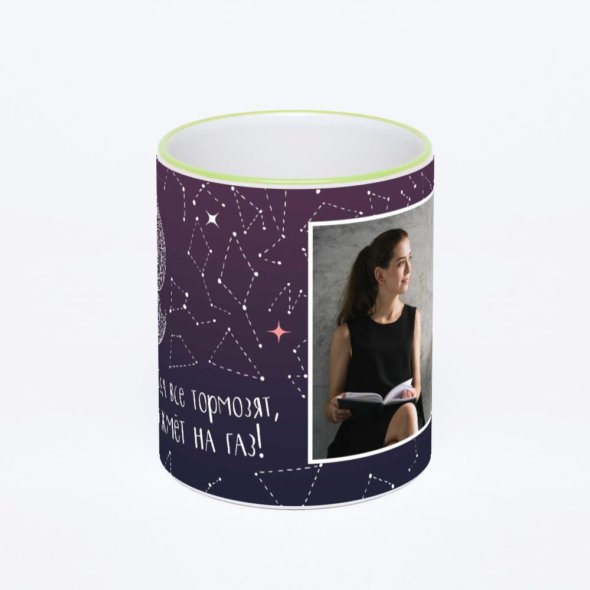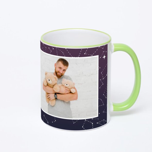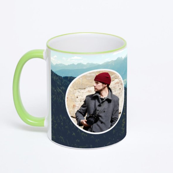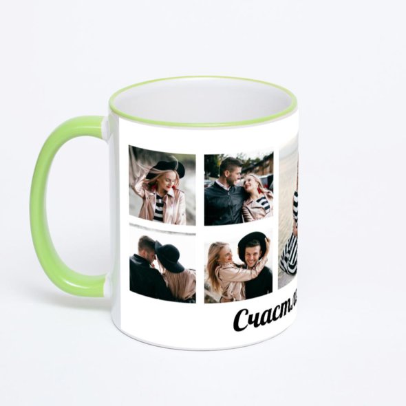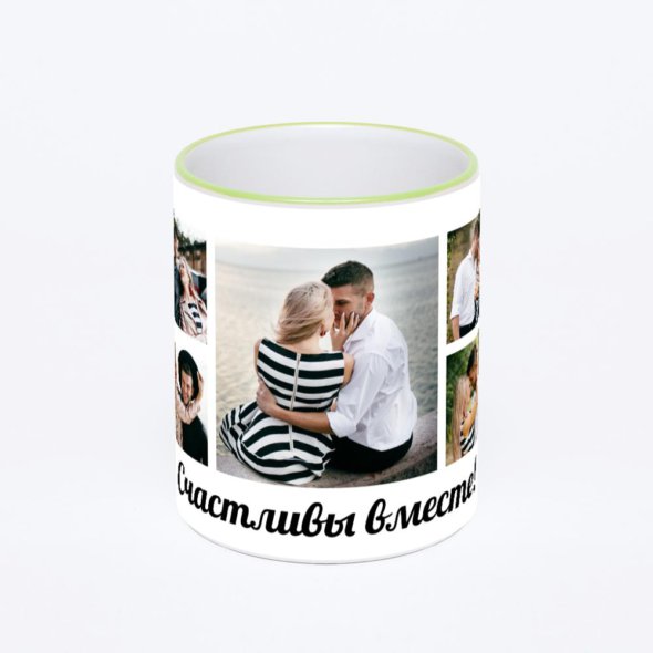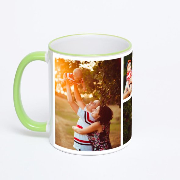 Керамическая кружка с салатовой ручкой и ободком с нанесением изображения. Кружка с вашим изображением – это уникальный и качественный подарок. Создать её вы можете прямо сейчас в редакторе, добавляя фотографии, стикеры и надписи.